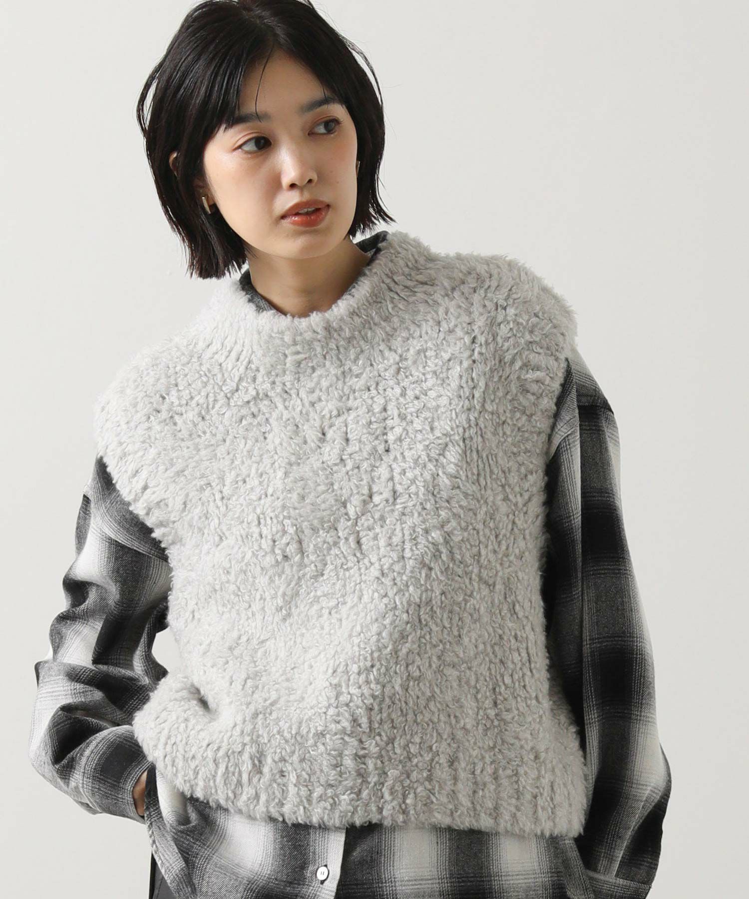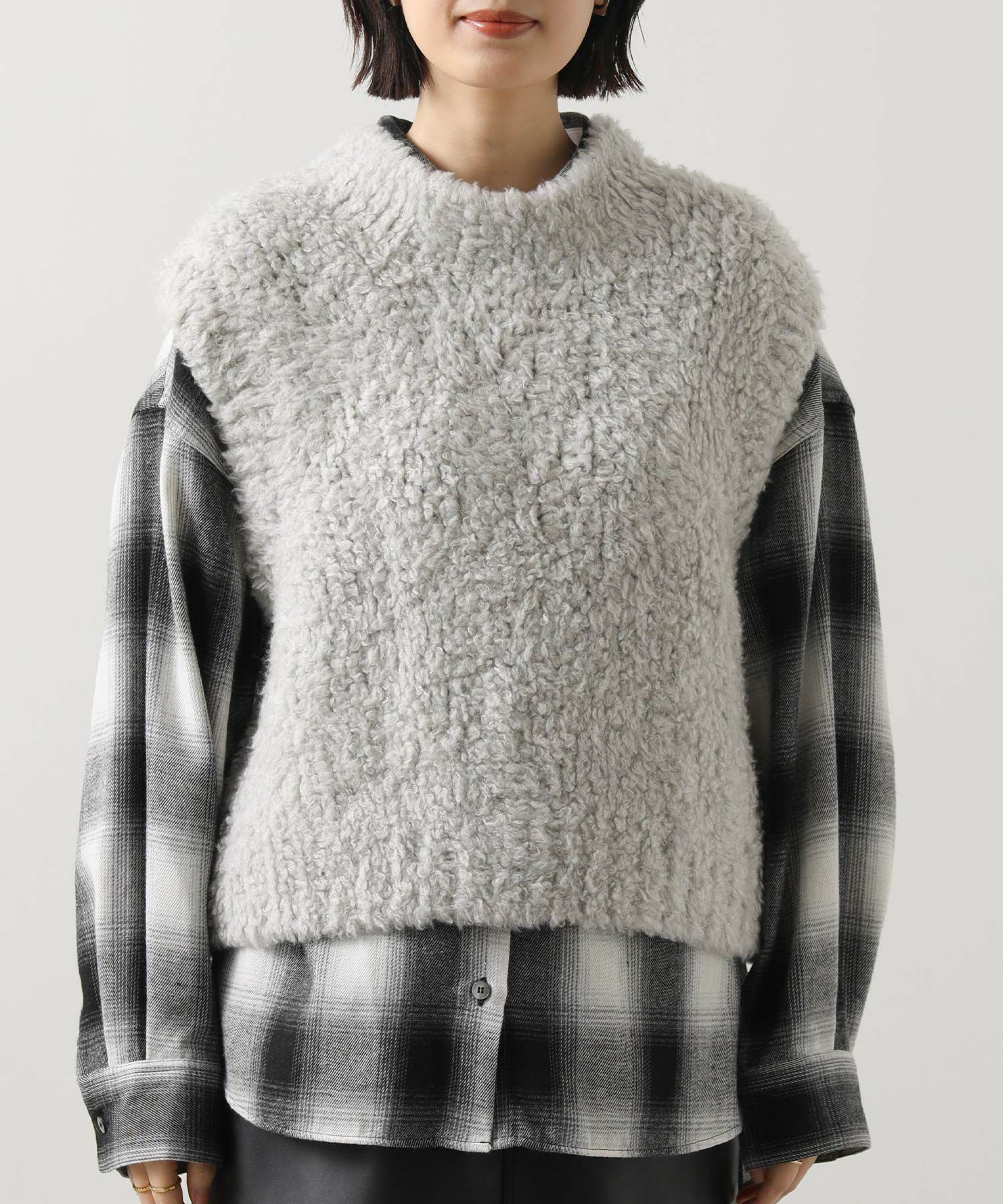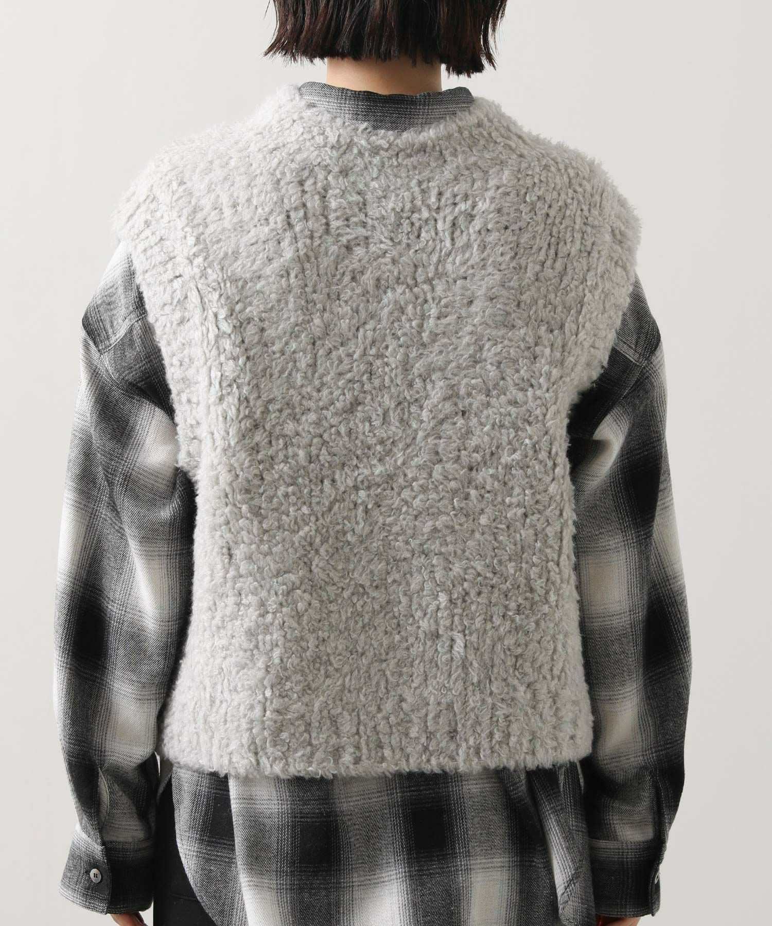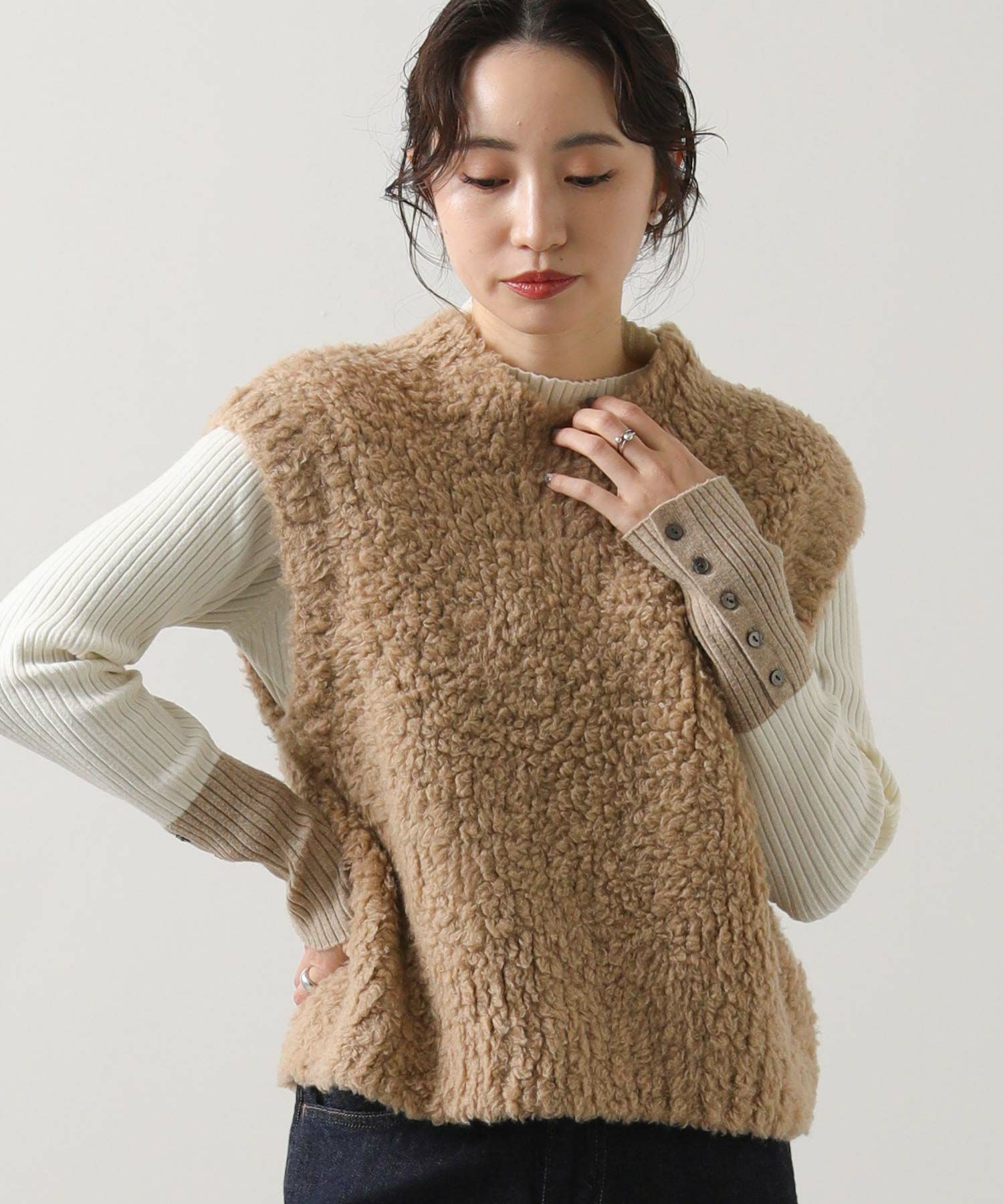 カシミヤ高混率のループヤーンを使用したラグジュアリーなニットベスト。