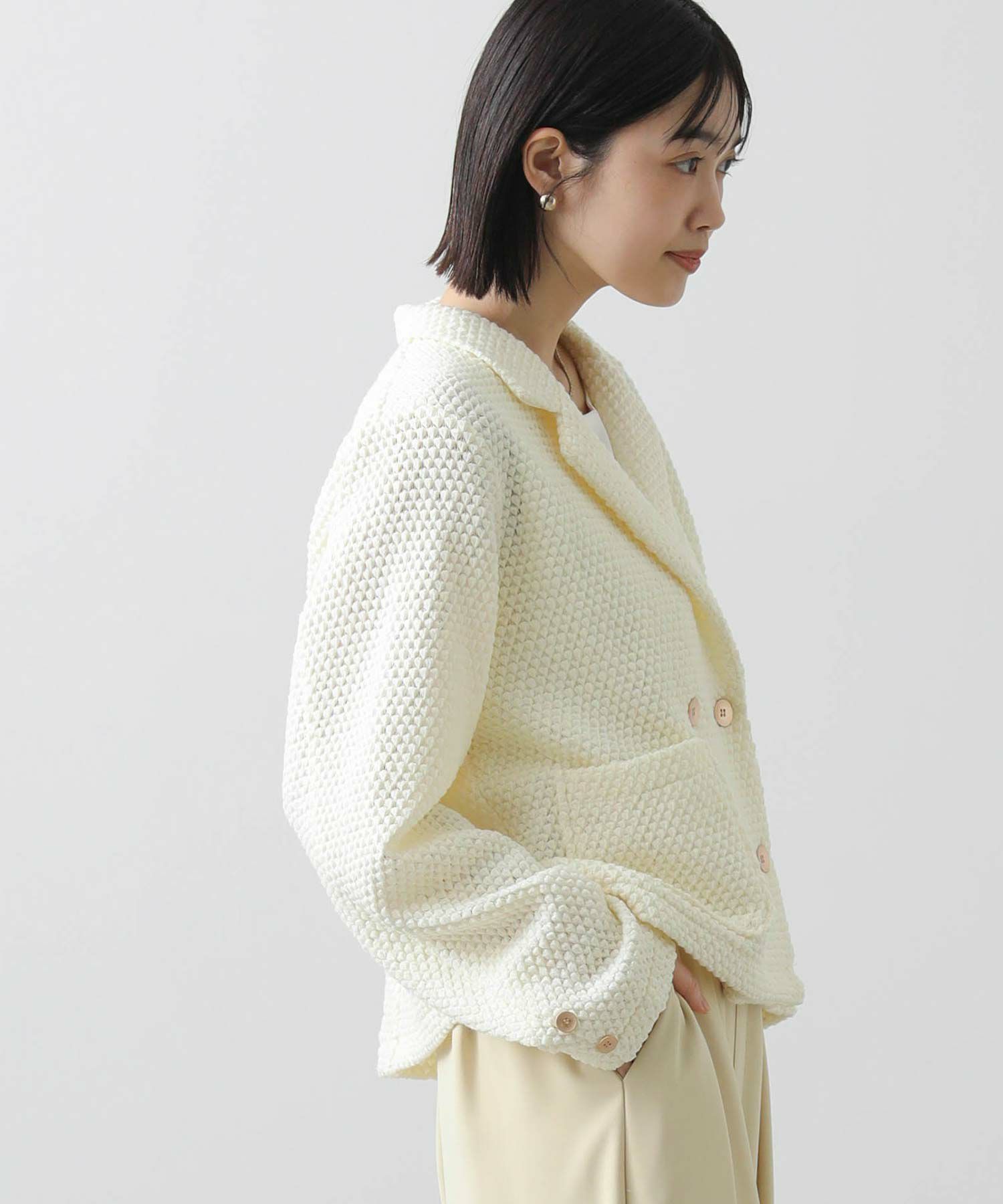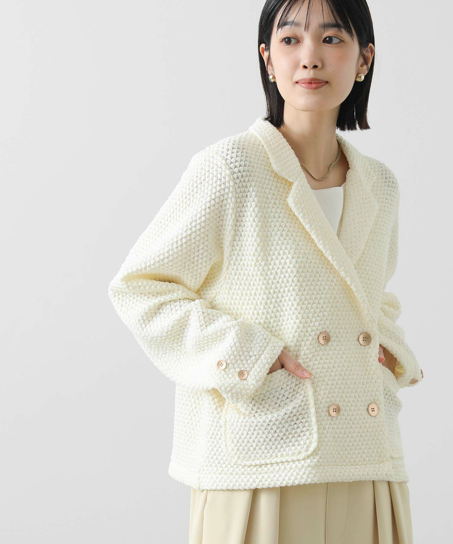 立体感ある生地がしなやかで軽く、着やすい一着です。ダブルボタンの短丈ジャケットでお出かけやオケージョンなどの上品な着こなしから、デニムやジョガーパンツなどのカジュアルなコーデまで、雰囲気を変えながらもしっくりくるとても使えるジャケットです。