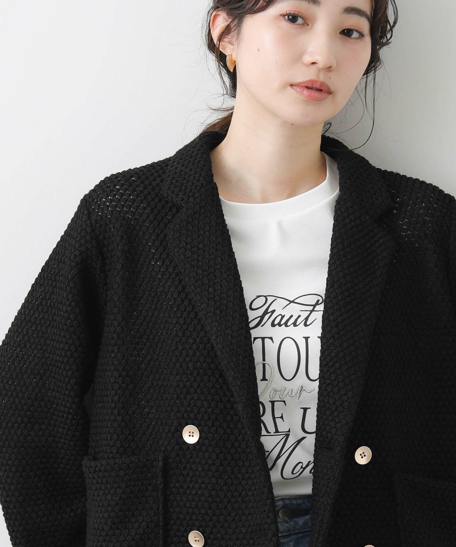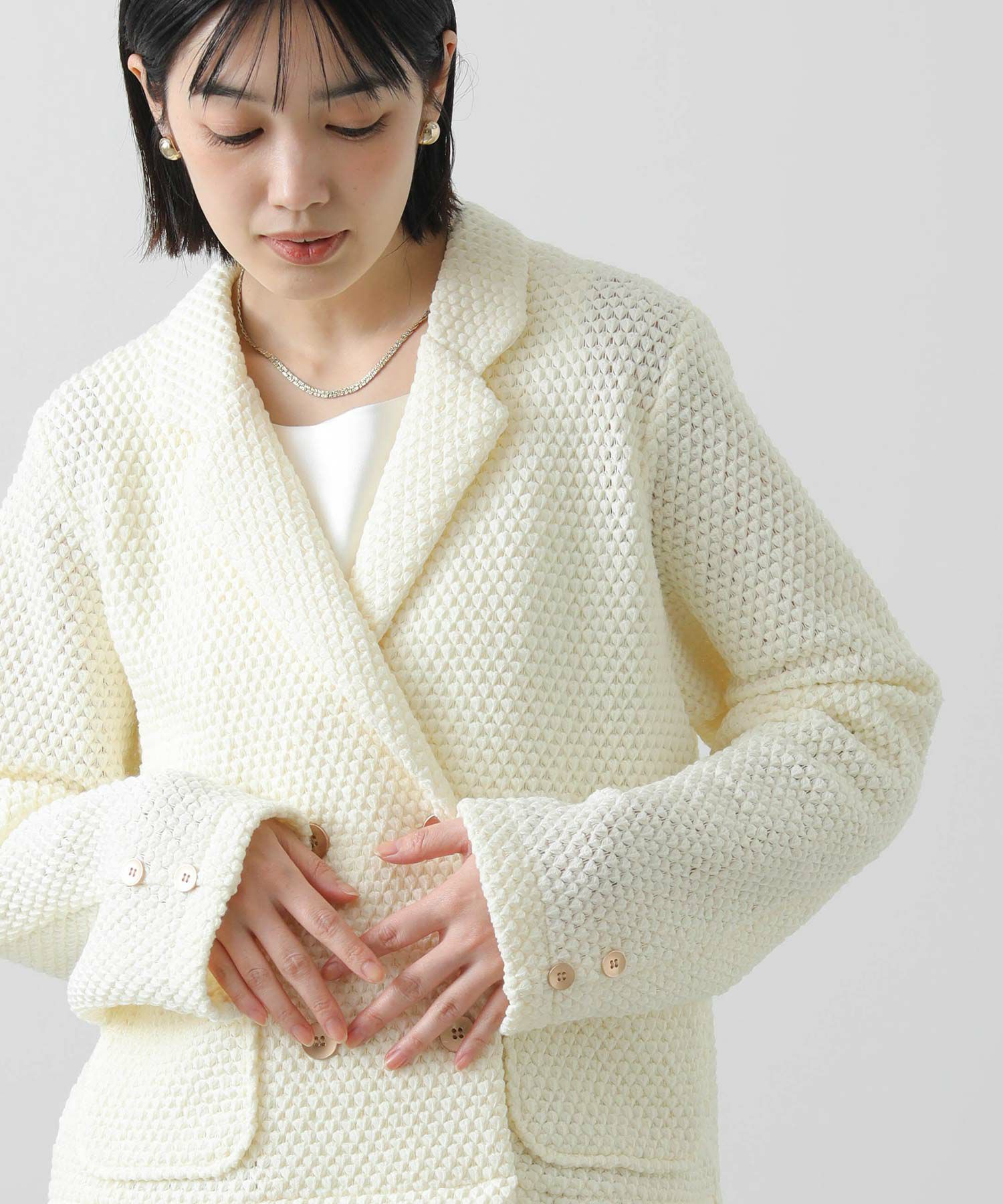 【CYAN tokyo(シアントーキョー)】から、ワッフル編みされたクロッシェレースのテーラードジャケットをセレクト。