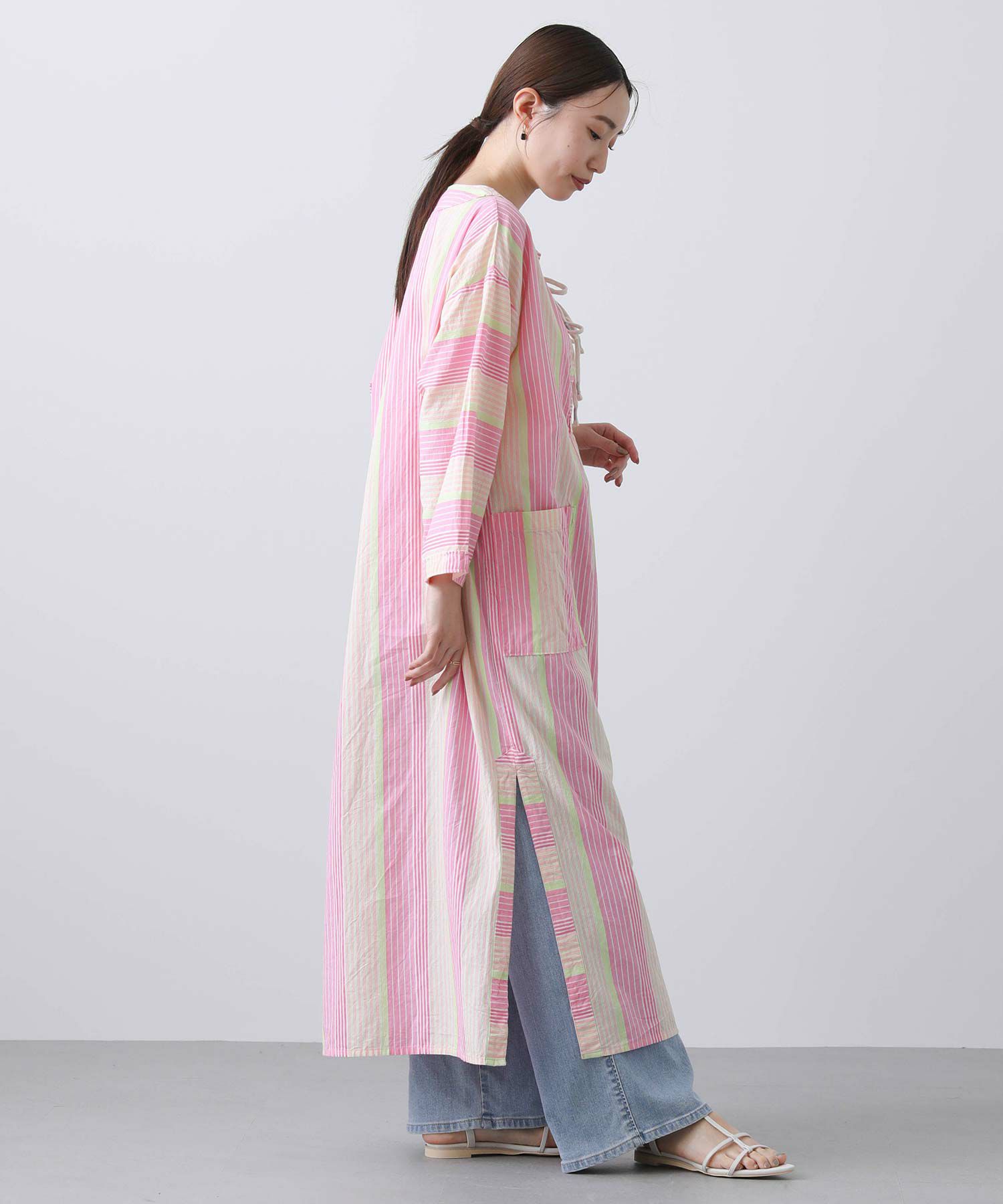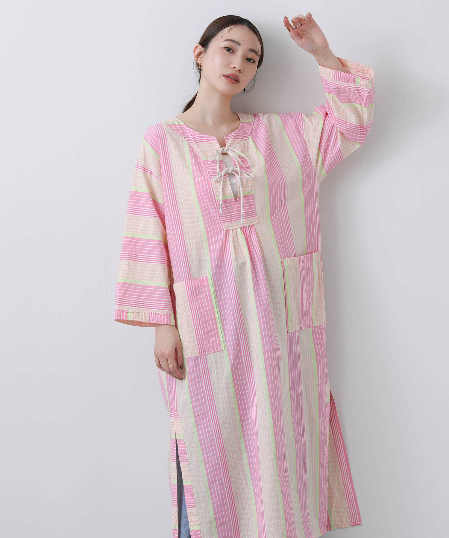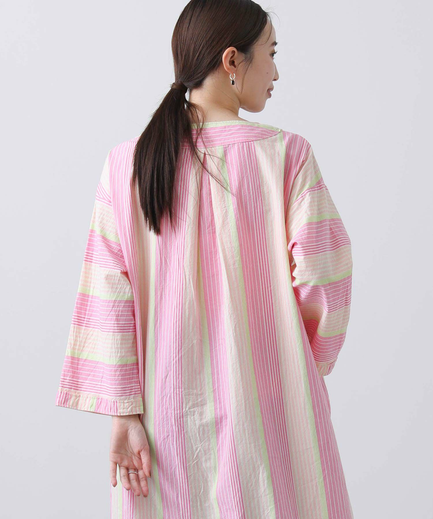 先染めストライプのロングワンピース。