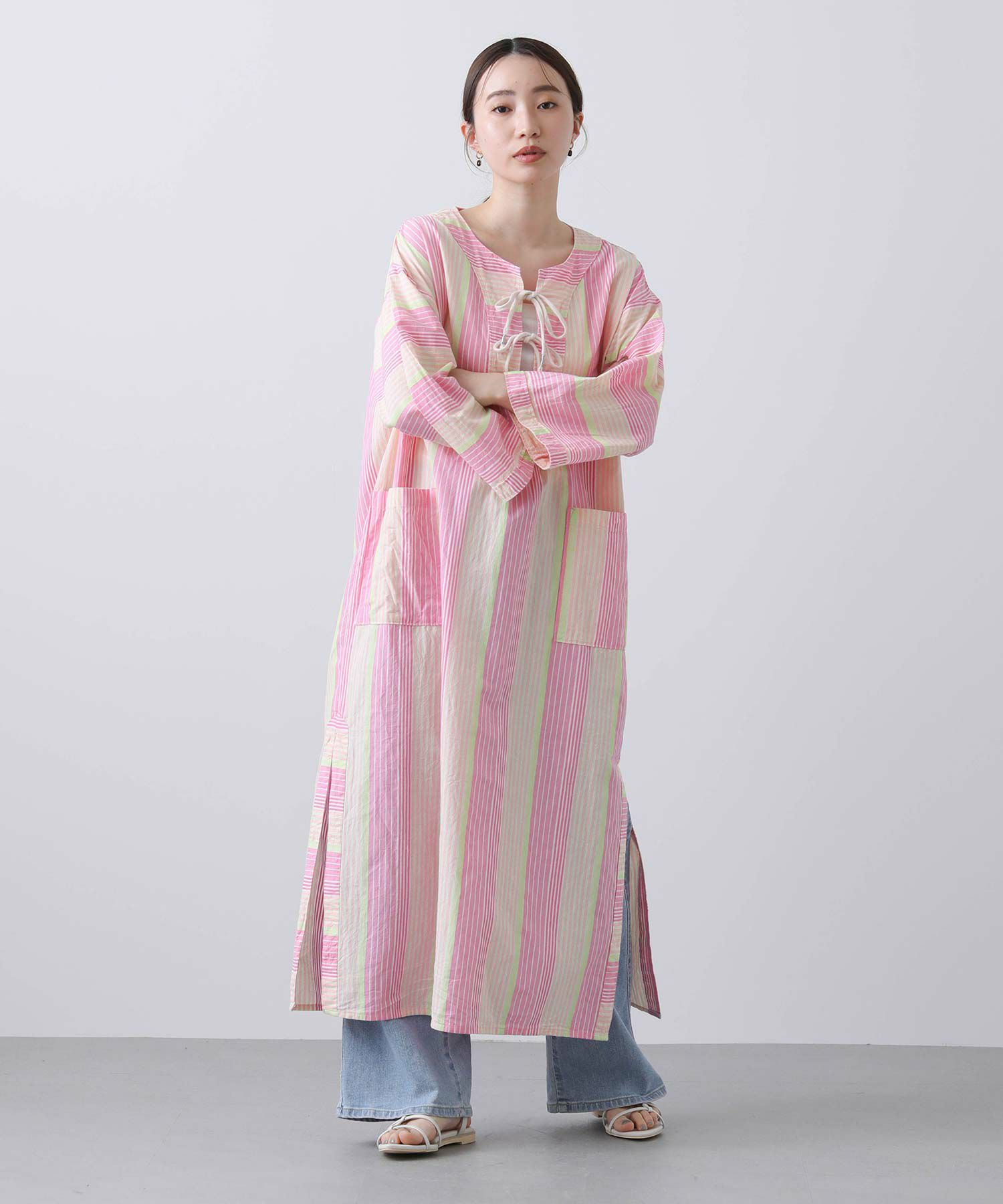 一枚でも存在感のあるワンピースで、ボトム合わせのスタイリングもおすすめです。