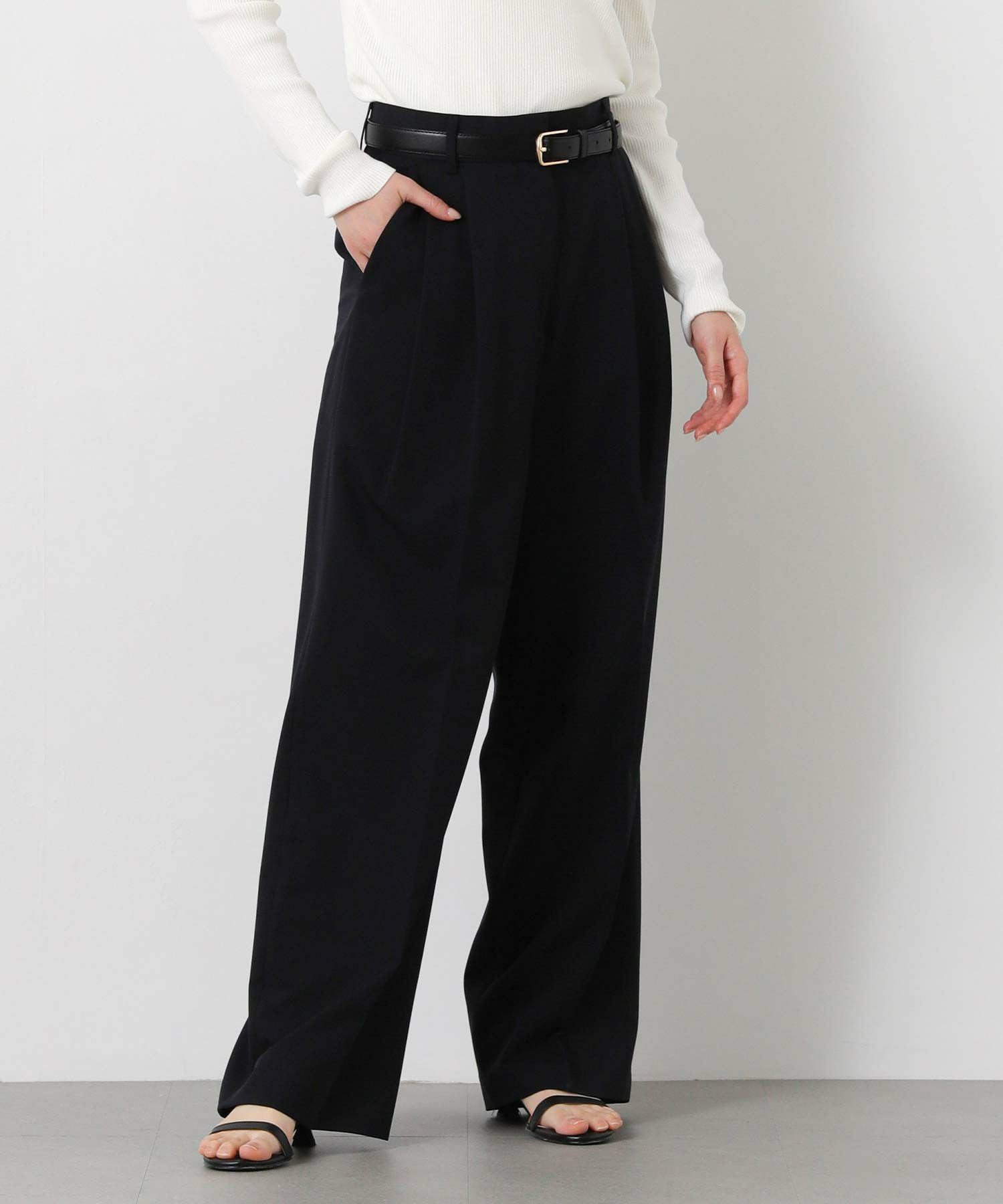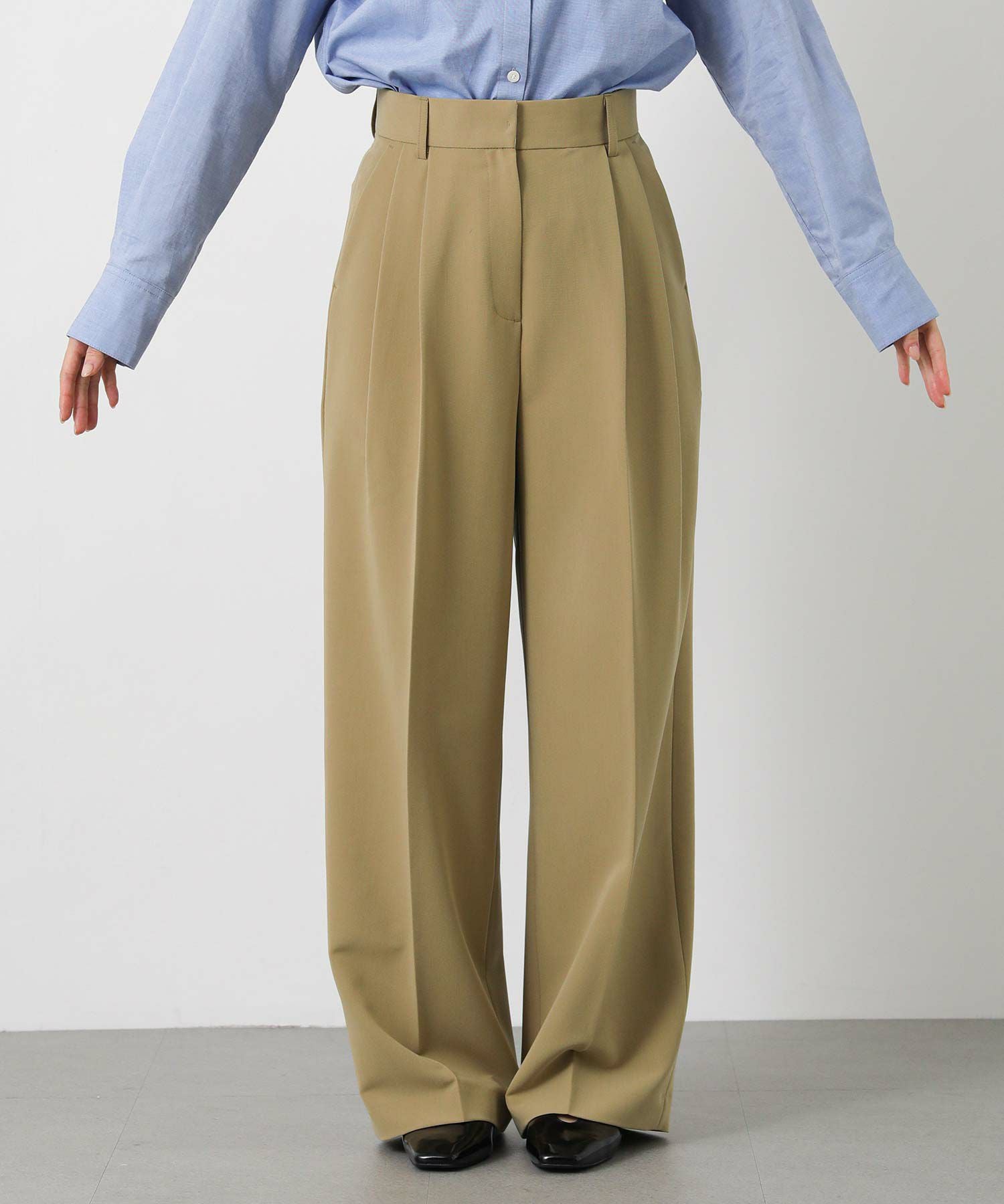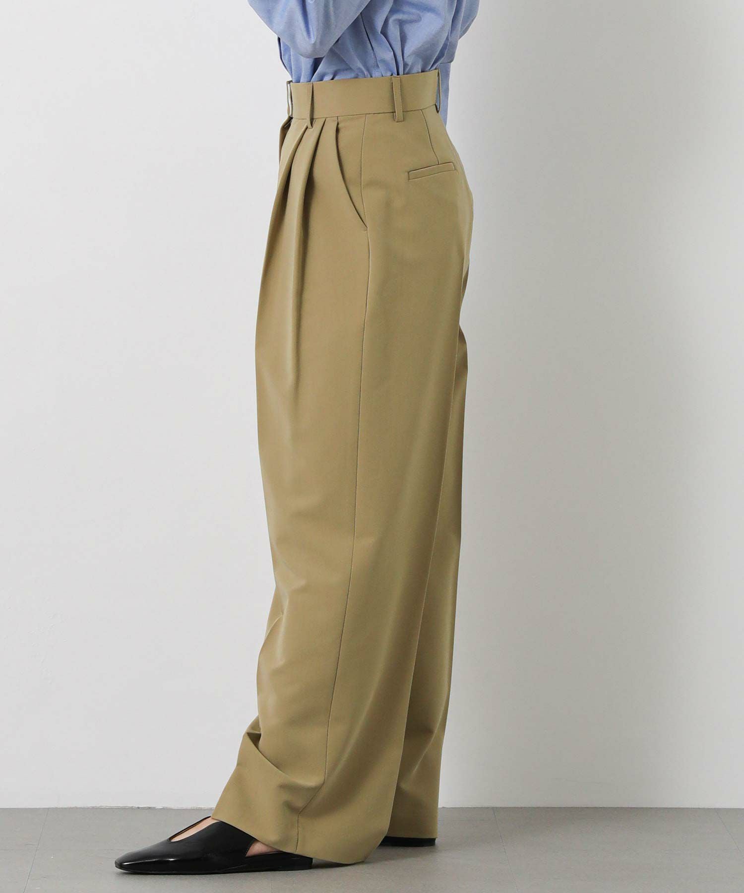 ジャストウエスト設定で、ウエストをすっきりと見せてくれる2タックデザインと、脚のラインを拾いすぎないストレートシルエットに拘った1本。