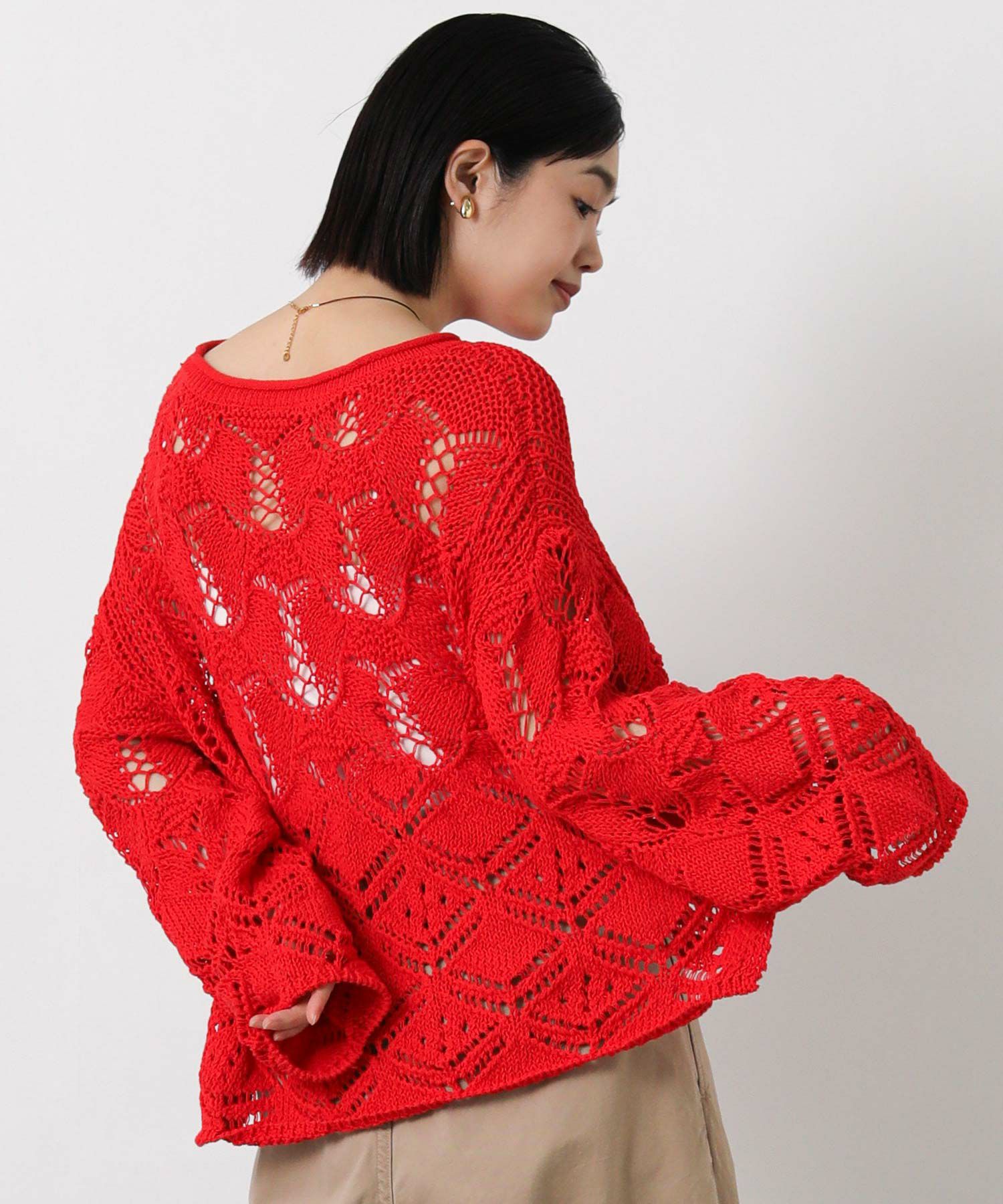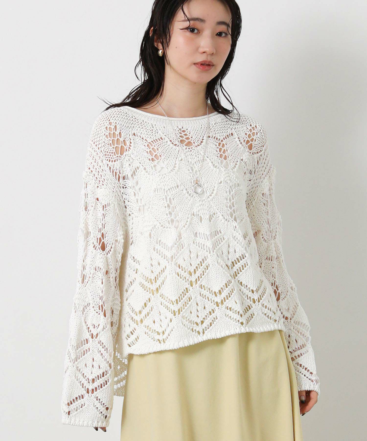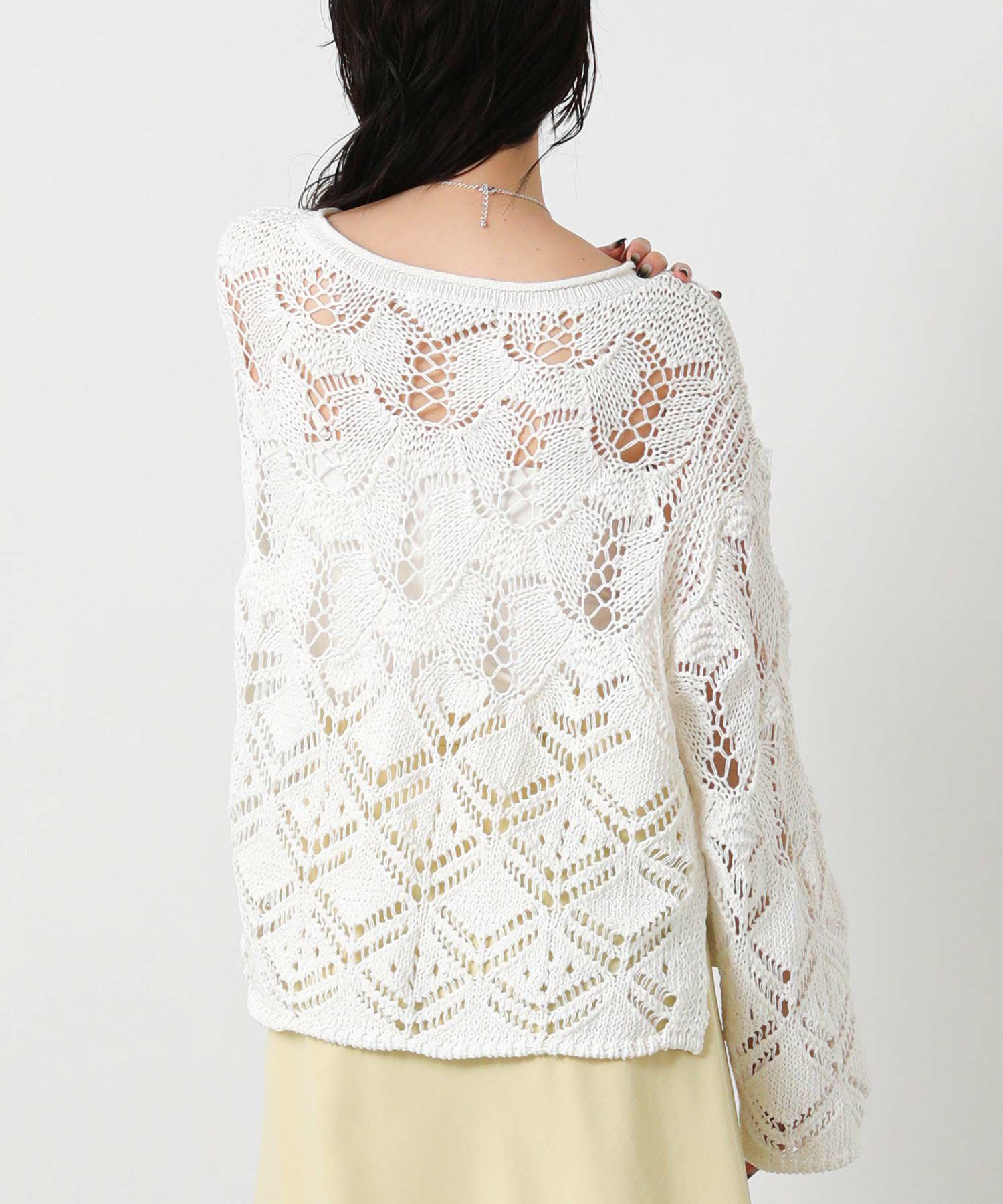 透かし柄が軽やかな印象のニットプルオーバー。