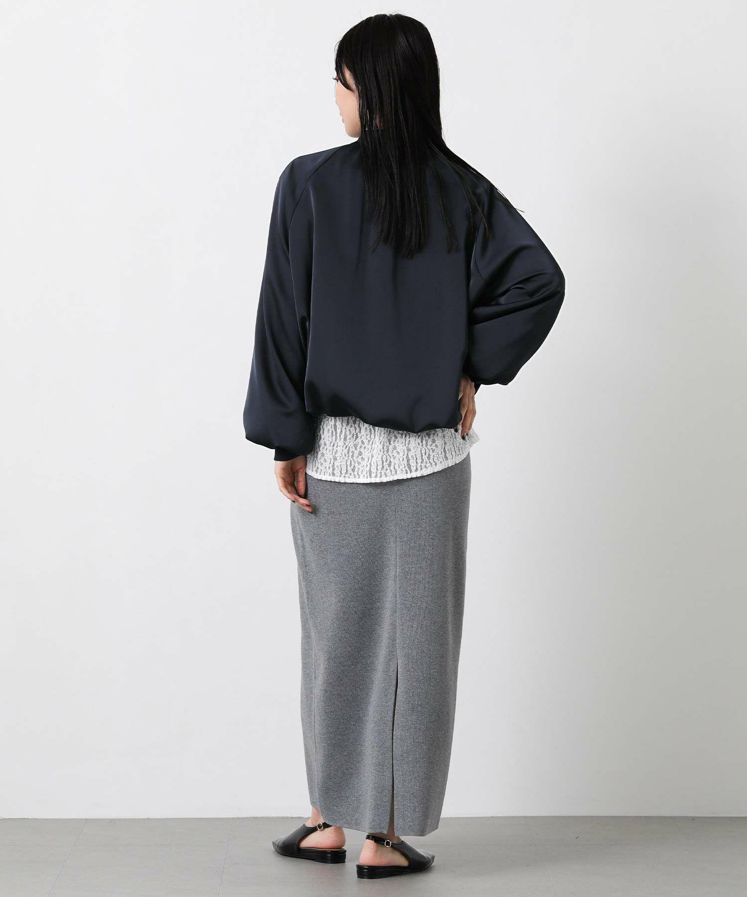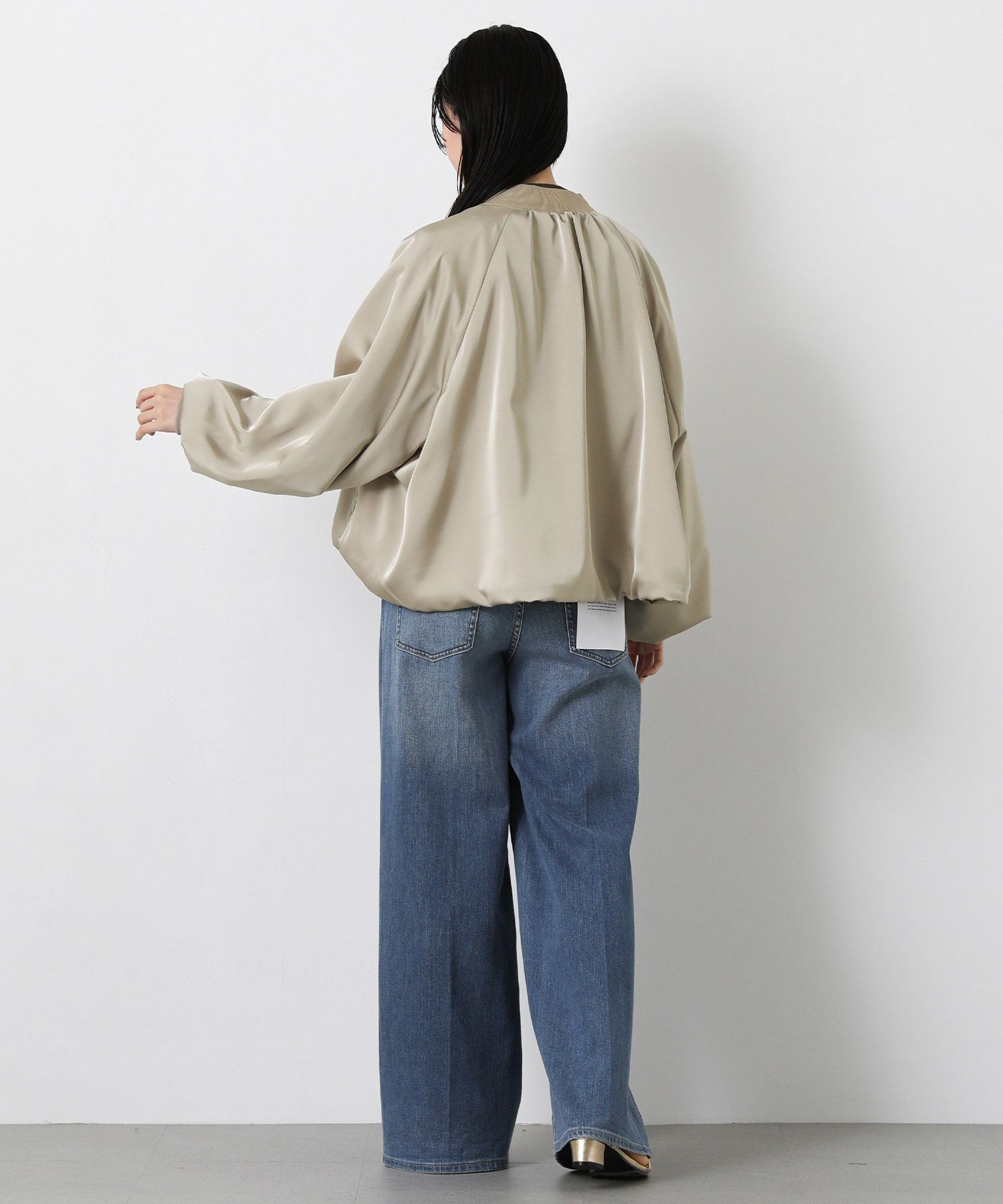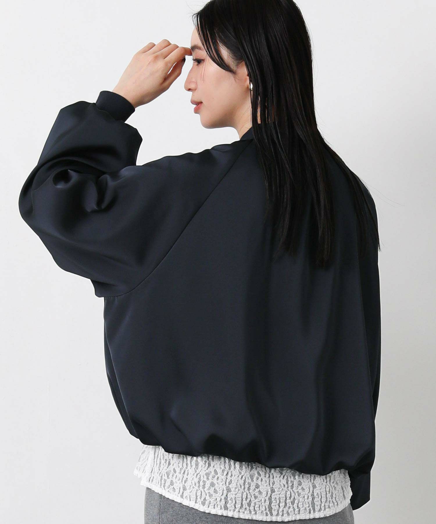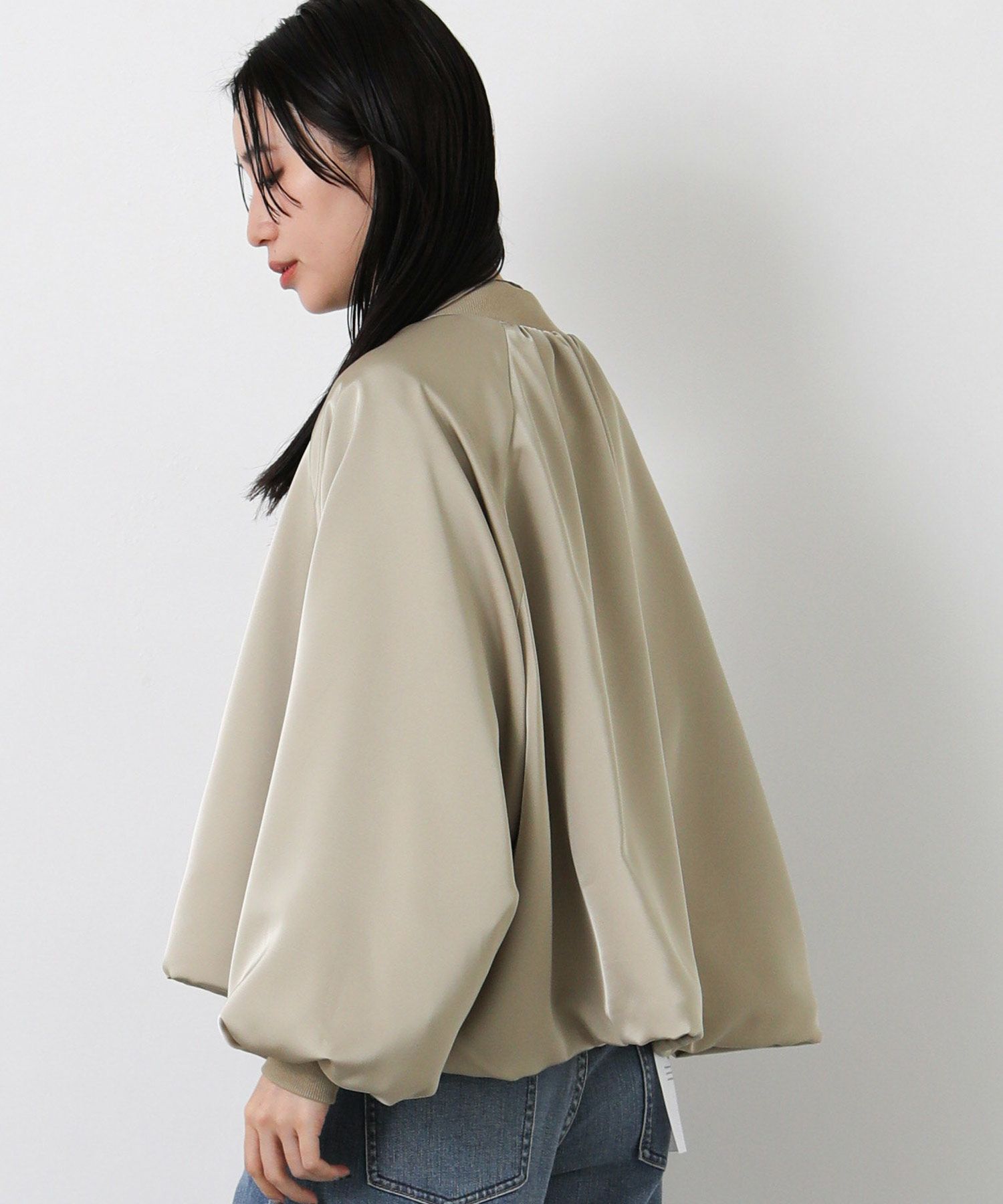 なめらかな微光沢感が美しいサテン素材を使用したブルゾン。