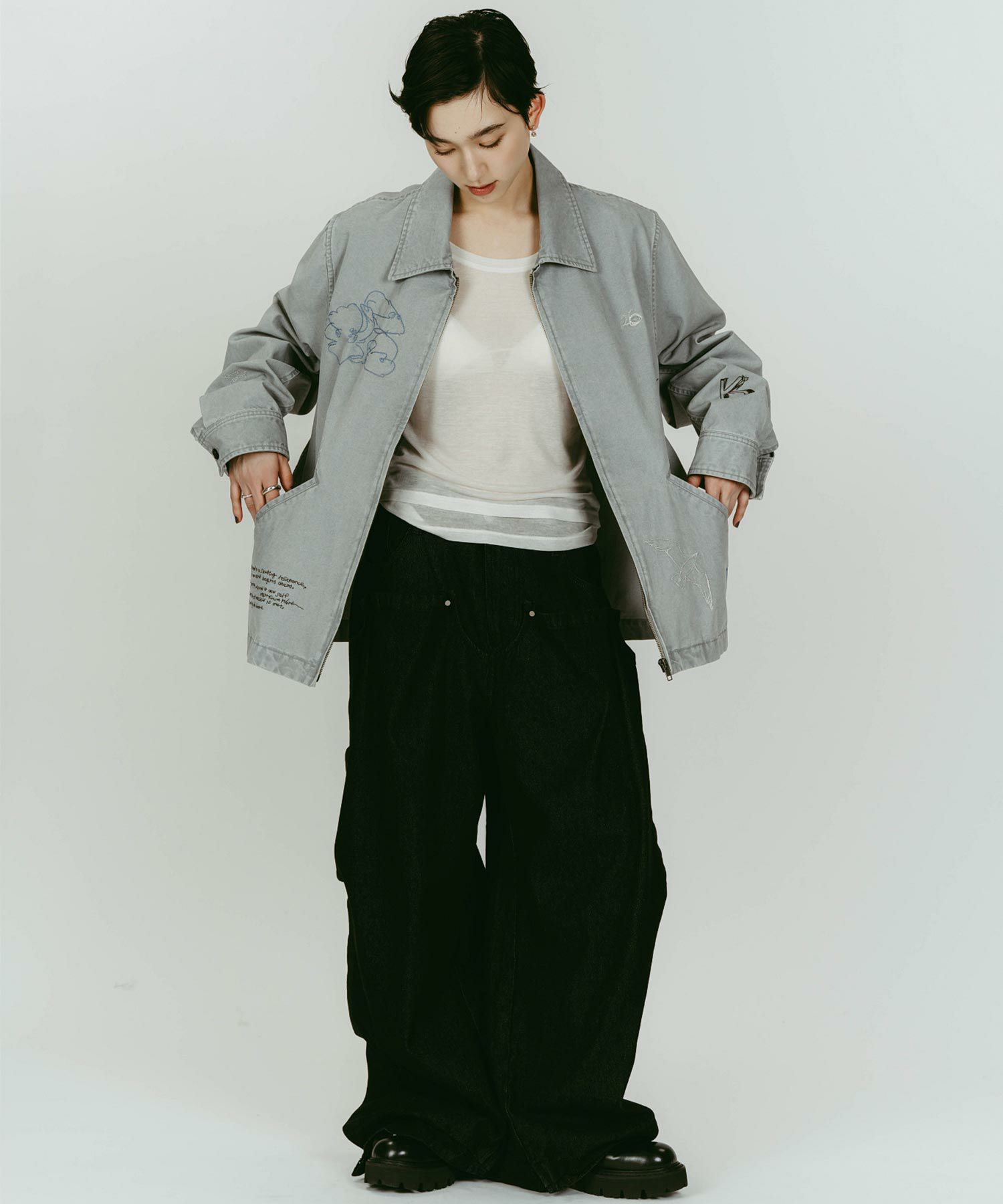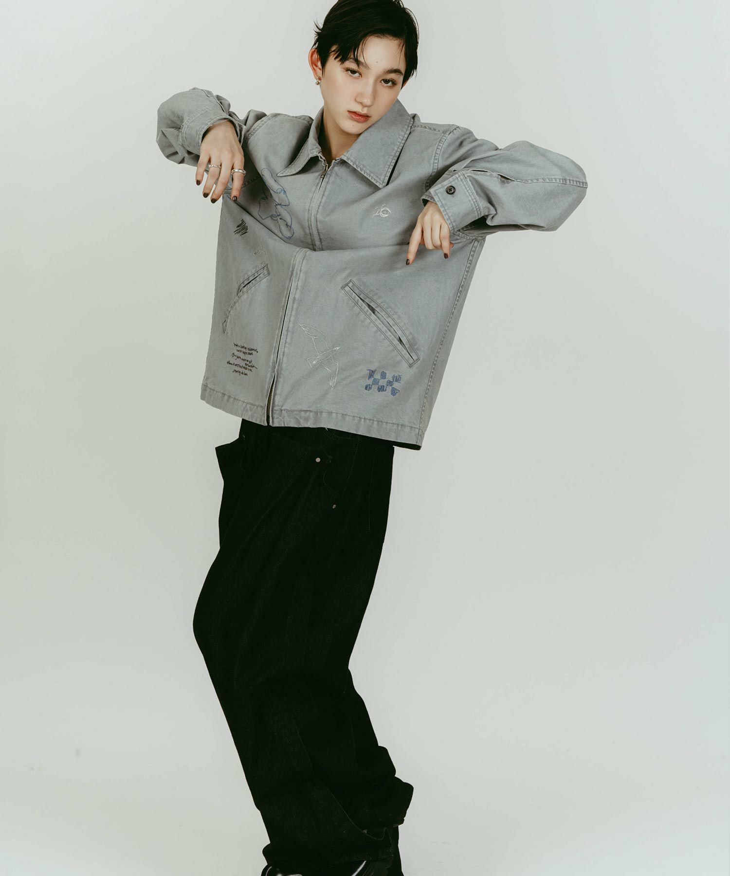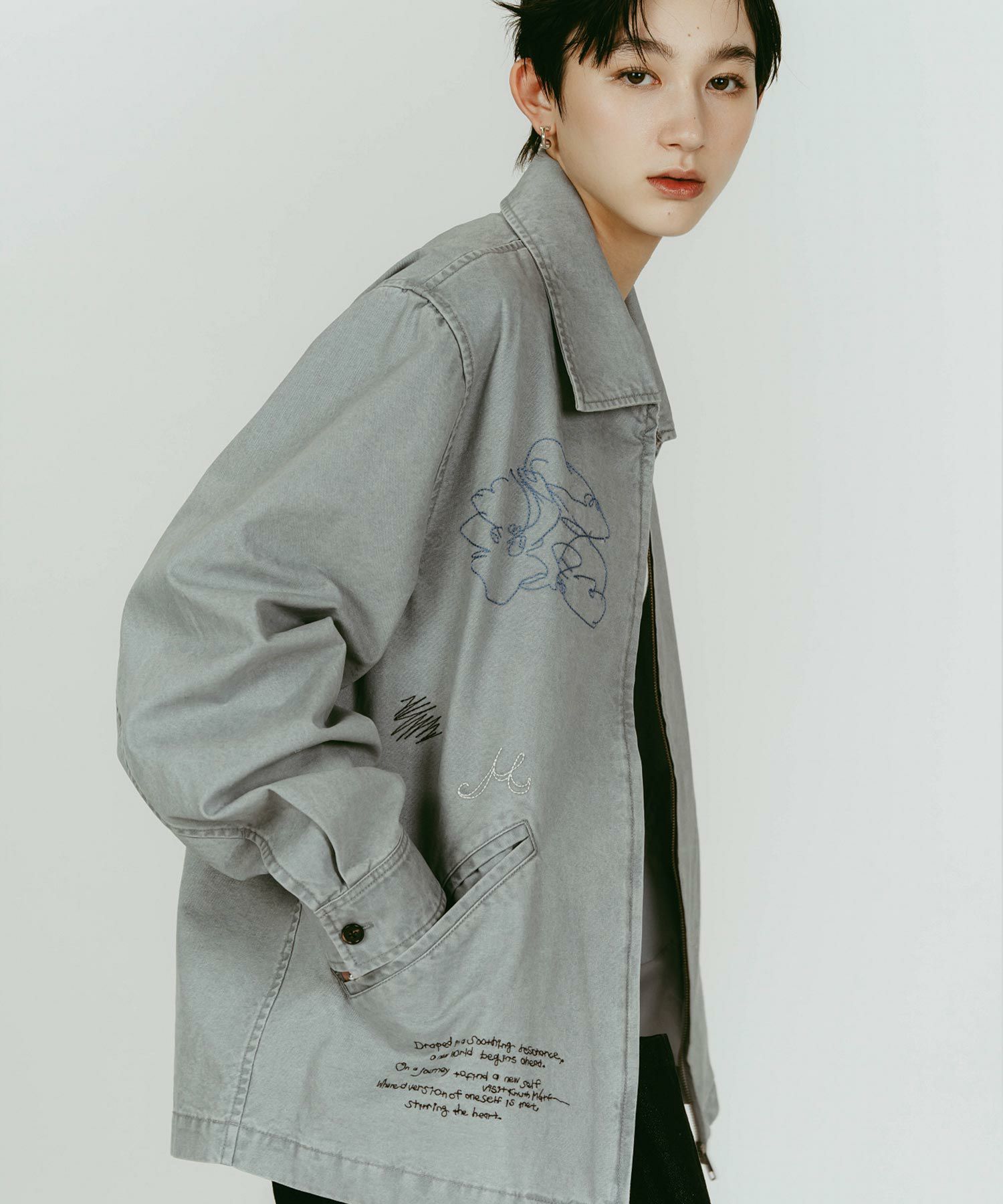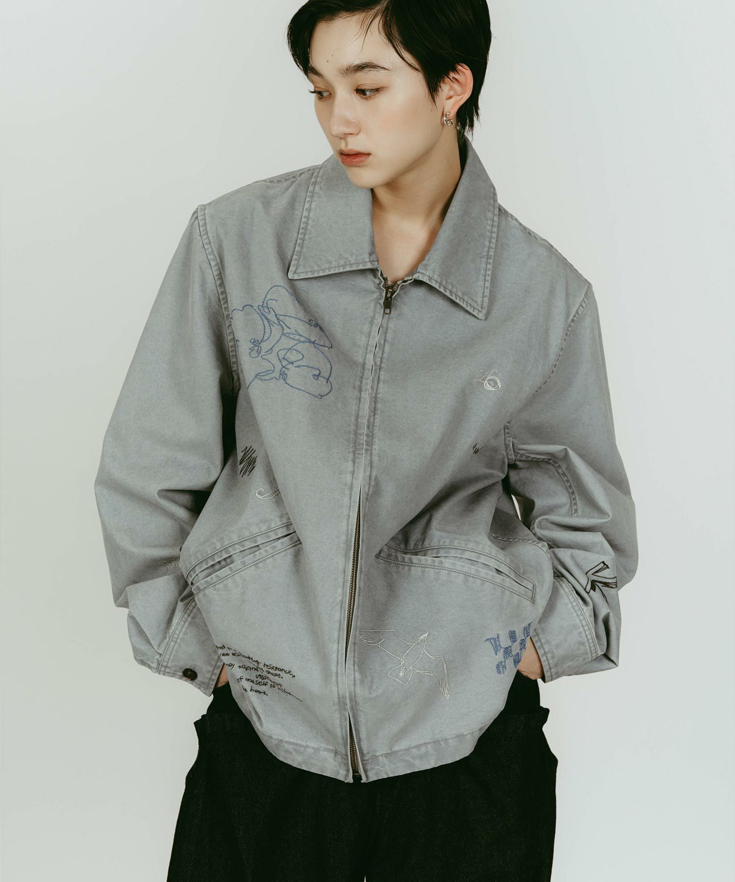 軽やかなライトジャケットに、落書きのように施された丁寧な刺繍が目を惹きます。