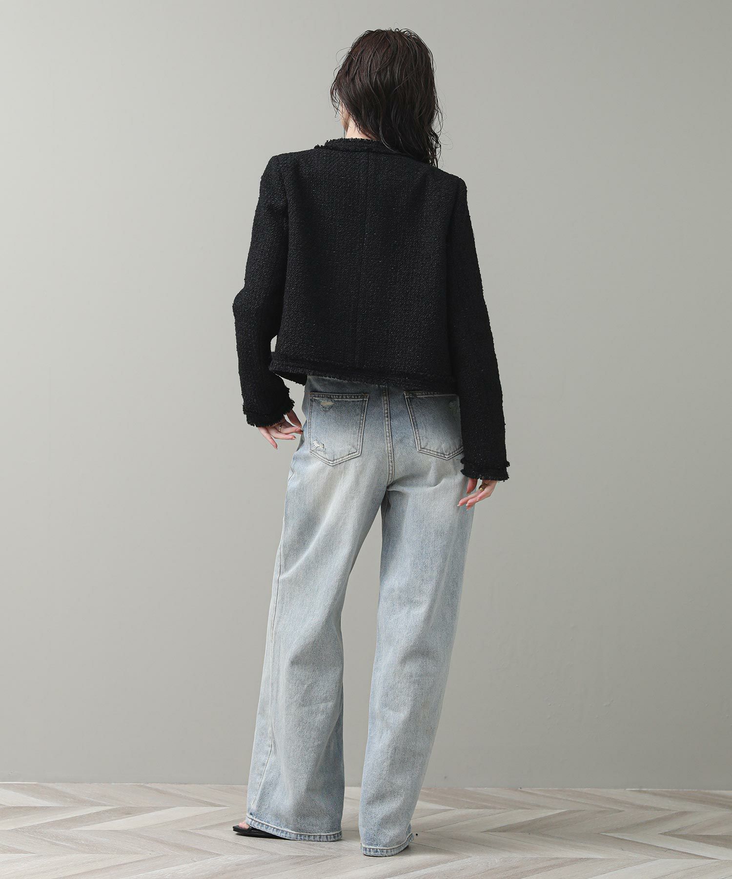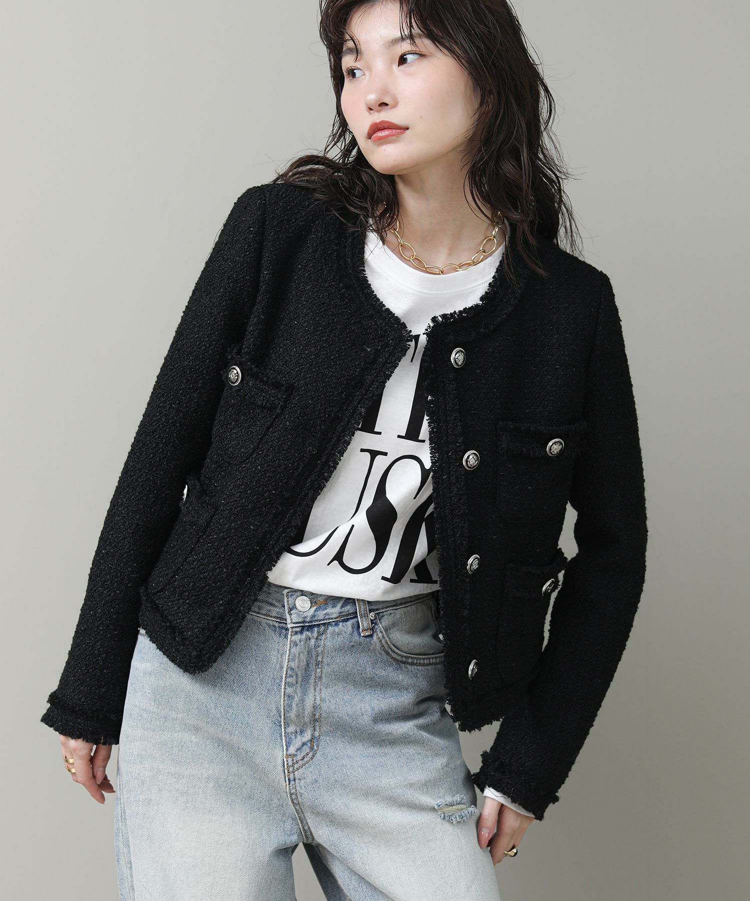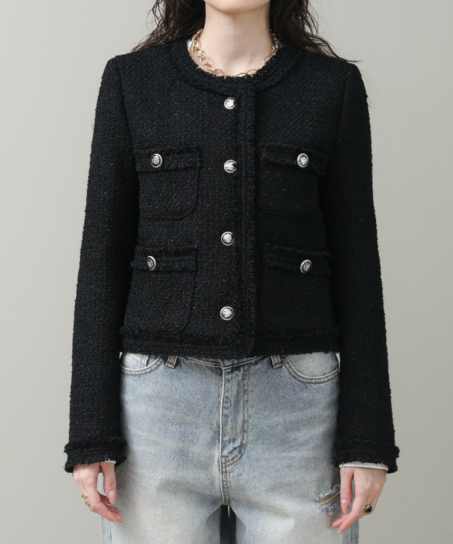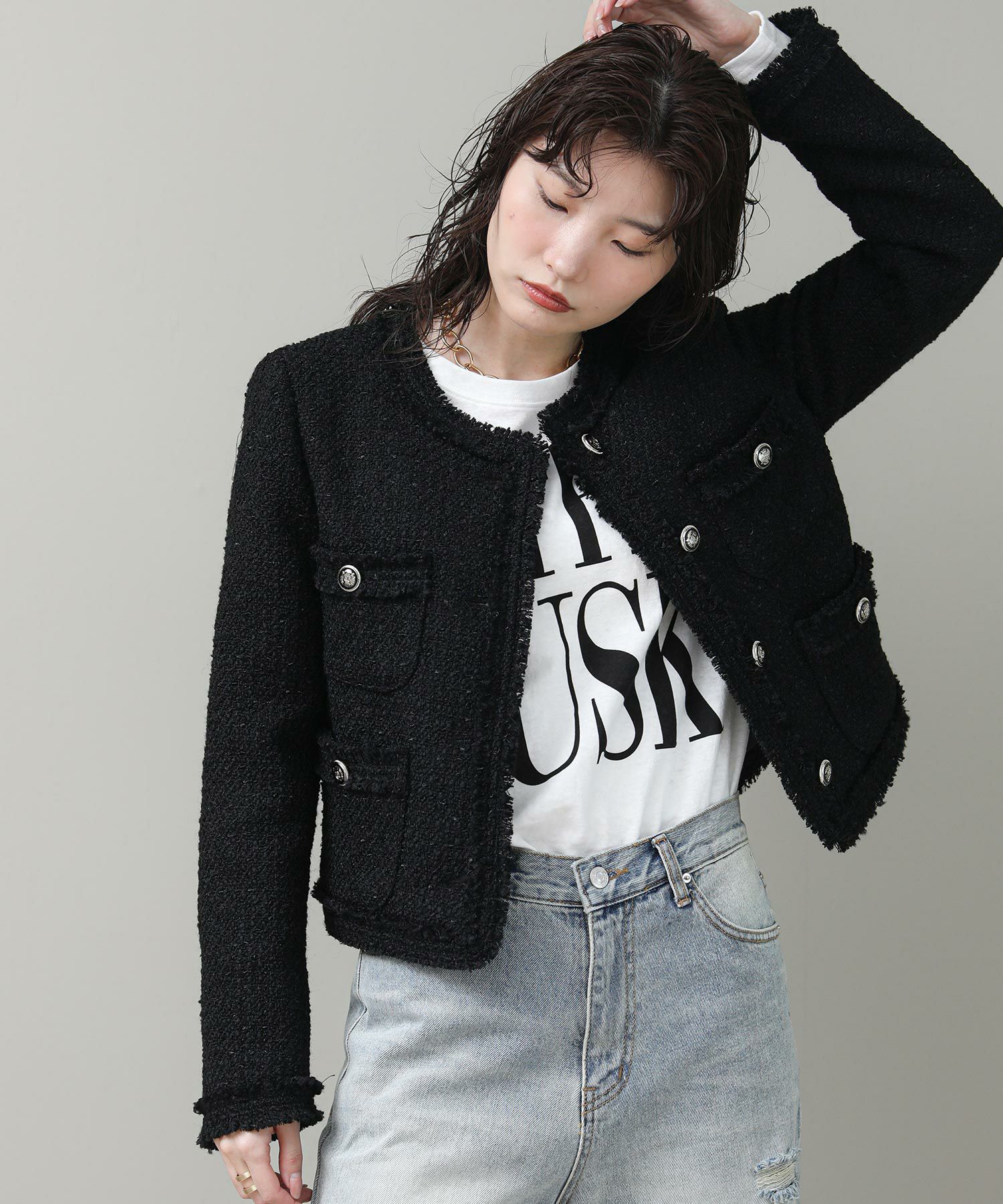 コンパクトなシルエットとブラックのシックな表情がリジョイスらしいアイテムです。普段使いならダメージデニムなどカジュアルボトムとコントラストのあるスタイルがおすすめ。タンクやTシャツにさっと羽織るだけでサマになります。
