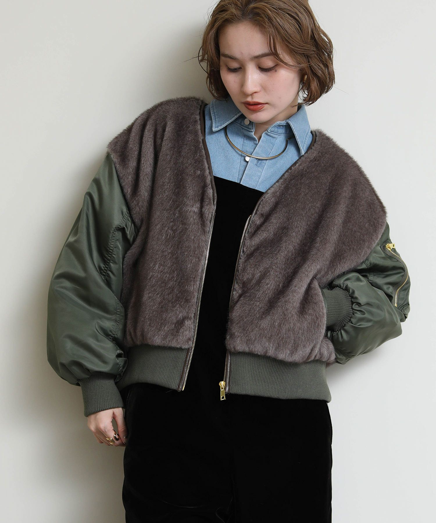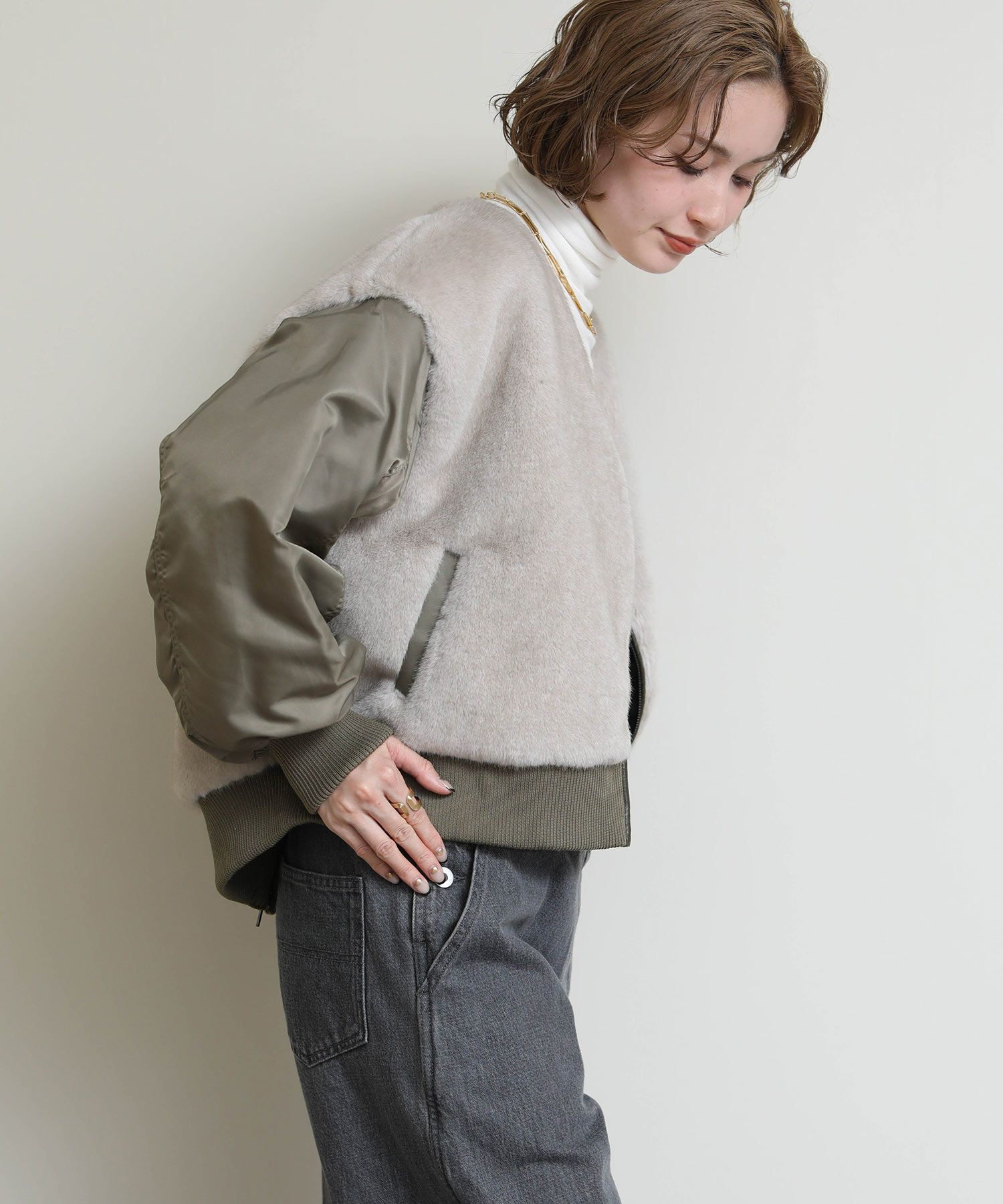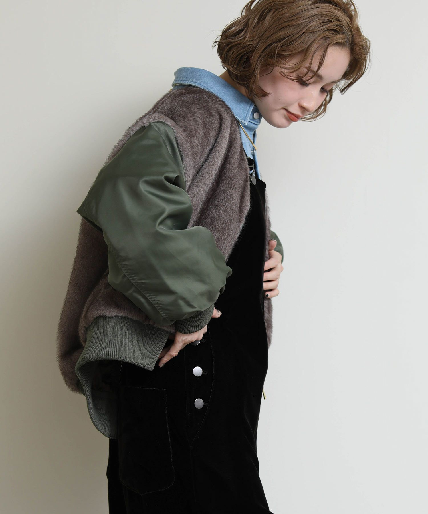 毛足のあるフェイクファーにナイロンやフェイクレザーをドッキングした異素材ミックスブルゾン。