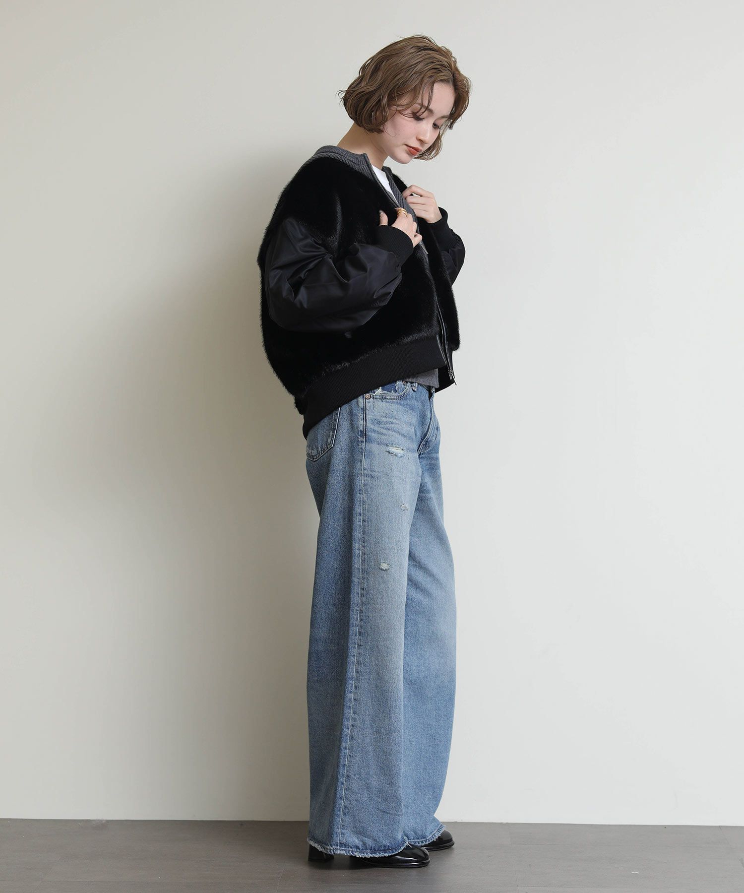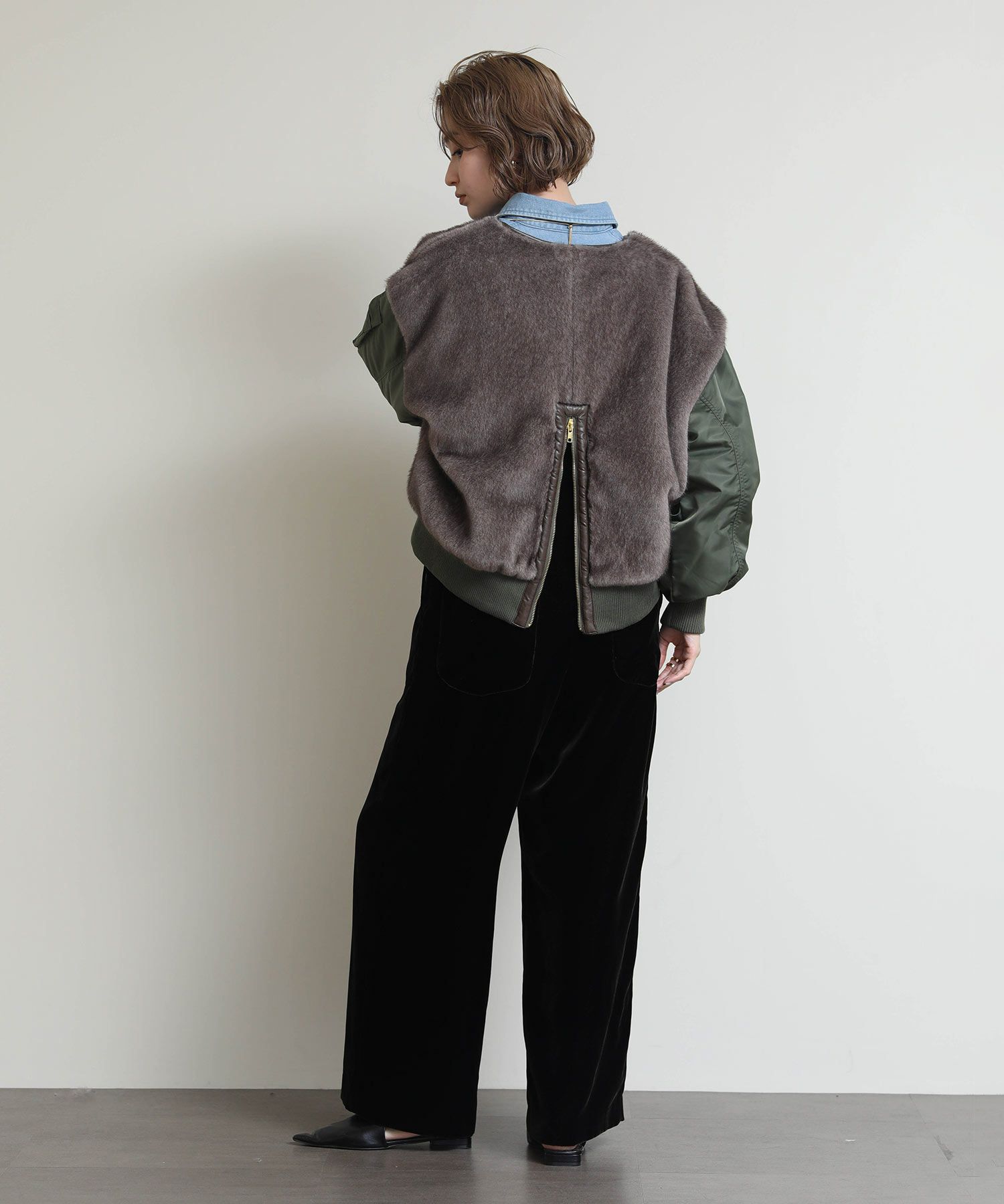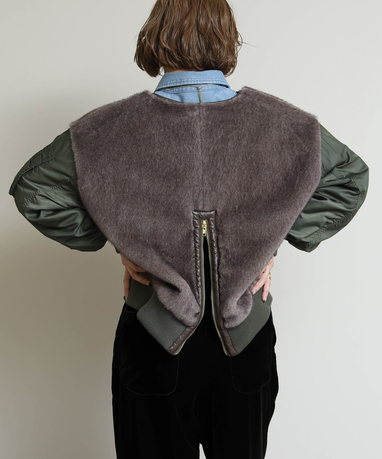 毛足のあるフェイクファーにナイロンやフェイクレザーをドッキングした異素材ミックスブルゾン。