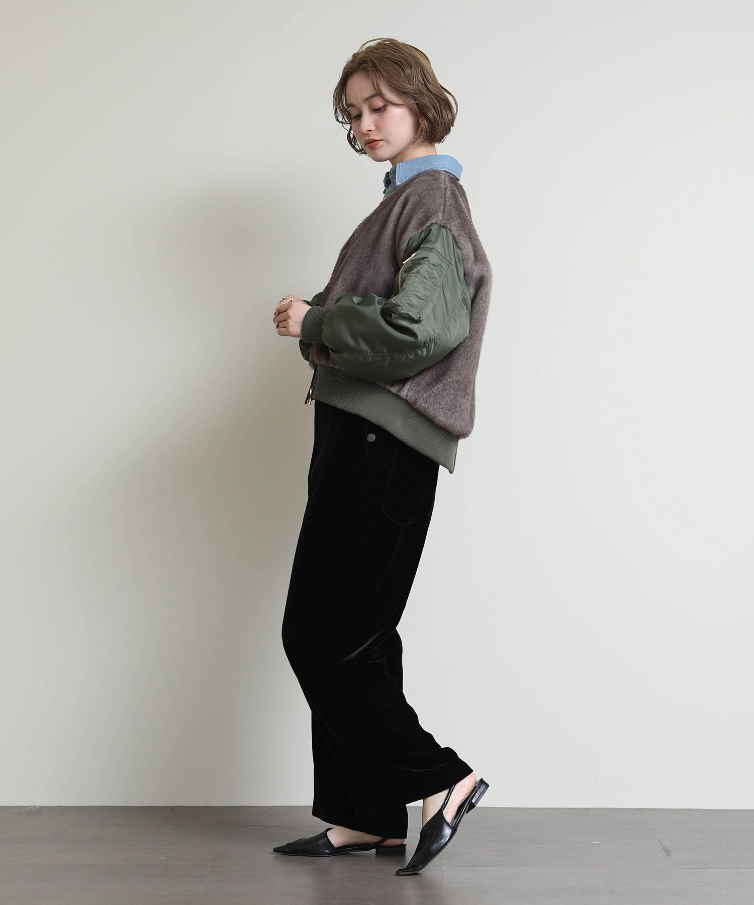 柔らかくリッチな質感に、MA-1風ポケットで程よいストリート感をプラス。ゆったりとしたサイズ感にショート丈のデザインでボトムとのバランスを取りやすいシルエットです。Vネックや背中のファスナーが抜け感を演出し、羽織るだけで洗練された大人のスタイルを叶えます。