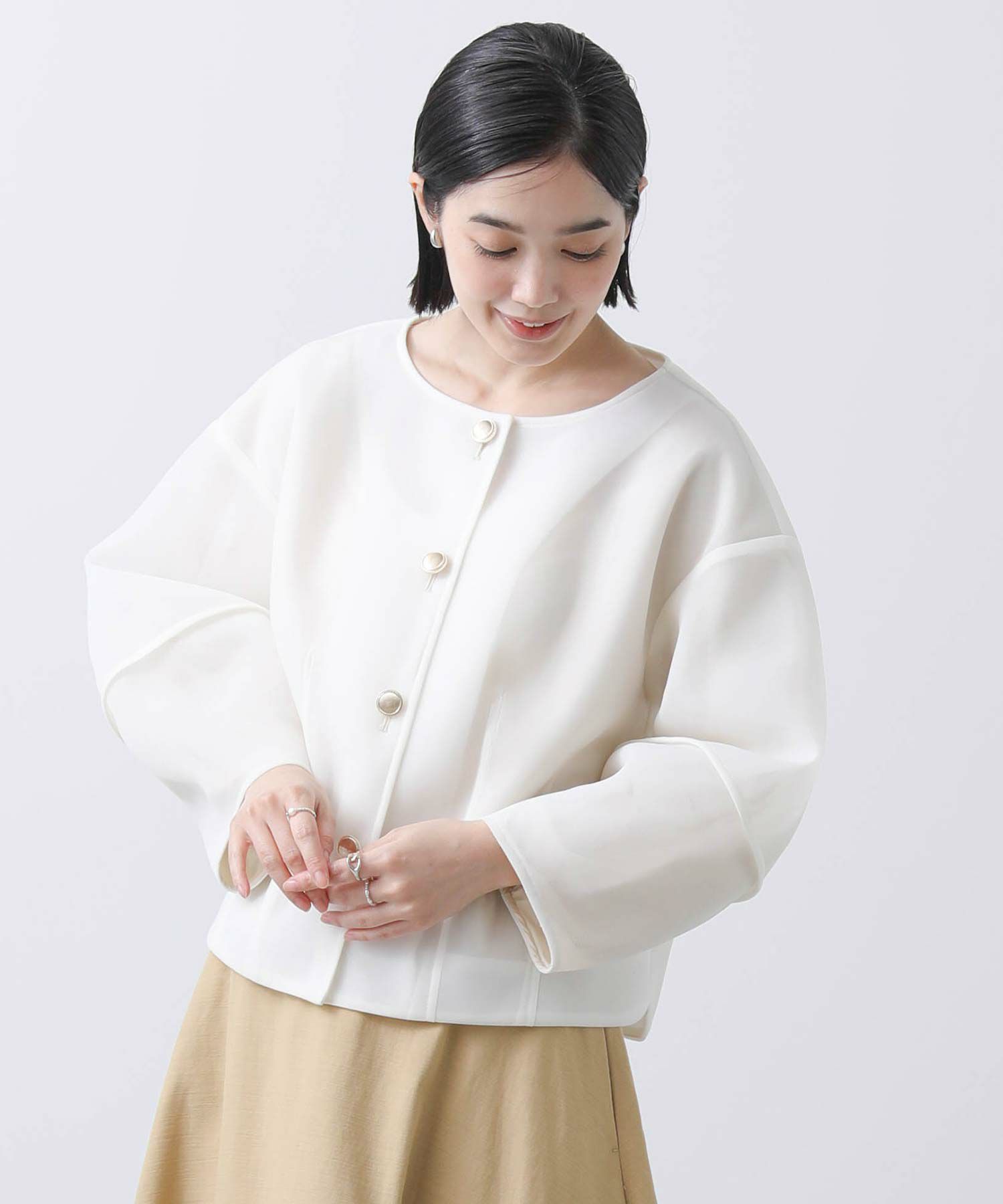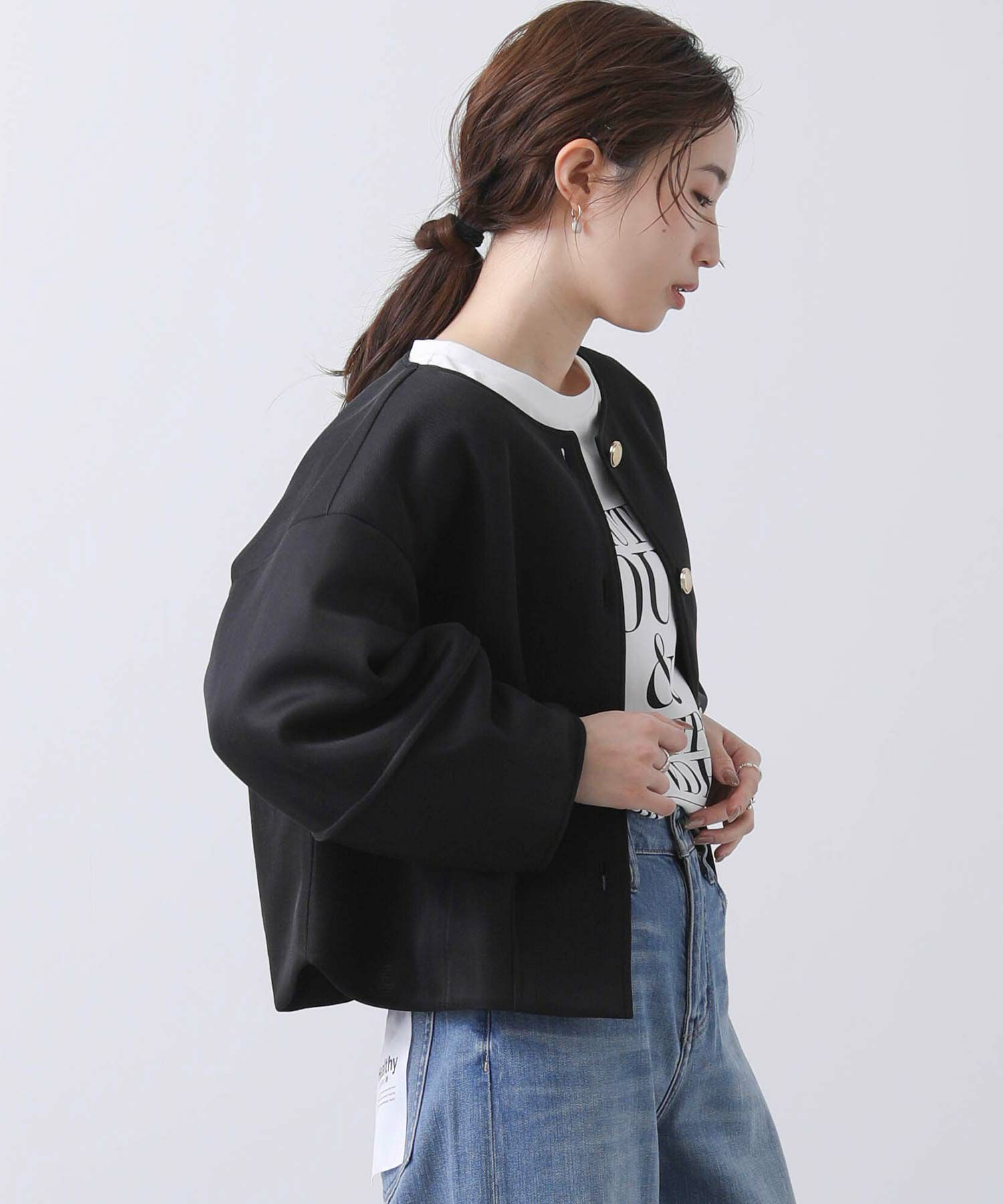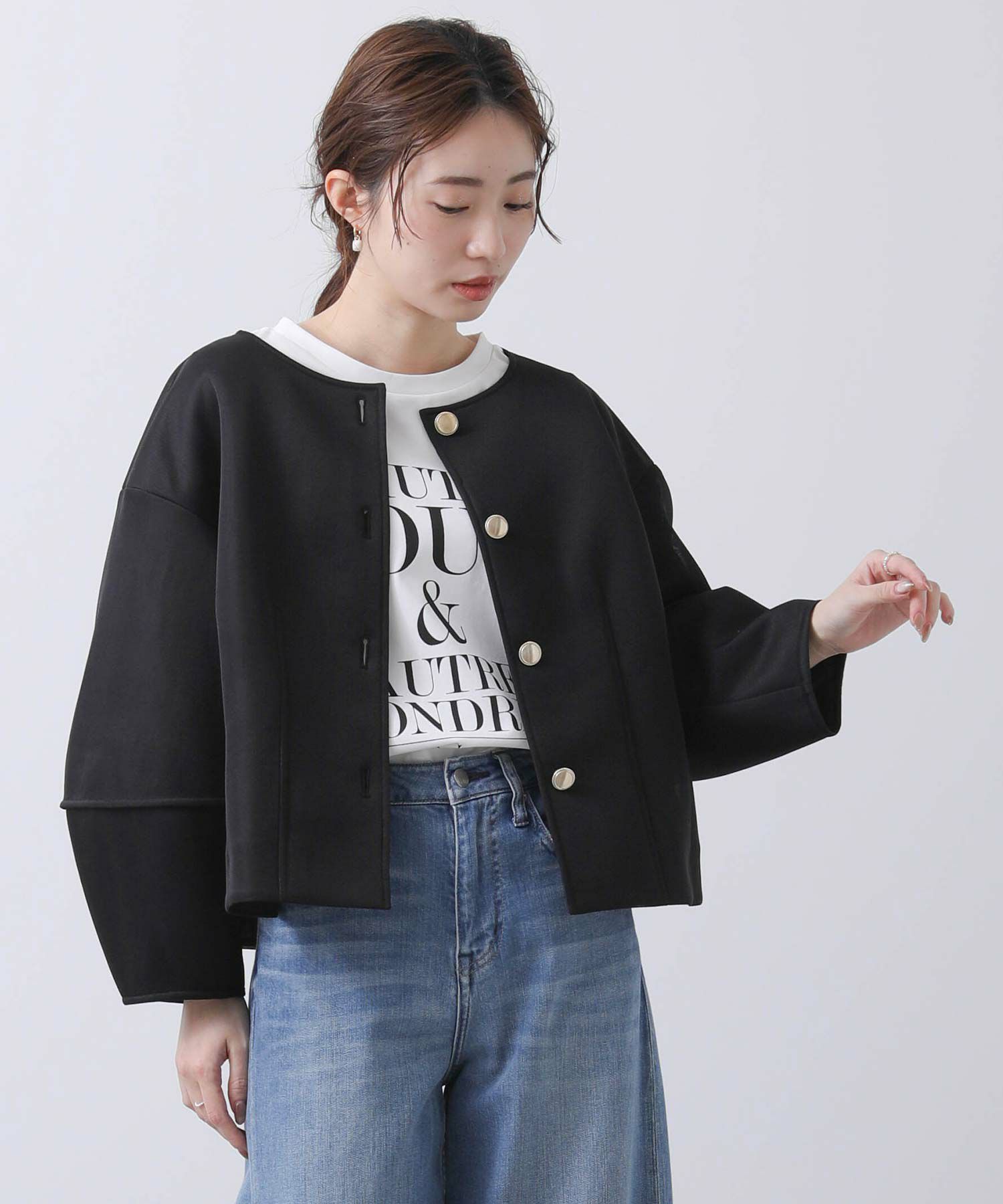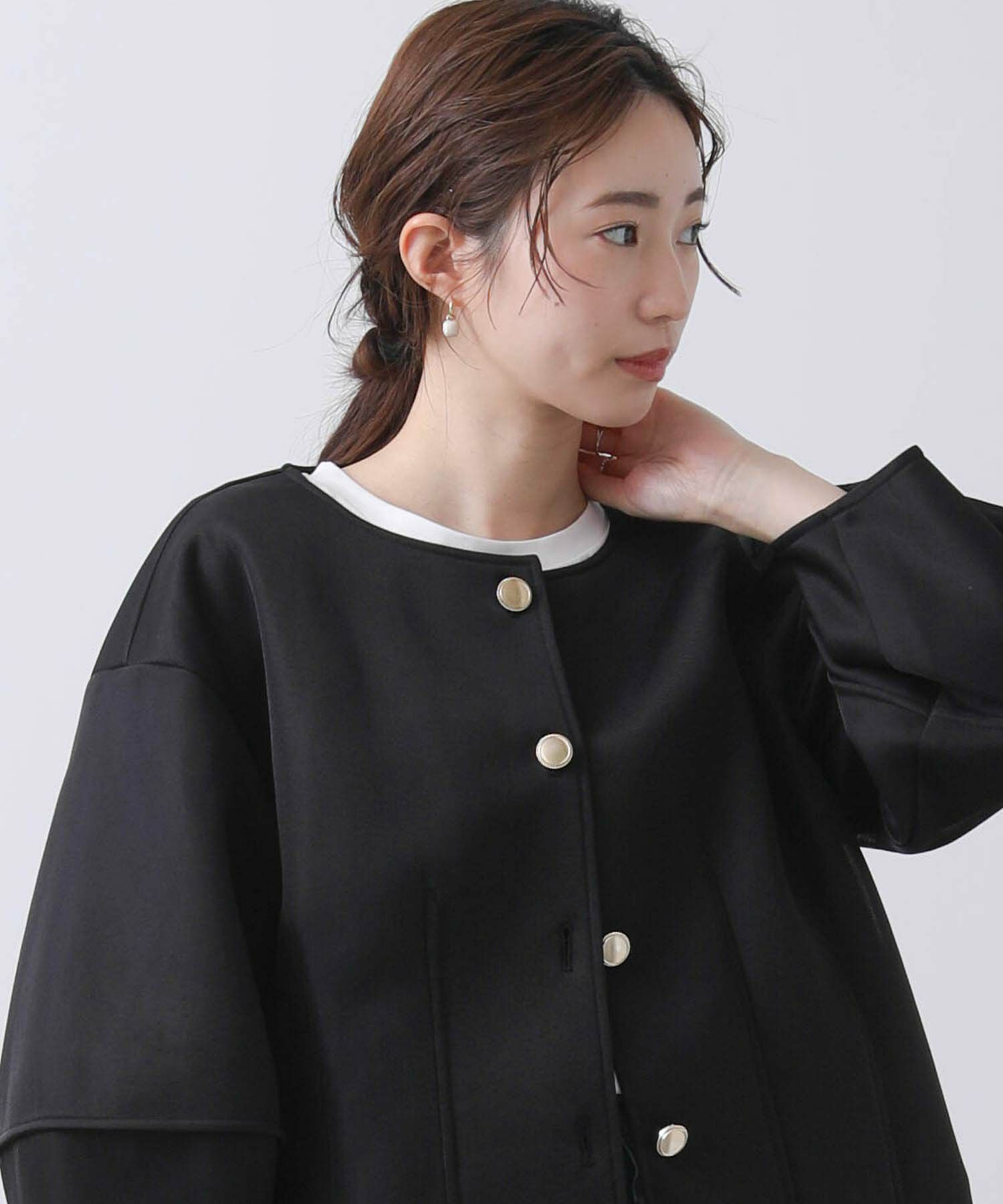 ノーカラーデザインで顔周りはスッキリ見え、金ボタンが上品さをプラスしアクセントに。