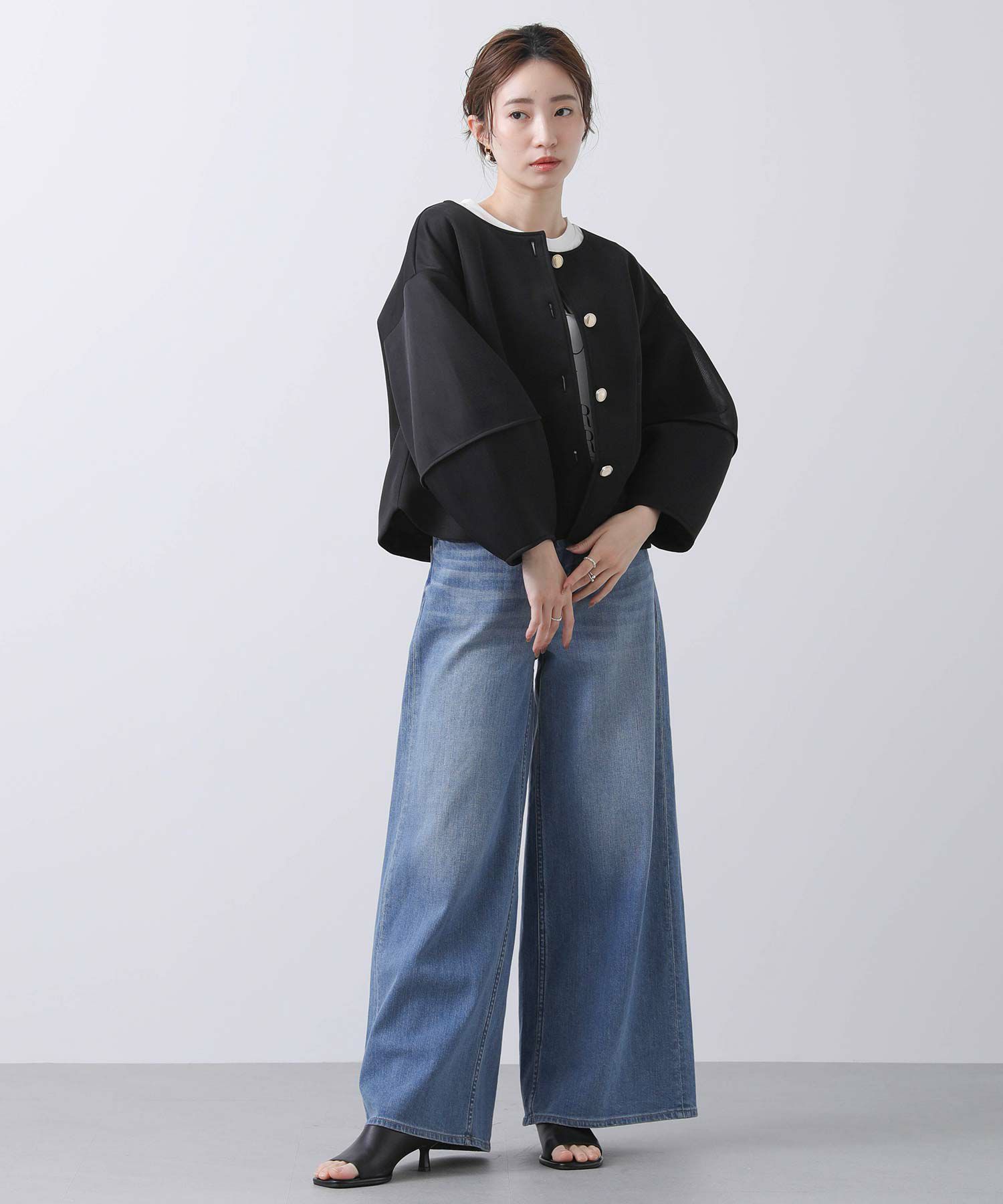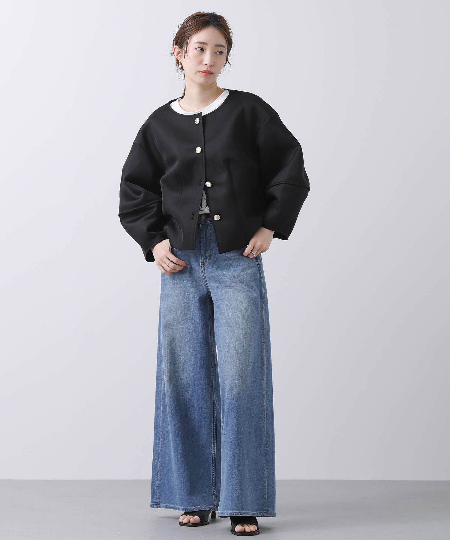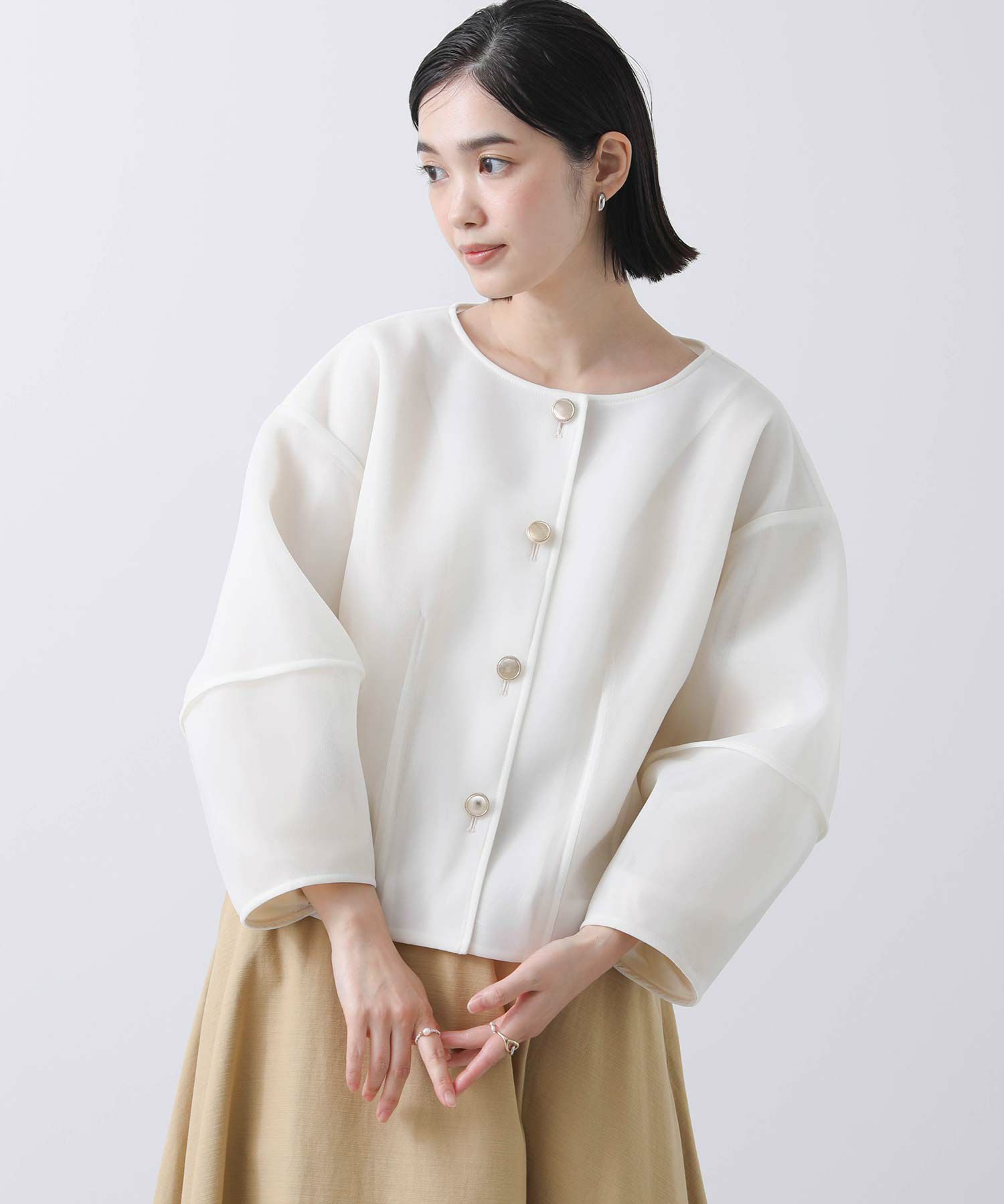 ノーカラーデザインで顔周りはスッキリ見え、金ボタンが上品さをプラスしアクセントに。