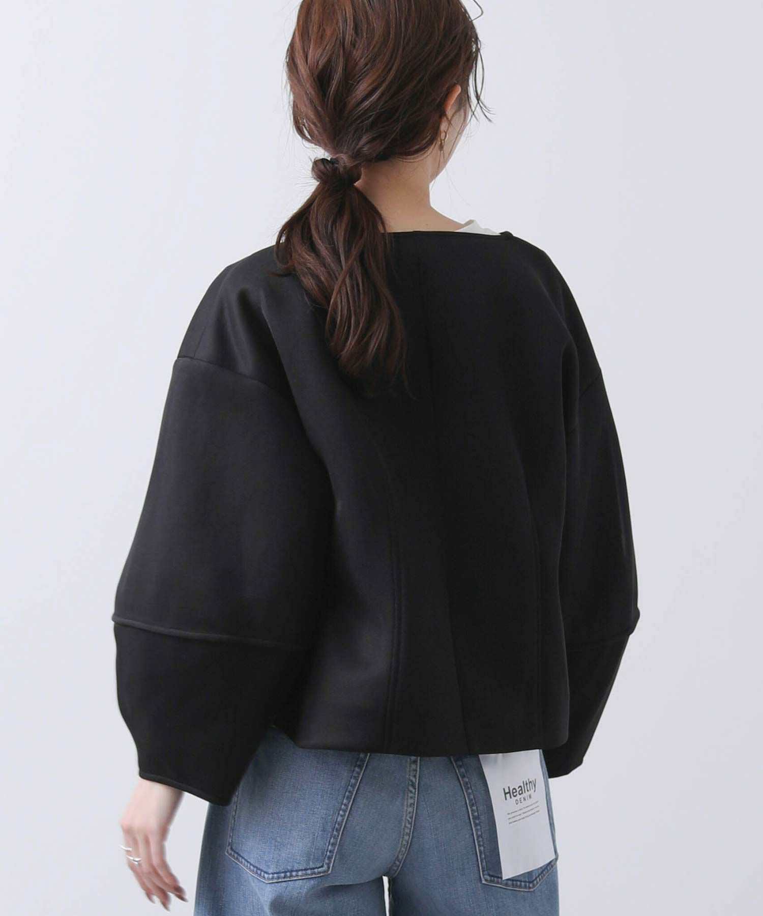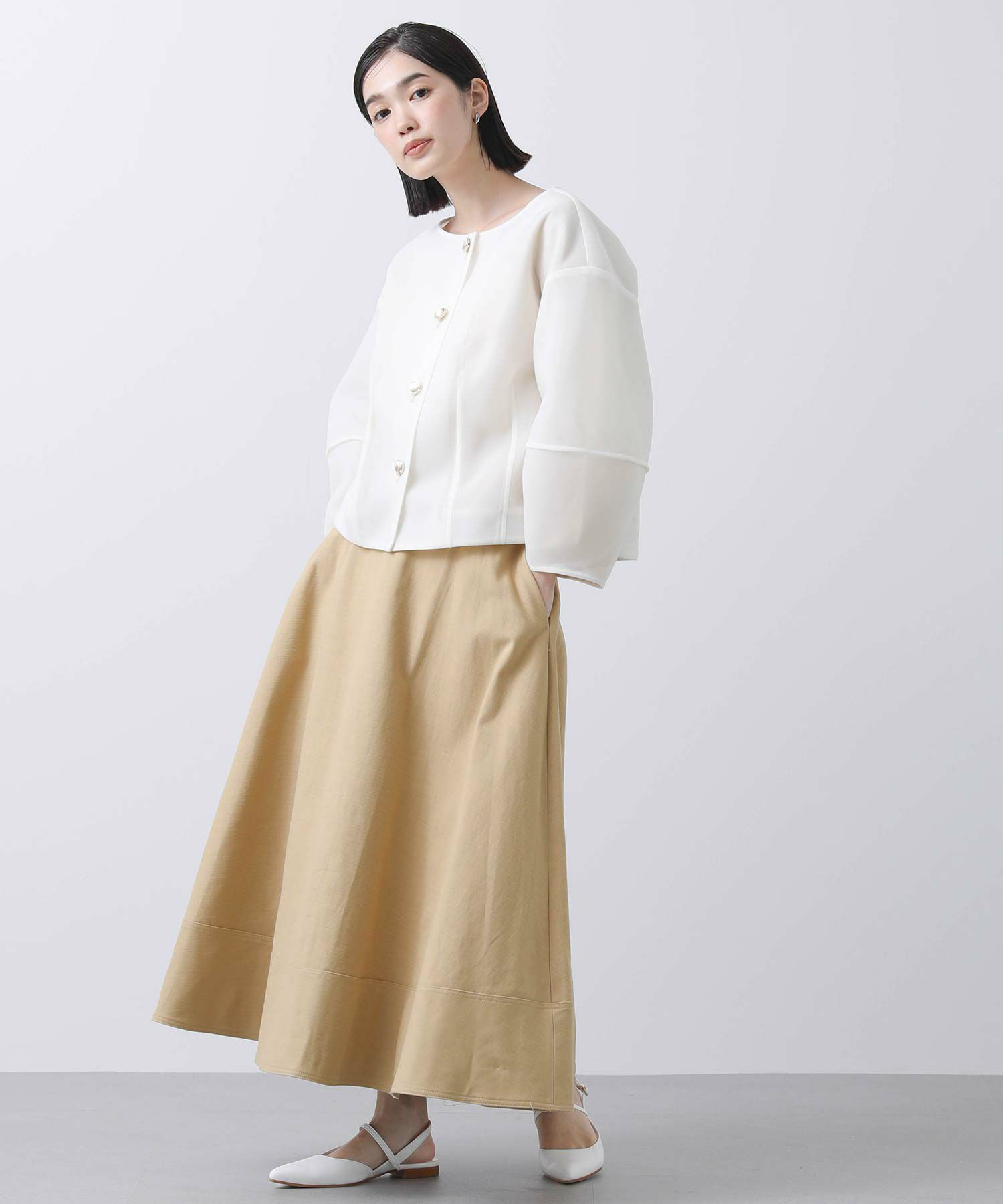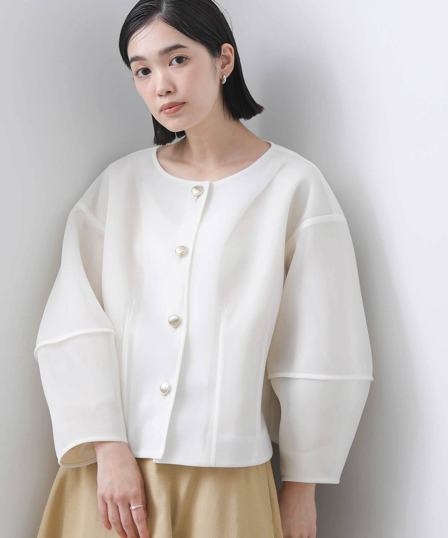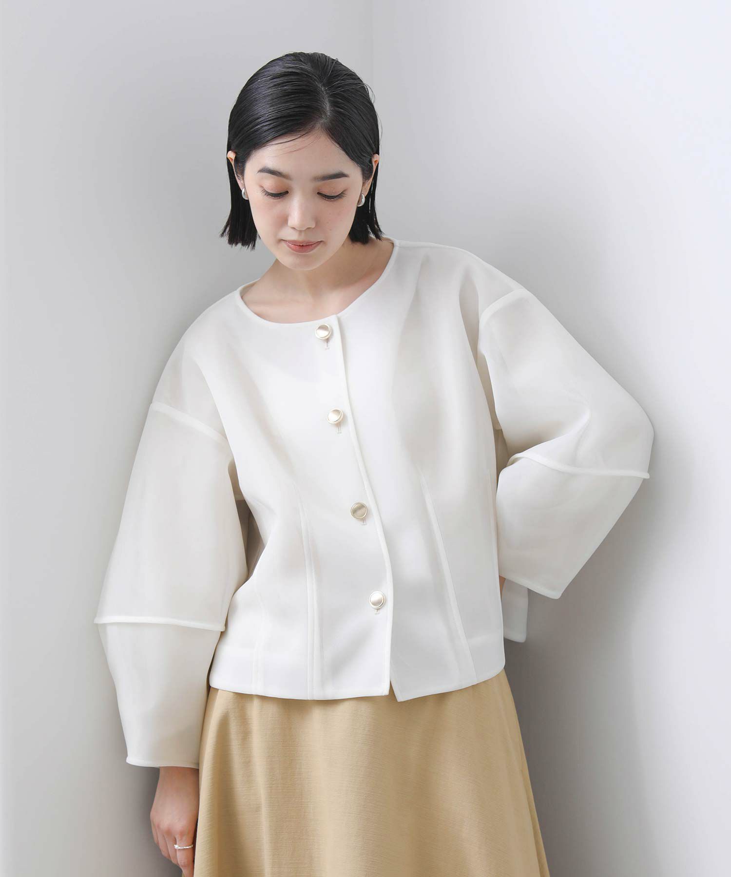 ノーカラーデザインで顔周りはスッキリ見え、金ボタンが上品さをプラスしアクセントに。