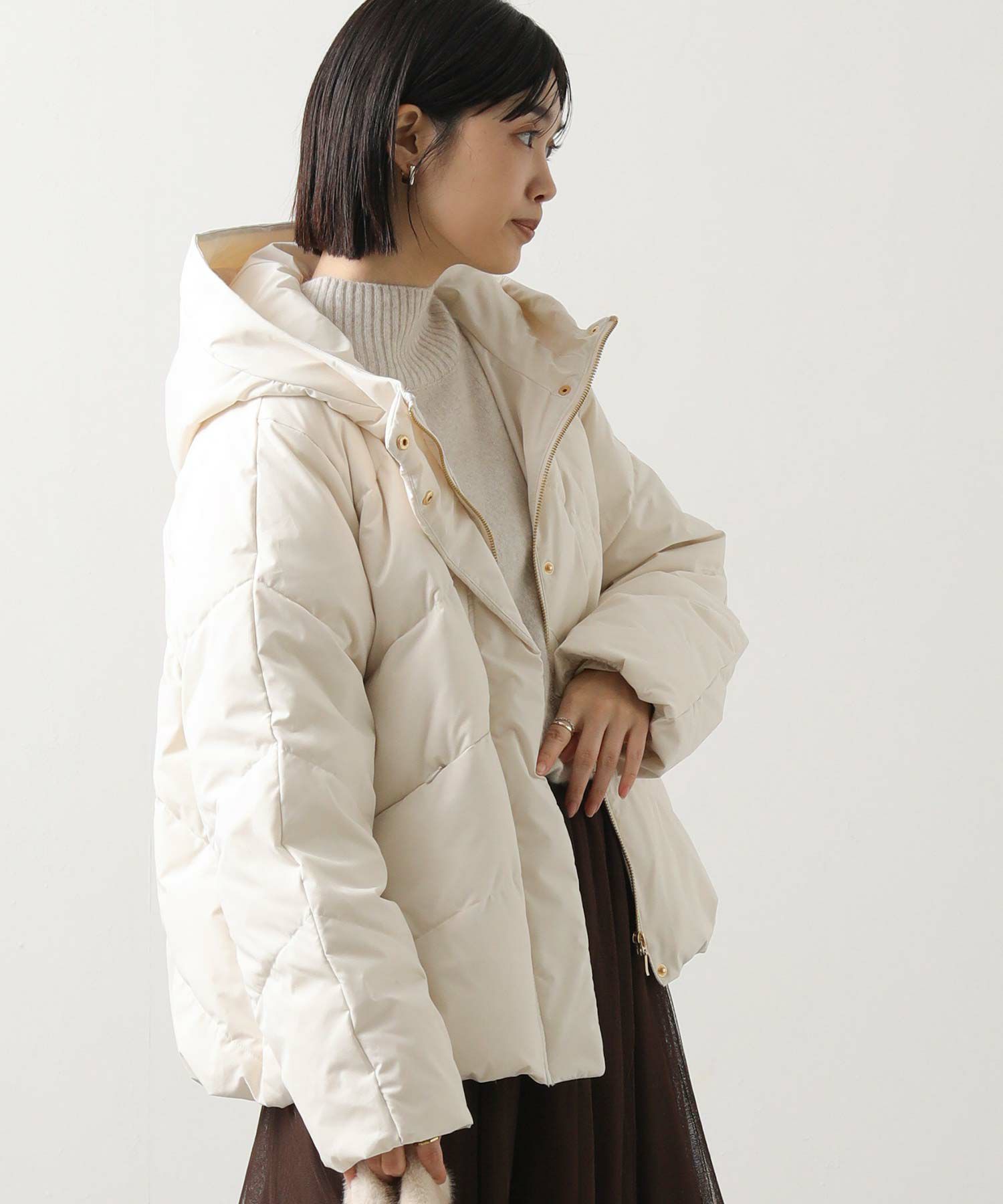 ふっくらと首元を包み込むボリュームのあるスタンドネックダウン。