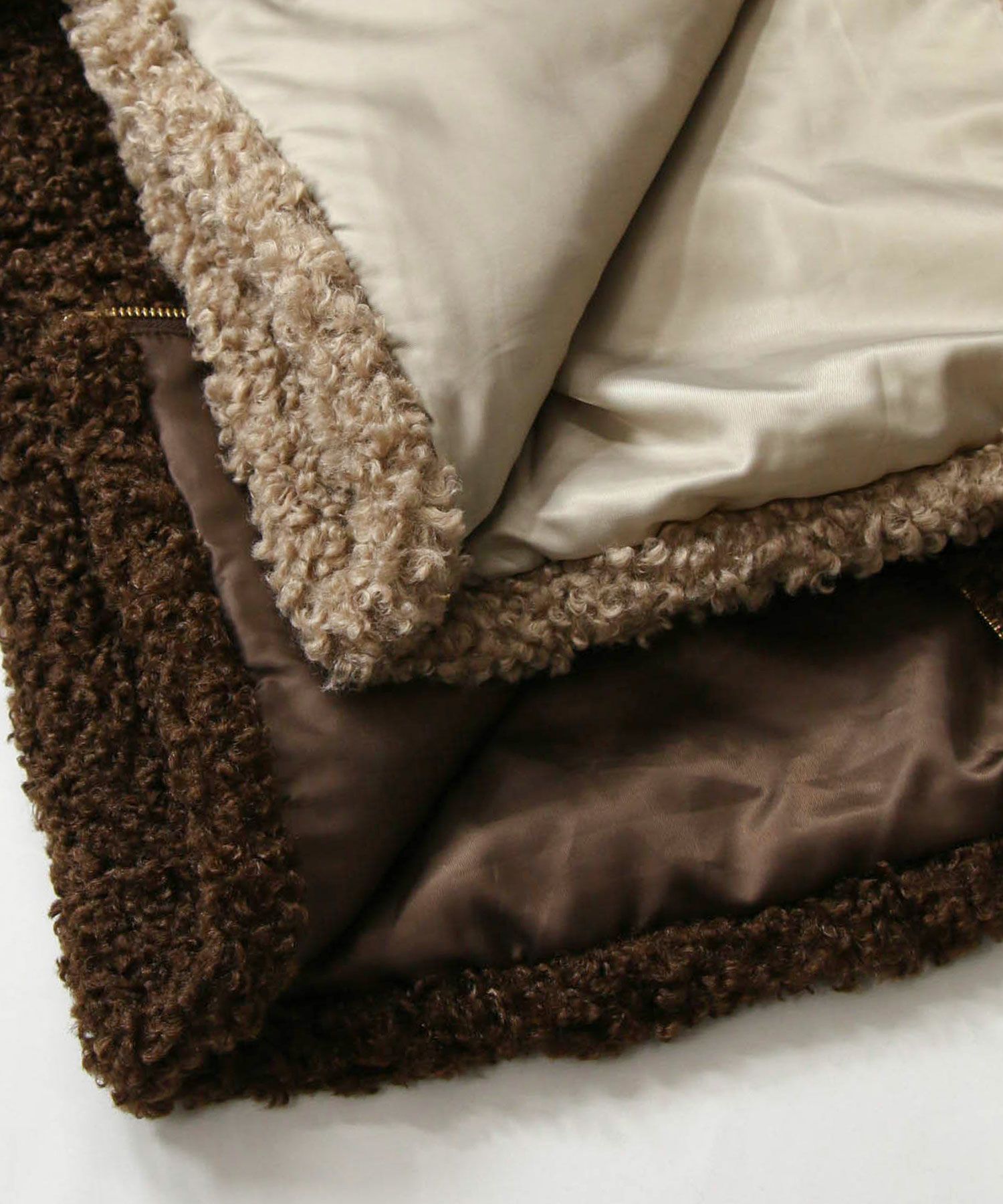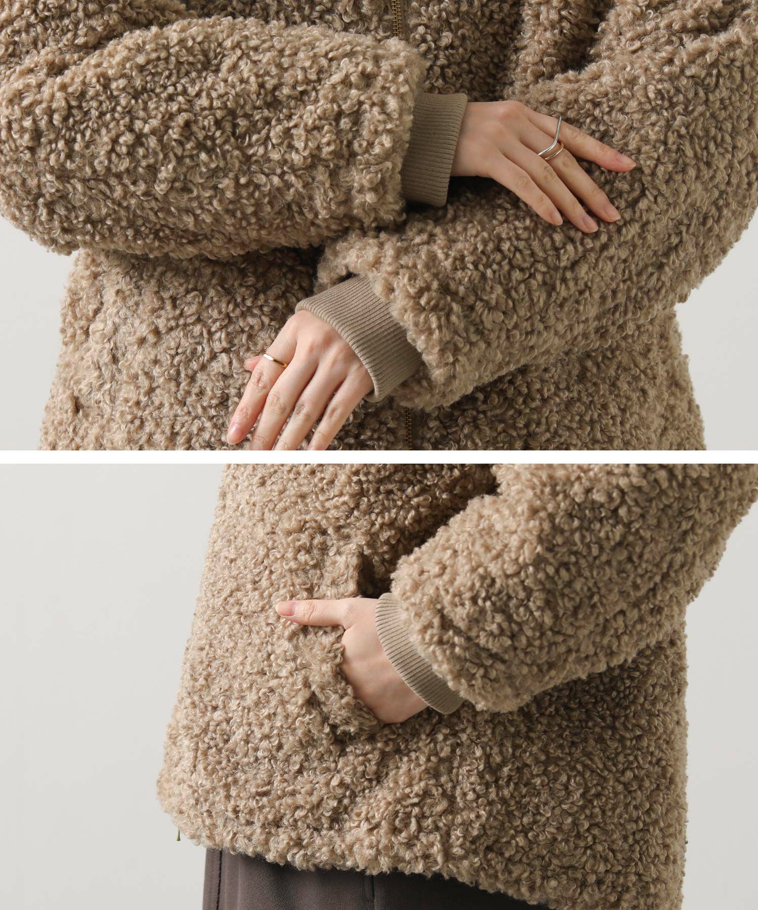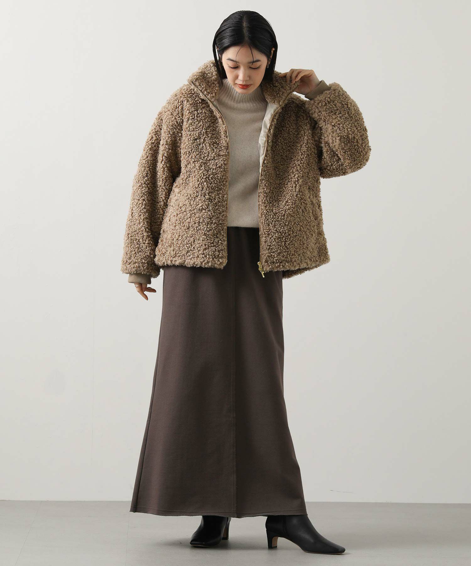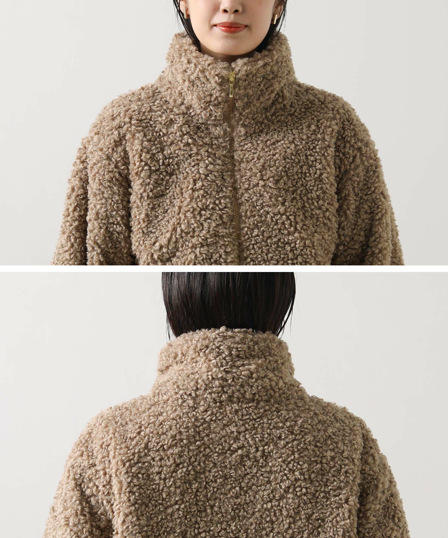 毛足が長めのプードルボアを使用したハイネックブルゾン。