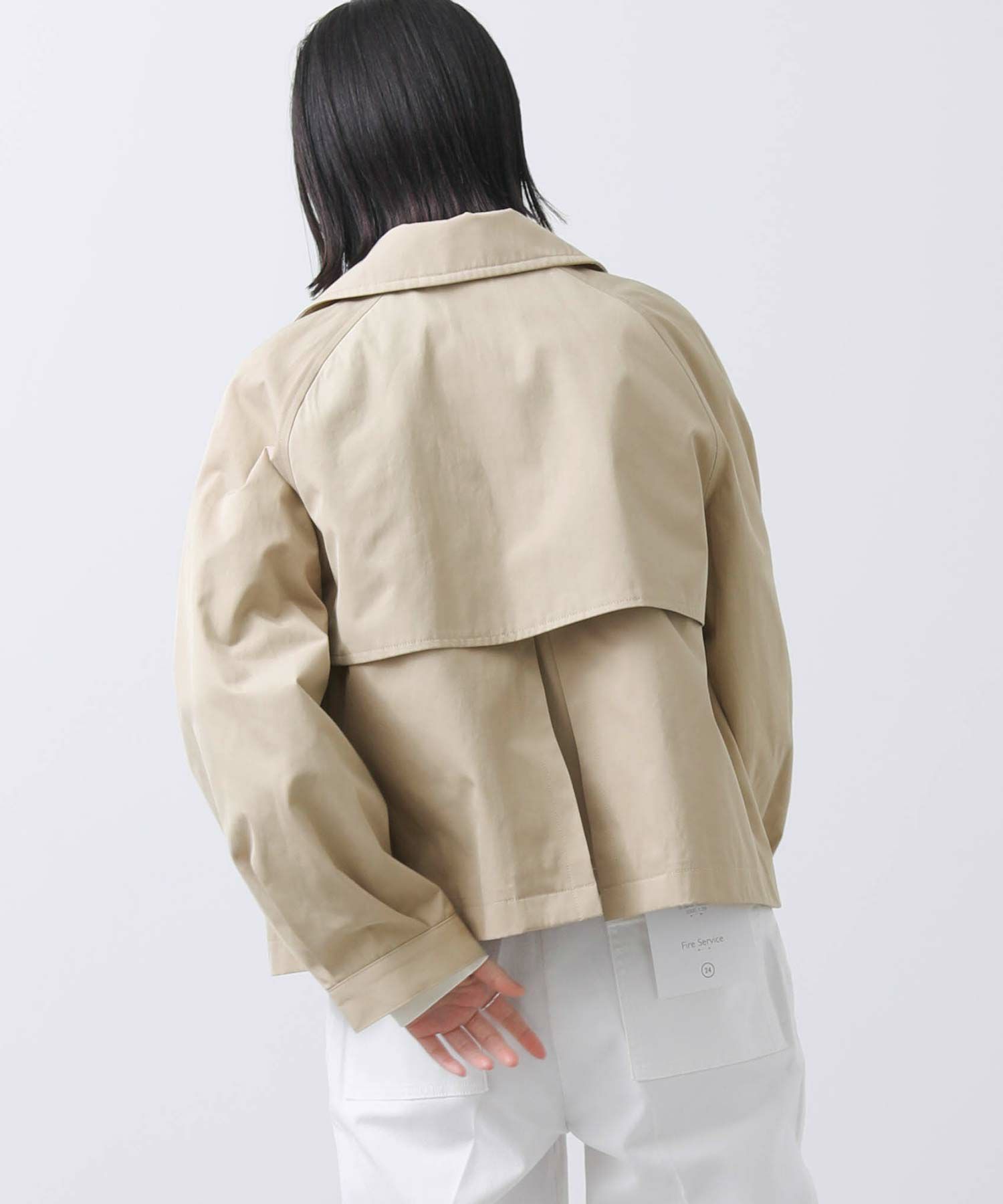 ボックスに近いラインのショートトレンチで、やや光沢とシワになりにくいポリエステル混の素材を使用。