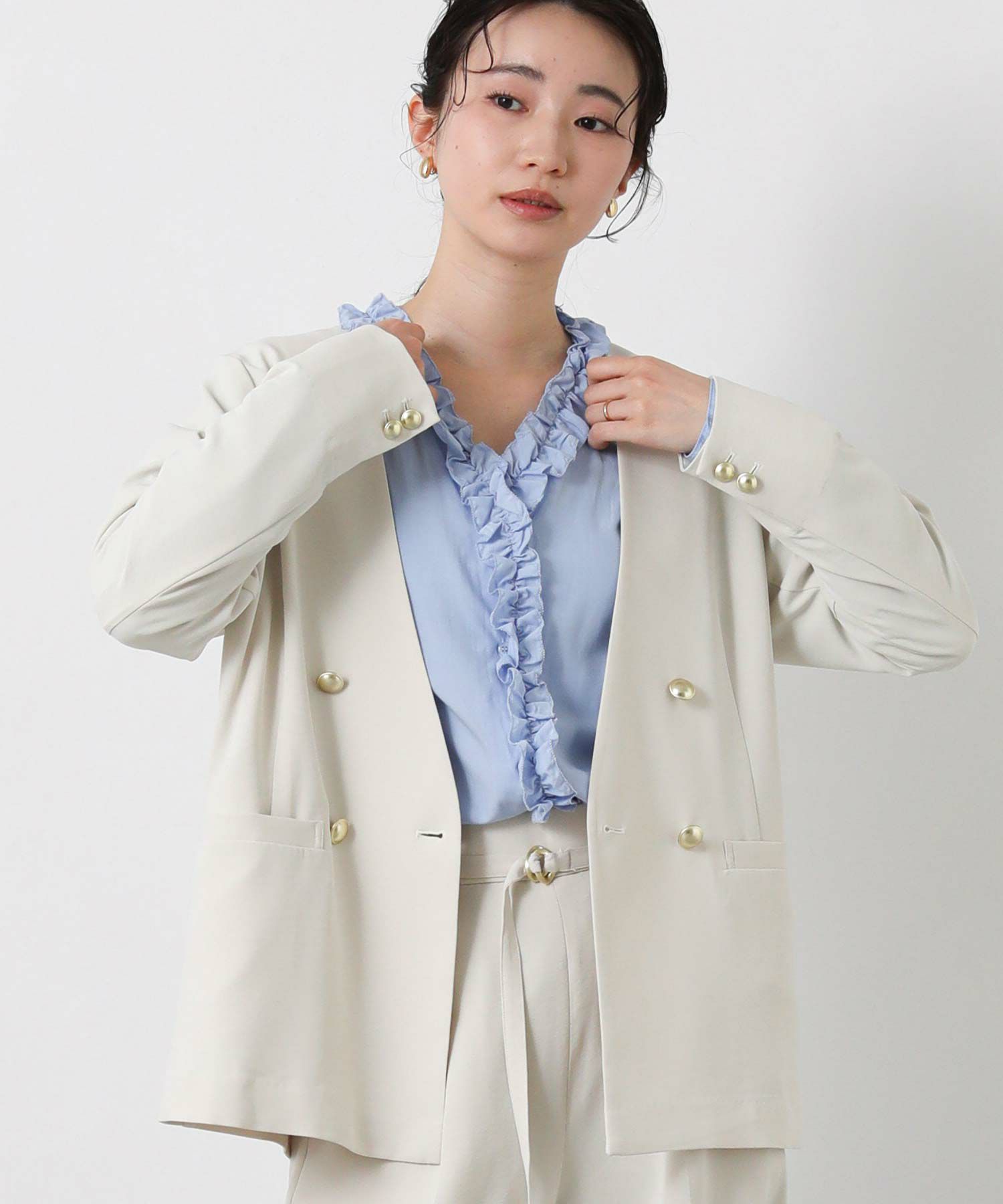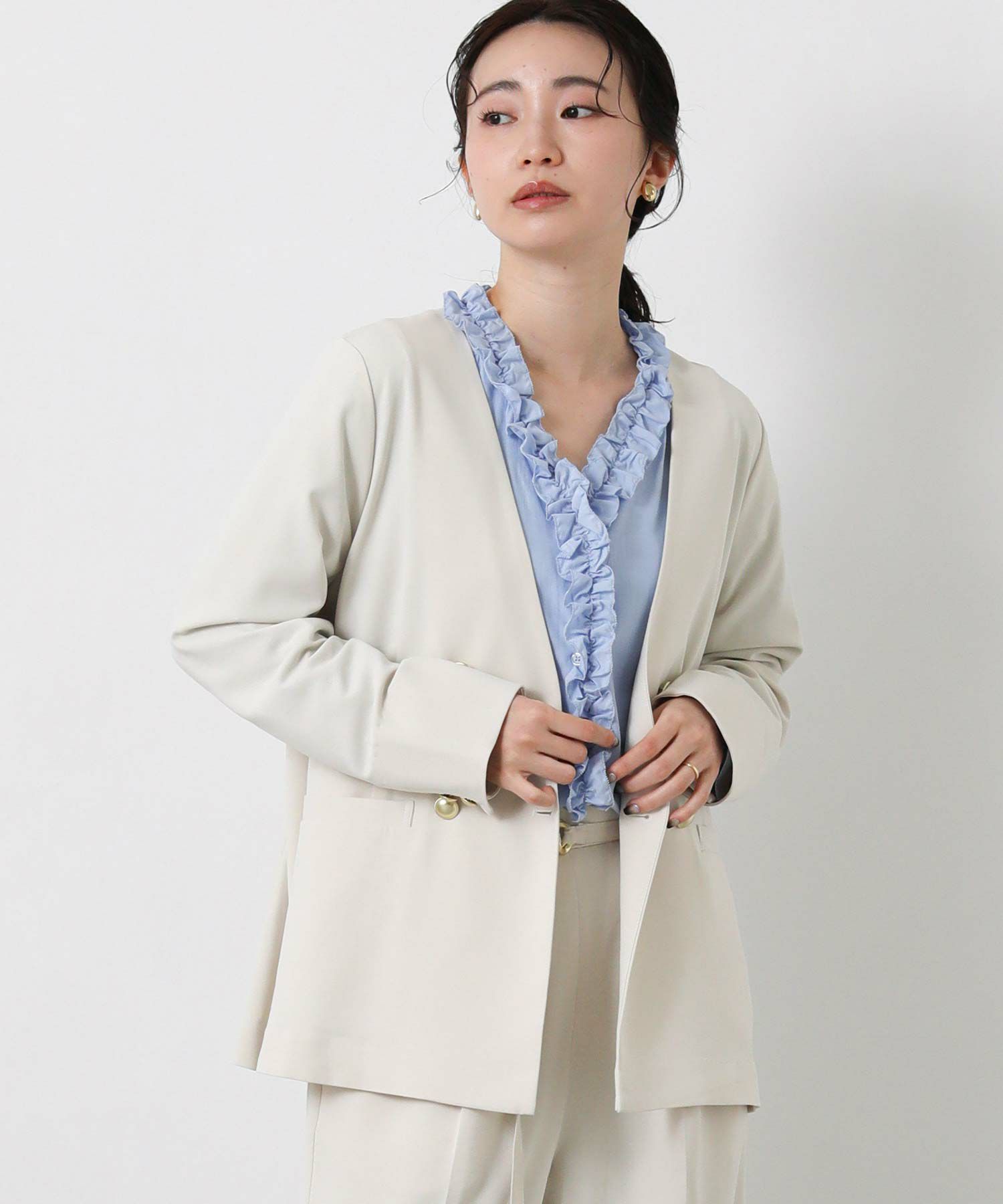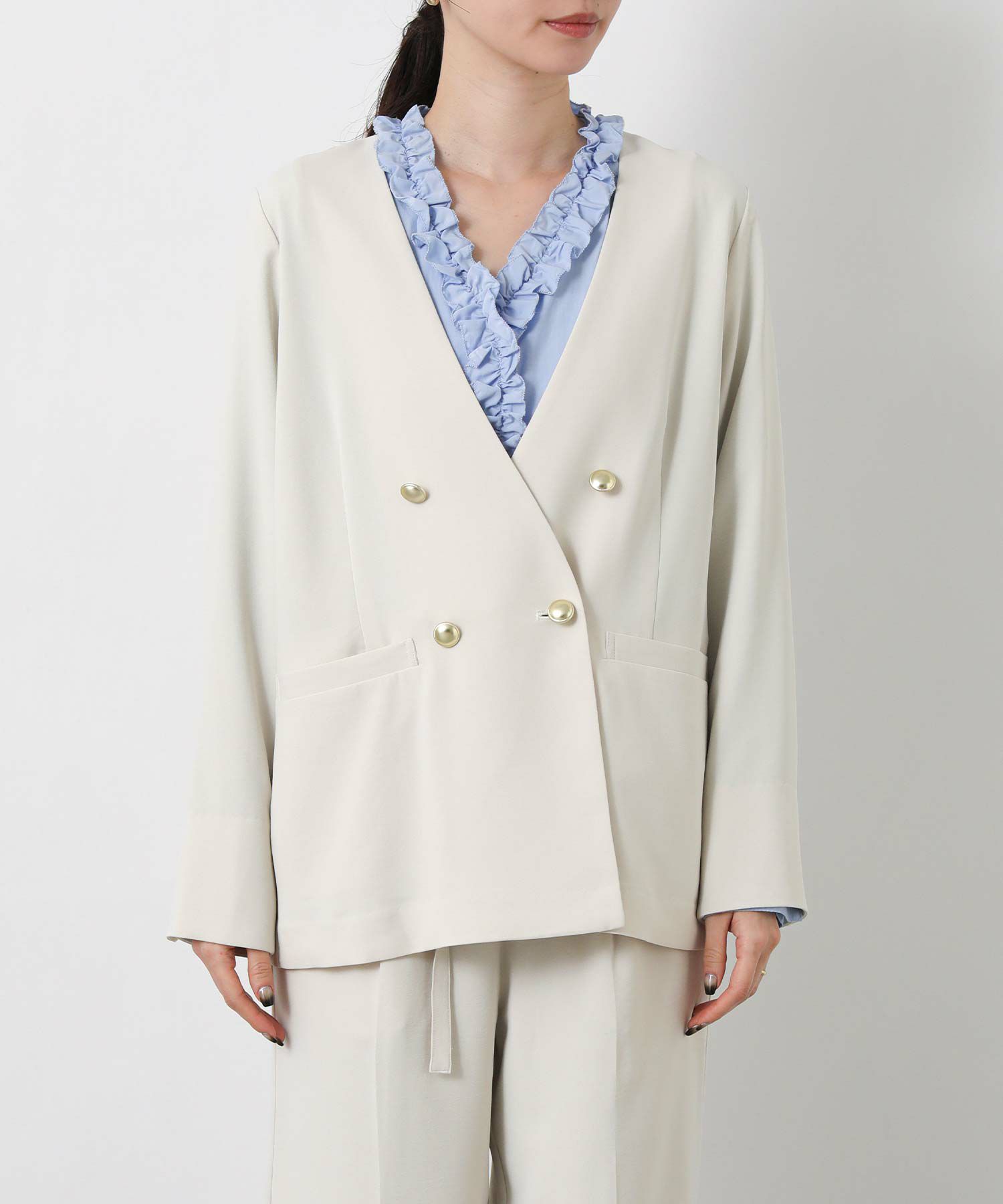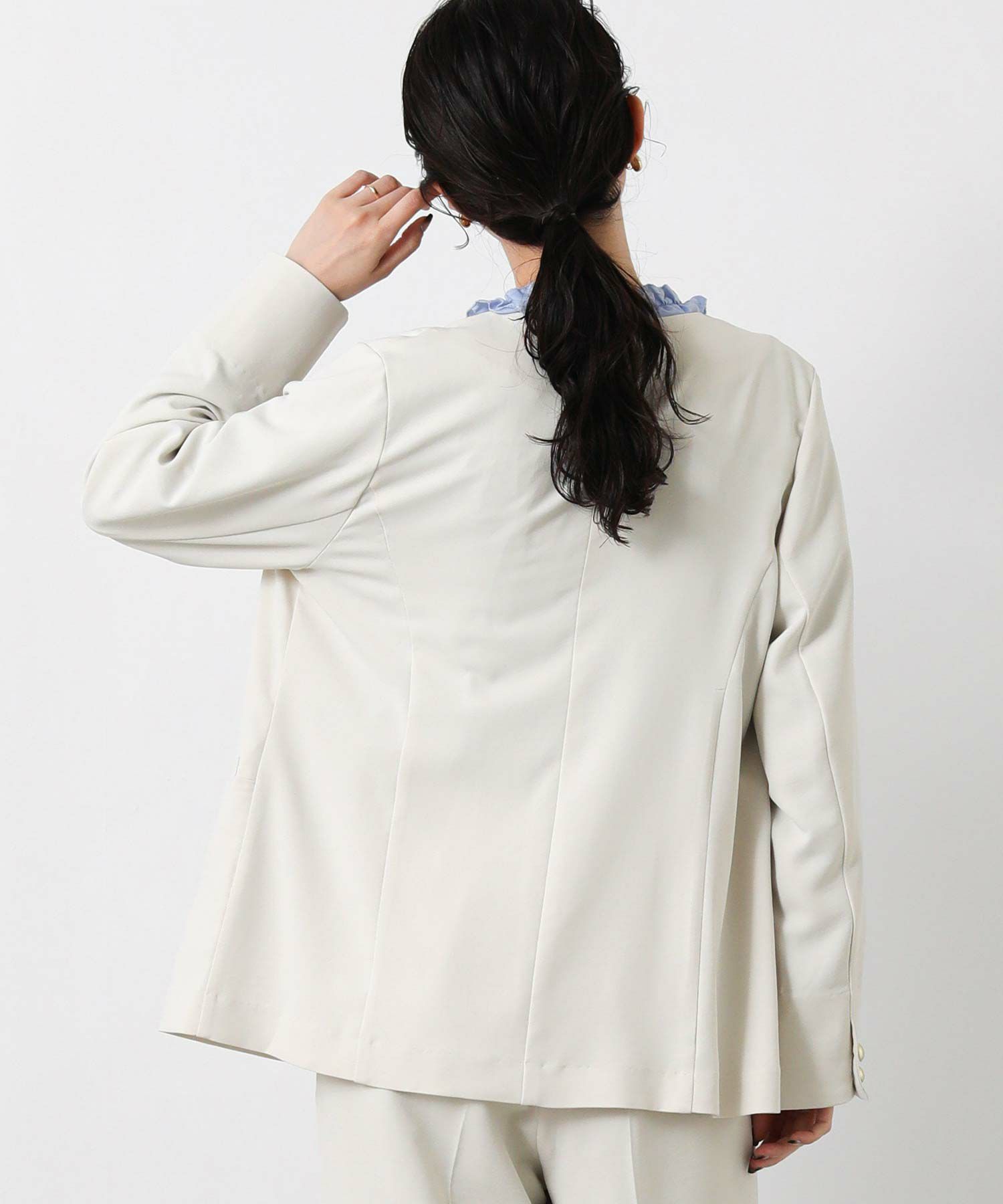 衿のないデザインのダブルジャケットはカーディガンのようにサラッと羽織りやすく、通勤やデイリーにも着やすい1着。
