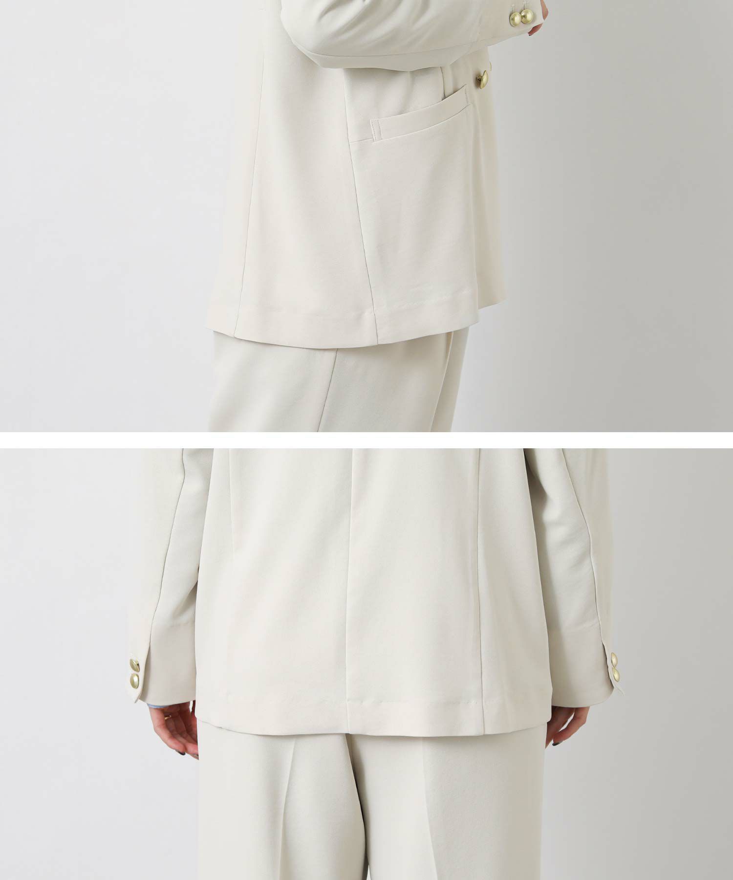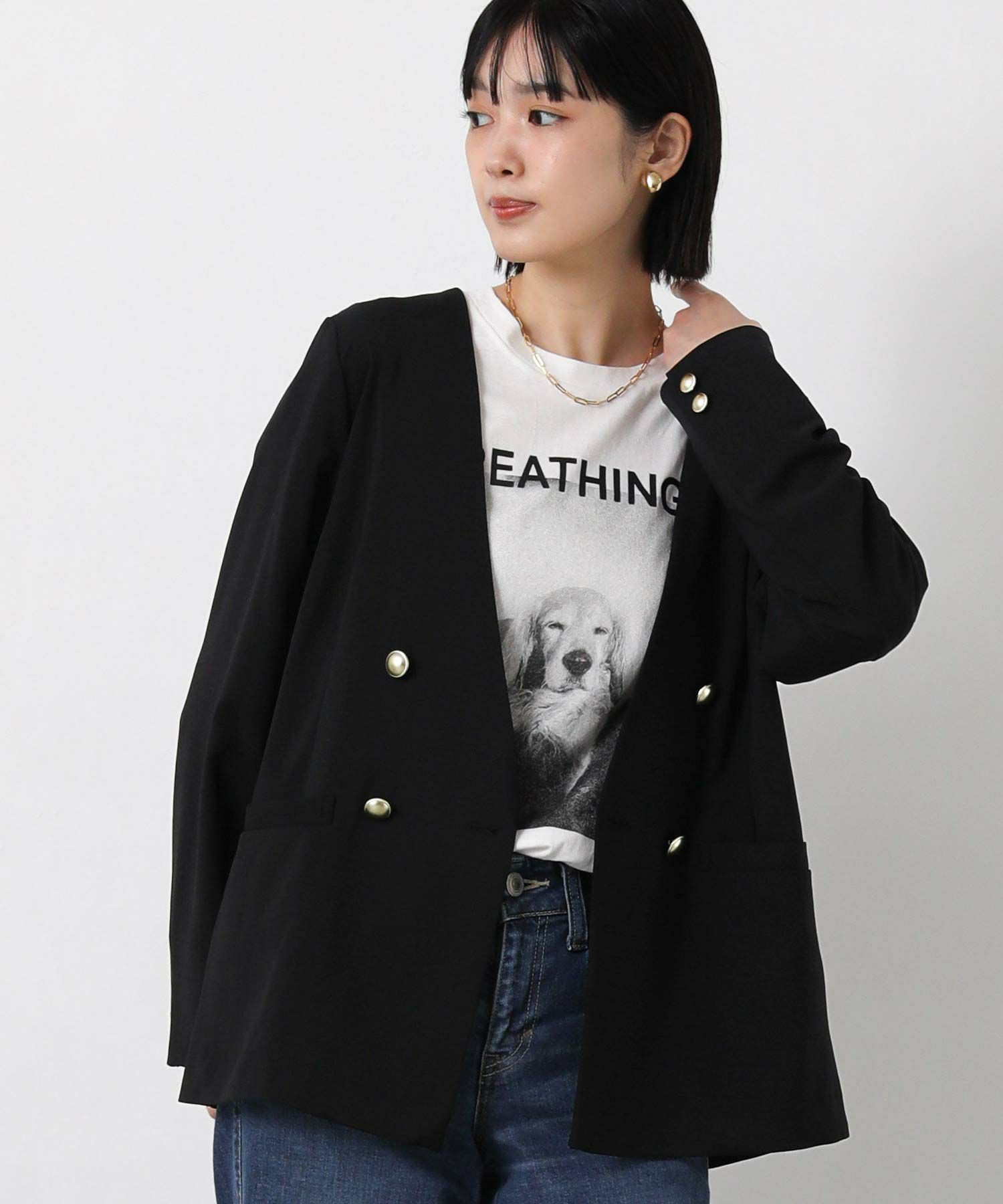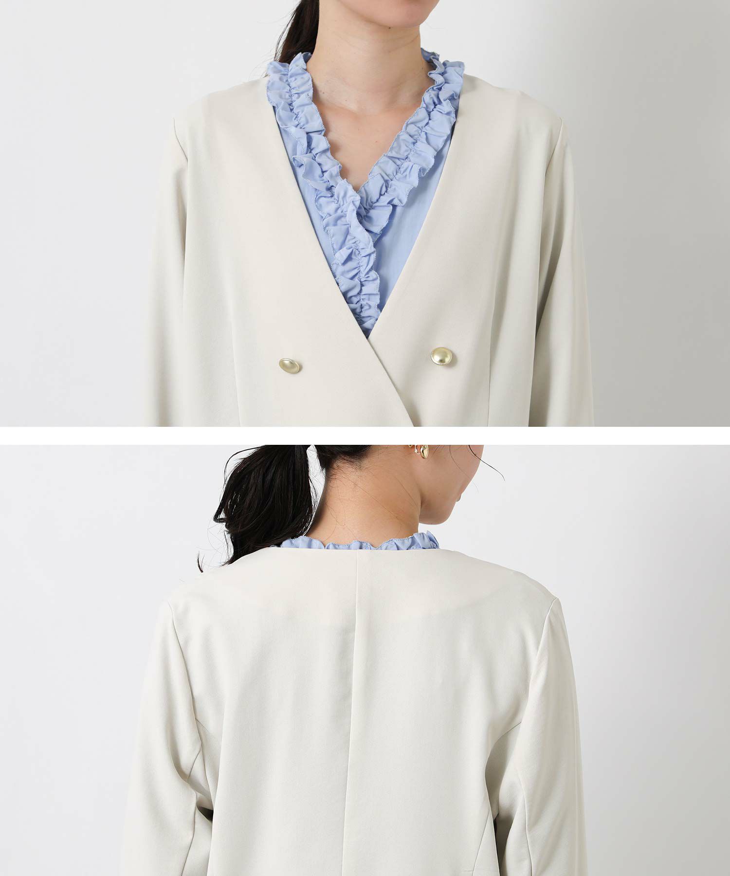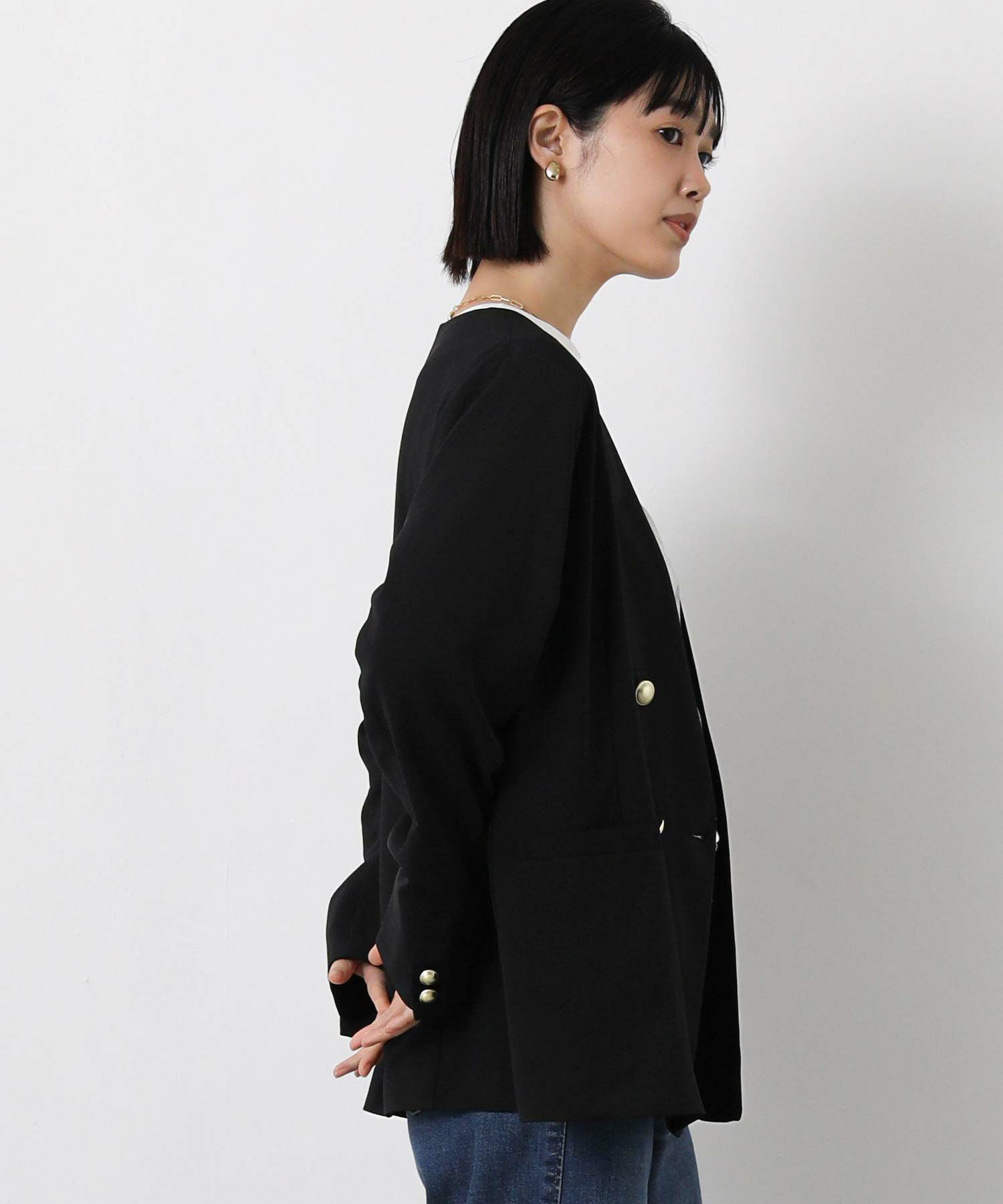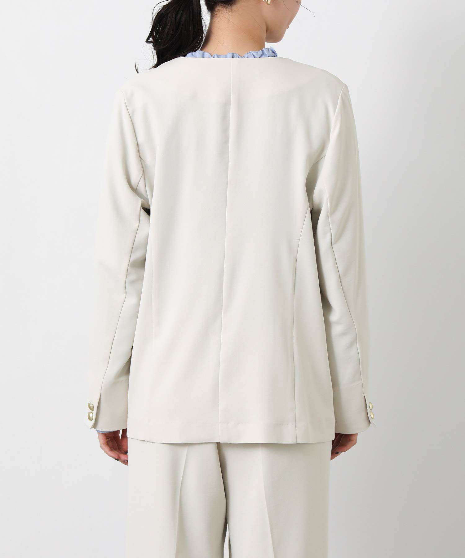 衿のないデザインのダブルジャケットはカーディガンのようにサラッと羽織りやすく、通勤やデイリーにも着やすい1着。