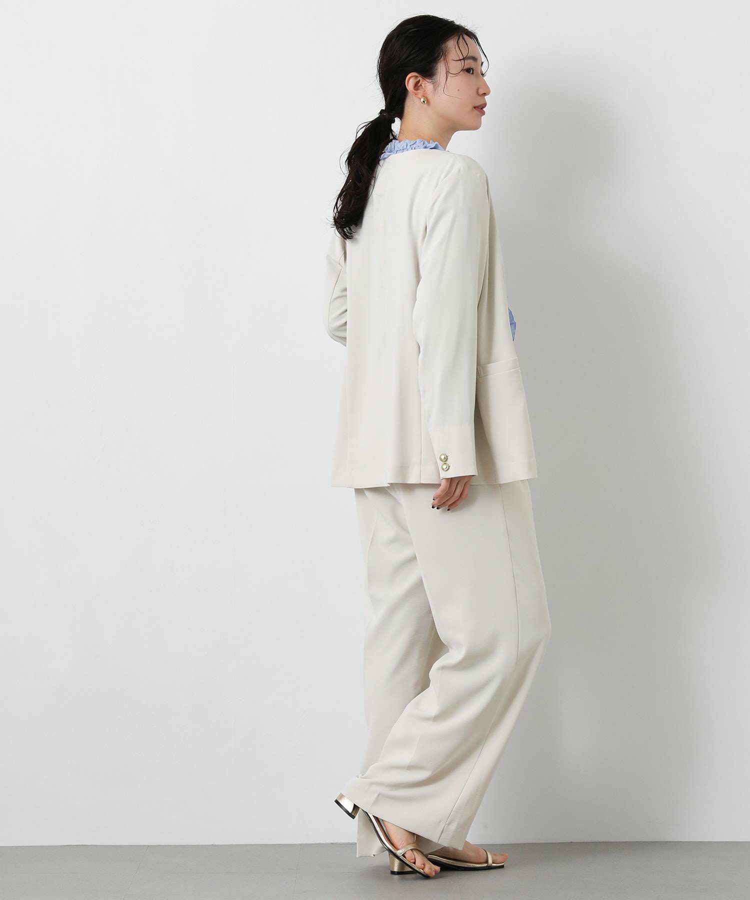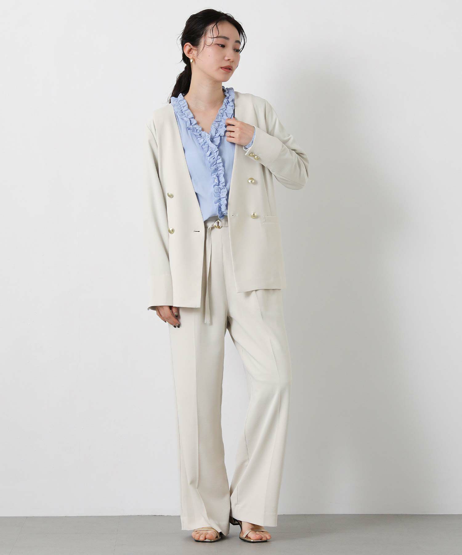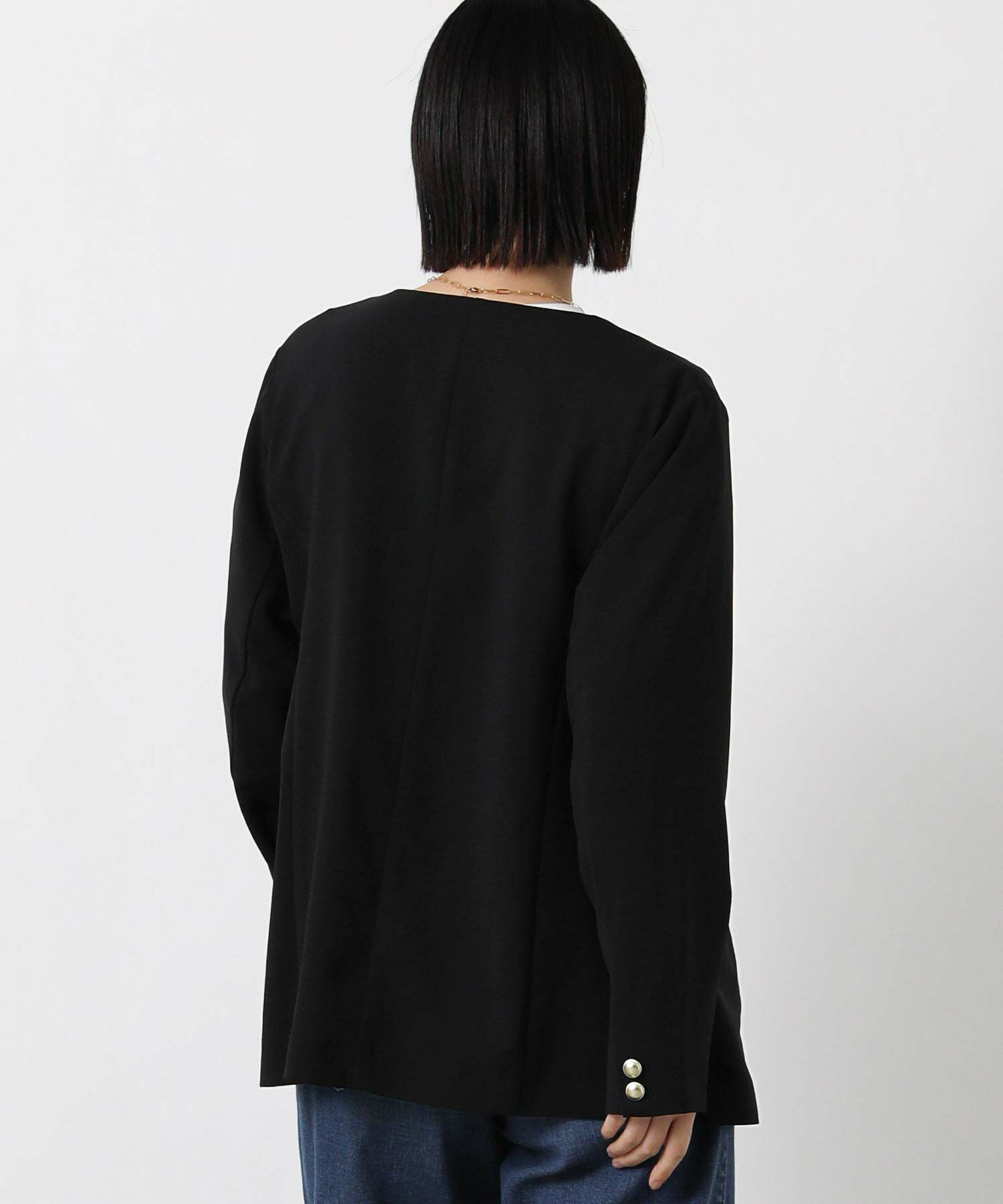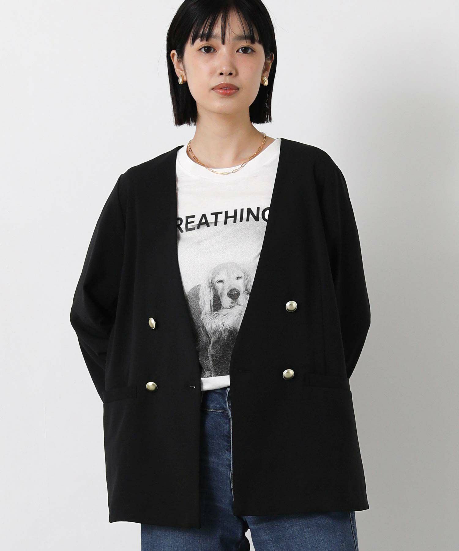 衿のないデザインのダブルジャケットはカーディガンのようにサラッと羽織りやすく、通勤やデイリーにも着やすい1着。