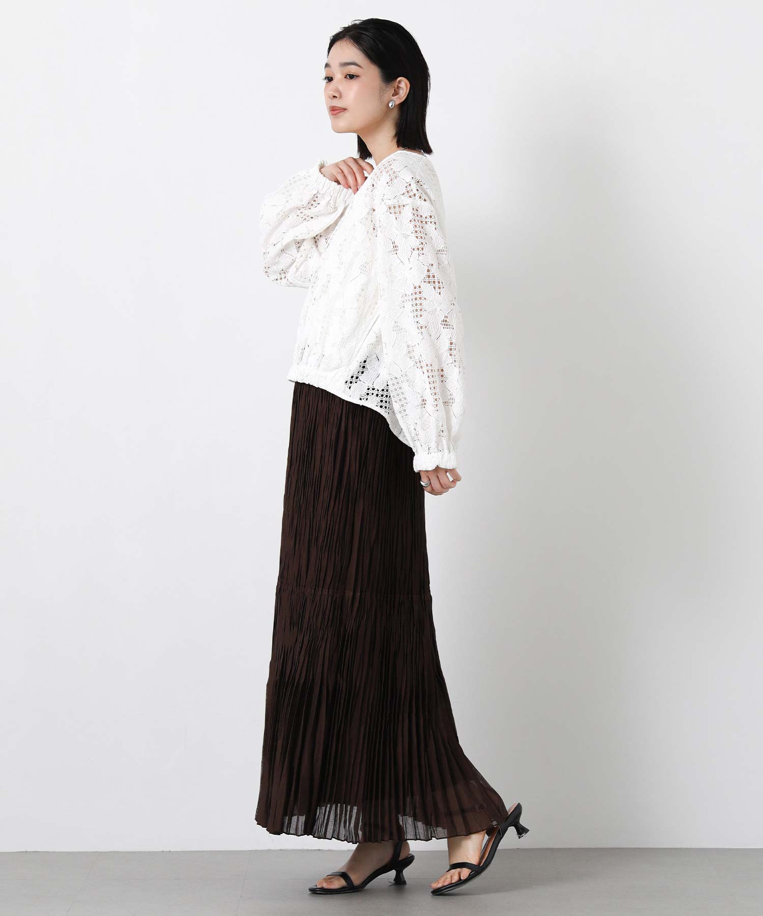 Vネック仕様にすることで顔まわりをスッキリと魅せ、インナーとのレイヤードも楽しめる1着に仕上げました。