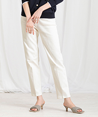 フレアのボリュームを活かして、インのスタイルはコンパクトにまとめるのがおススメ。デニムやテーパードパンツにも相性抜群です。ブラウス合わせで上品に、ロゴTで少しカジュアルに外すコーディネートも◎