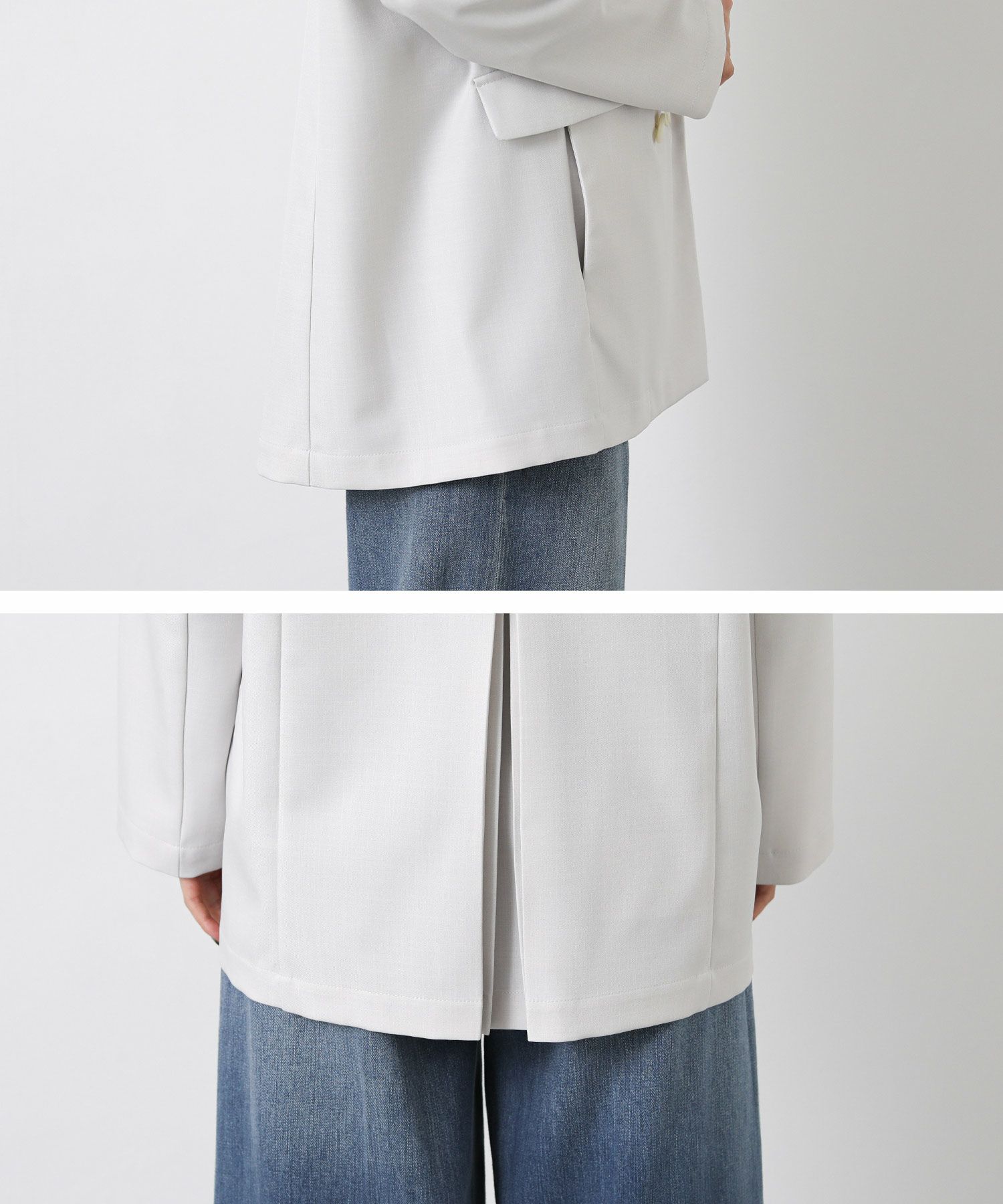 前身のダブル仕様と、スッキリとしたセットインスリーブでトレンド感のある着こなしを叶えてくれます。
