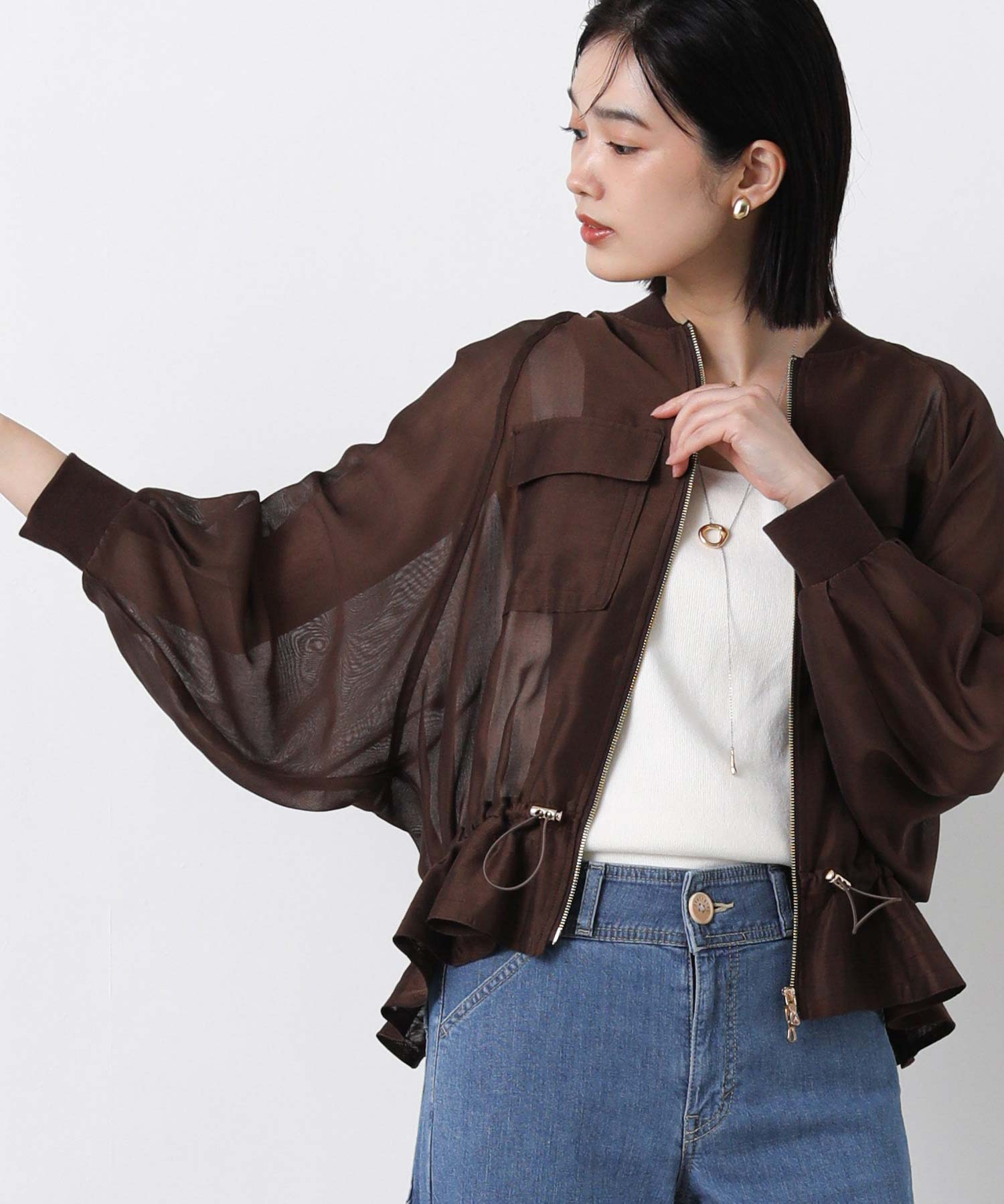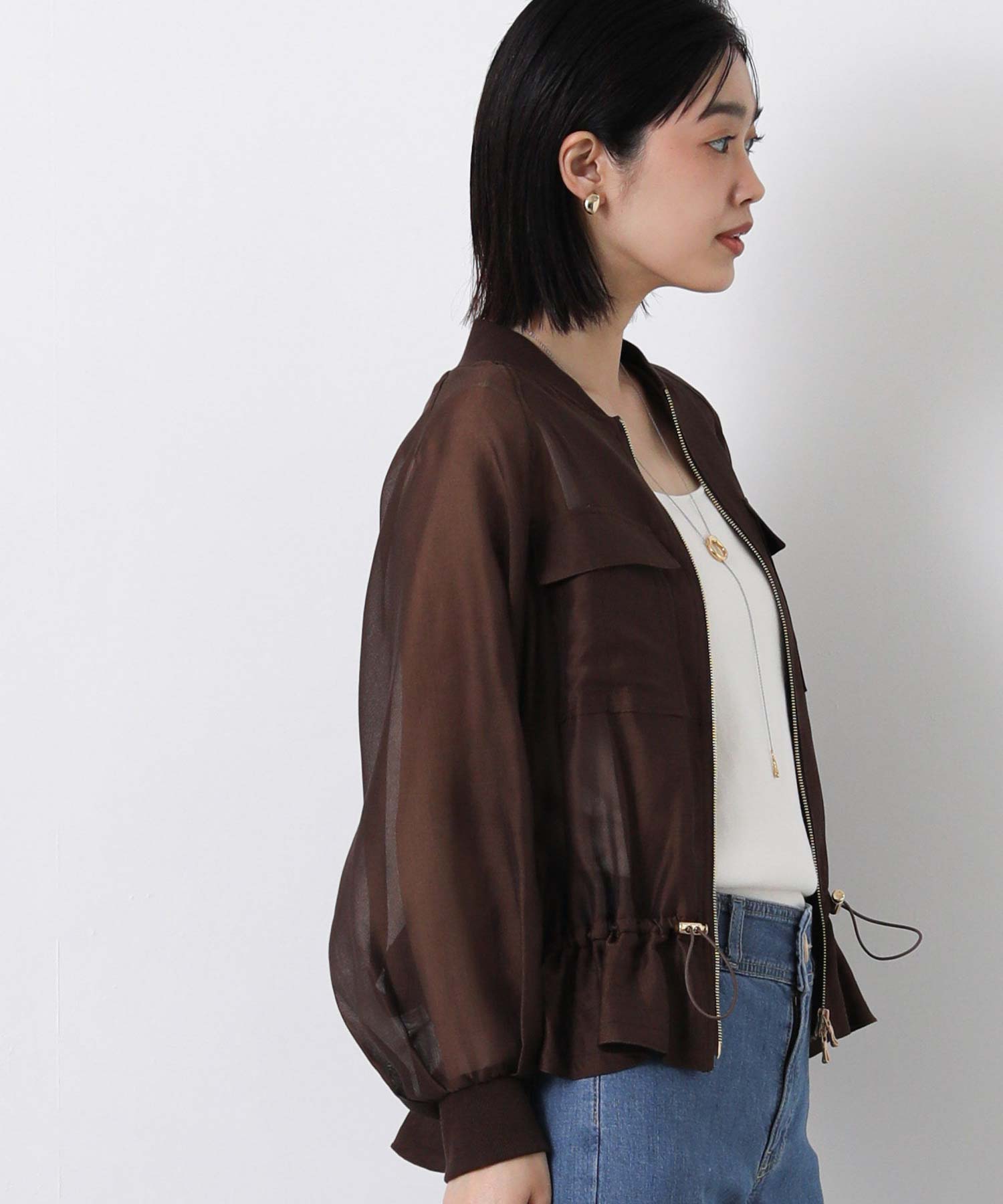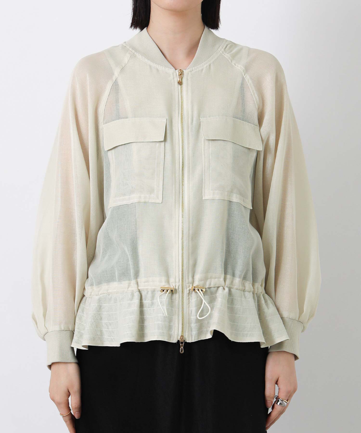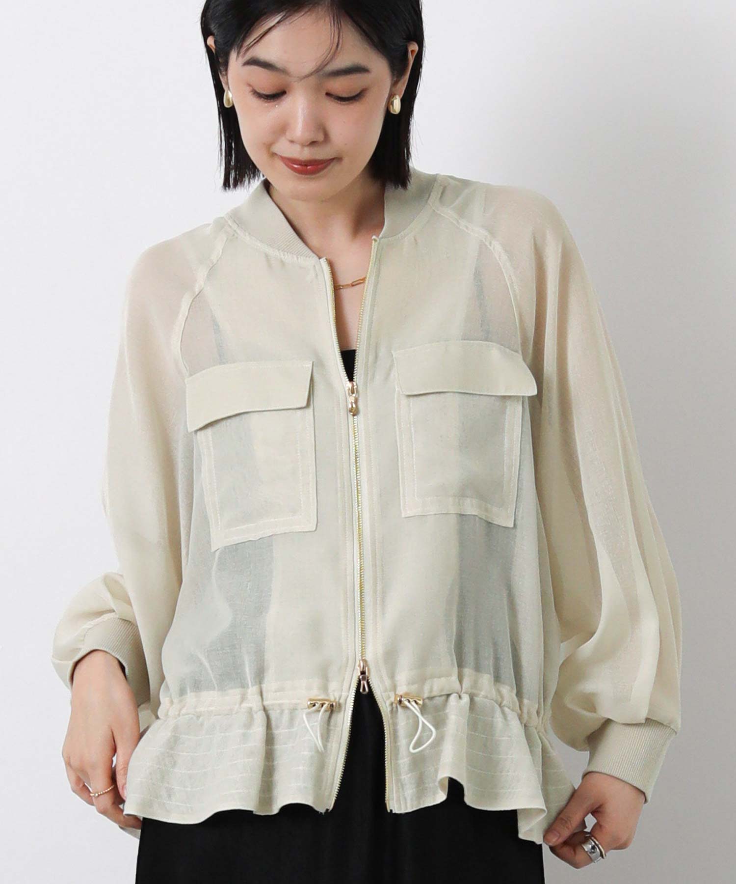 クリアな光沢感が上品なシアーブルゾン。