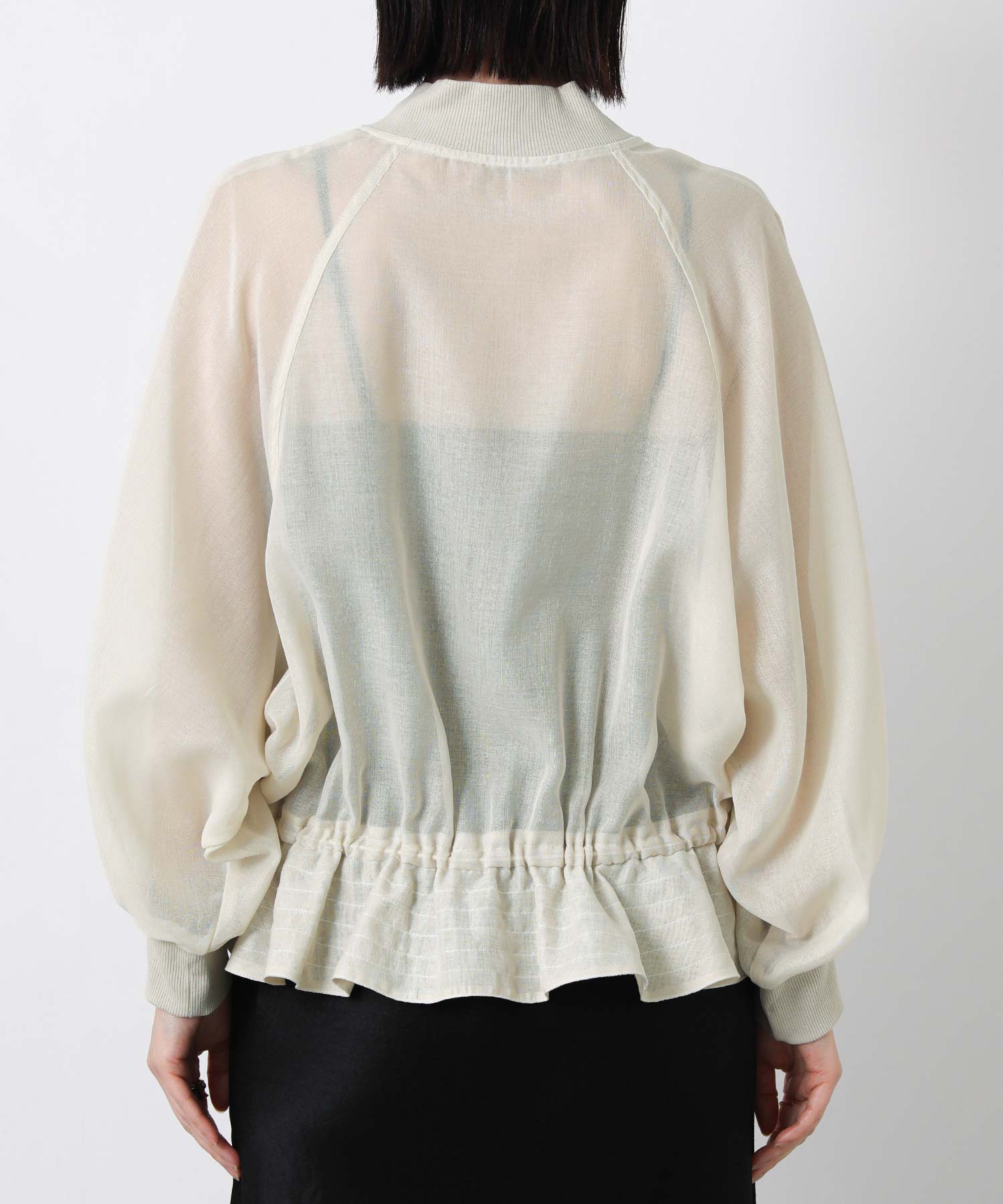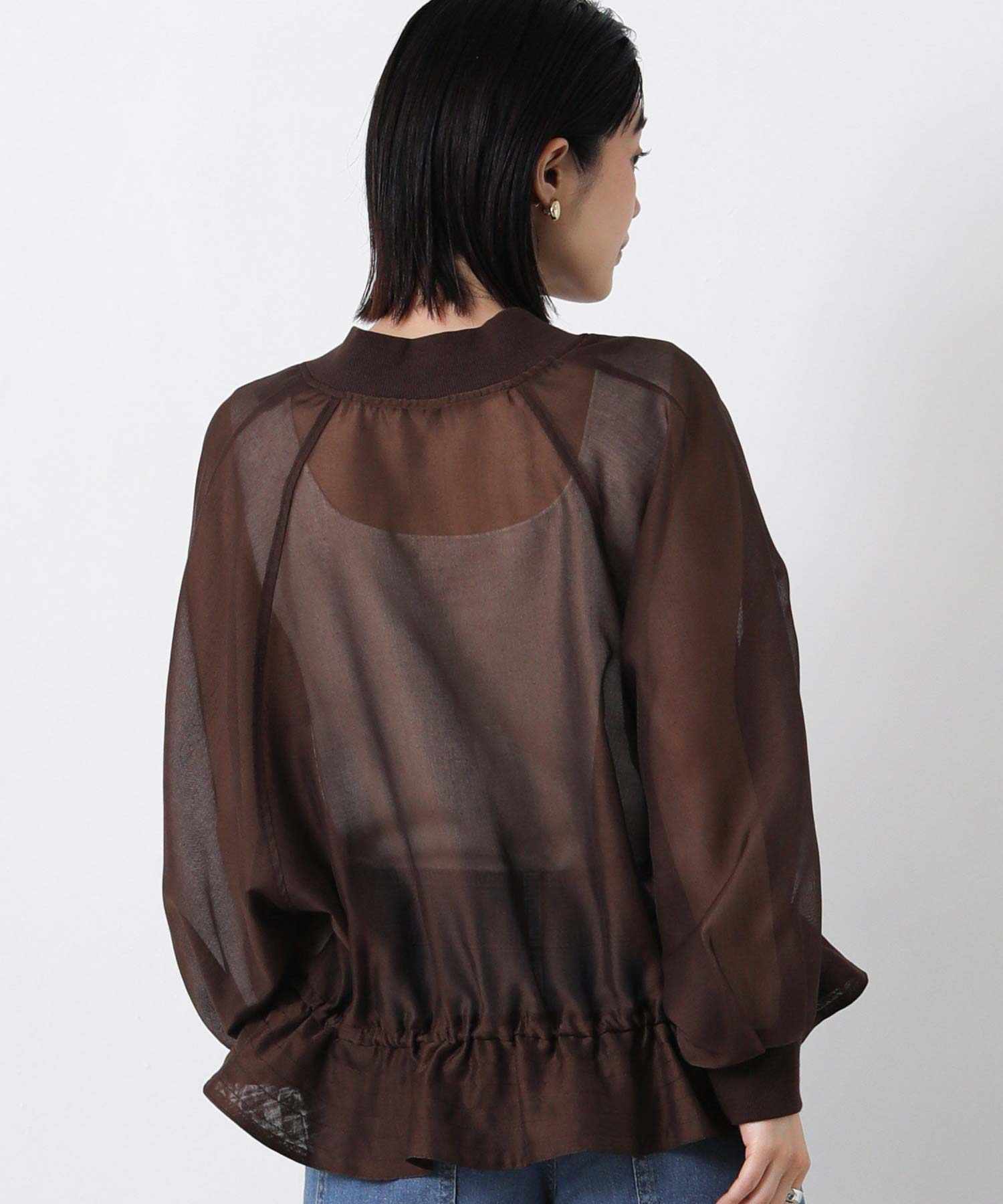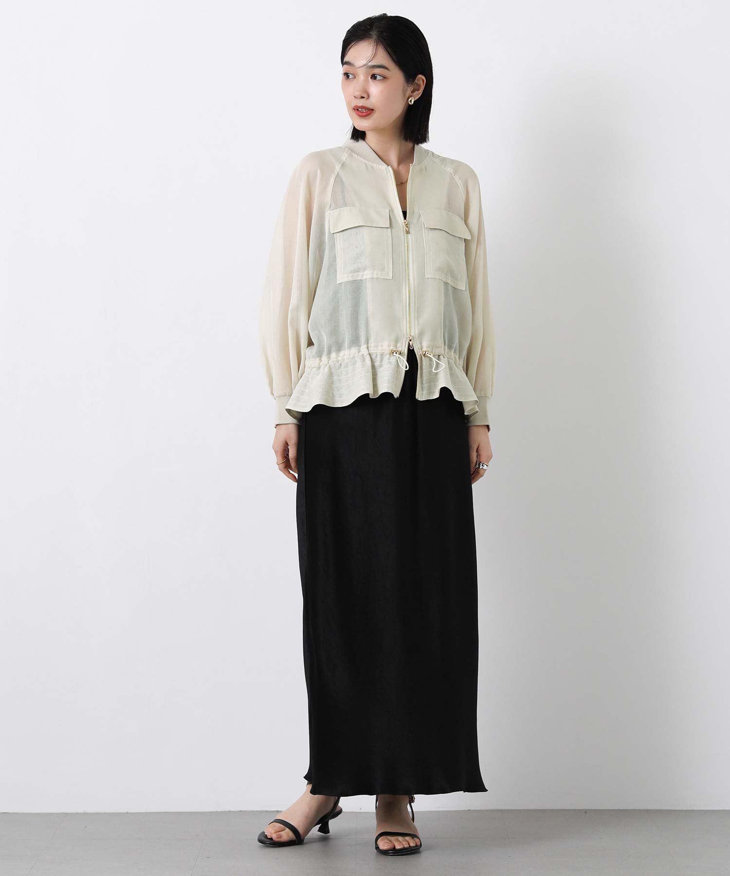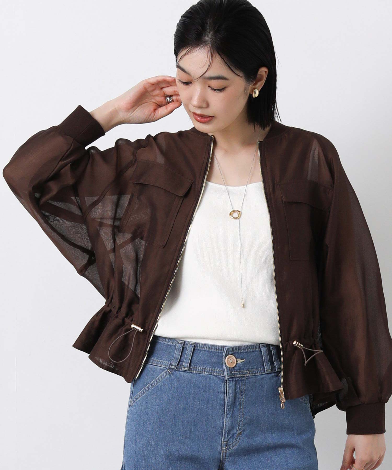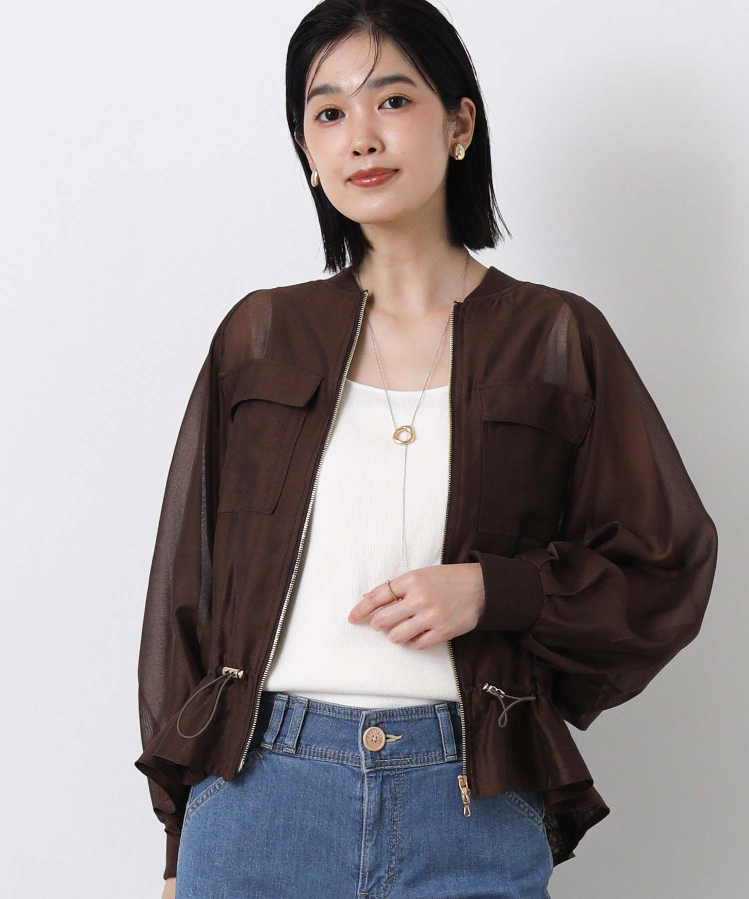 クリアな光沢感が上品なシアーブルゾン。