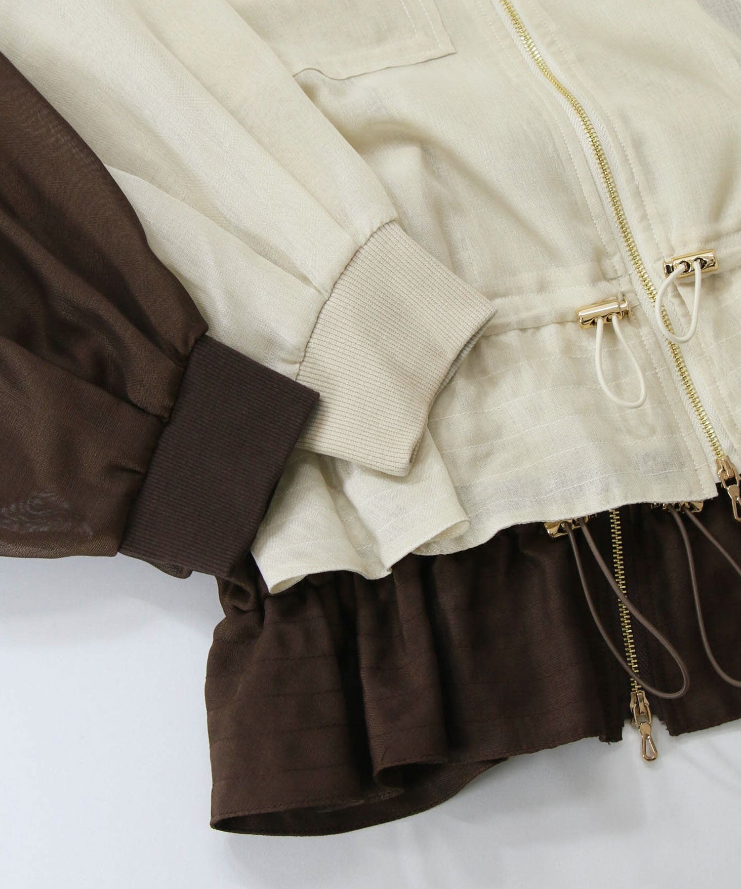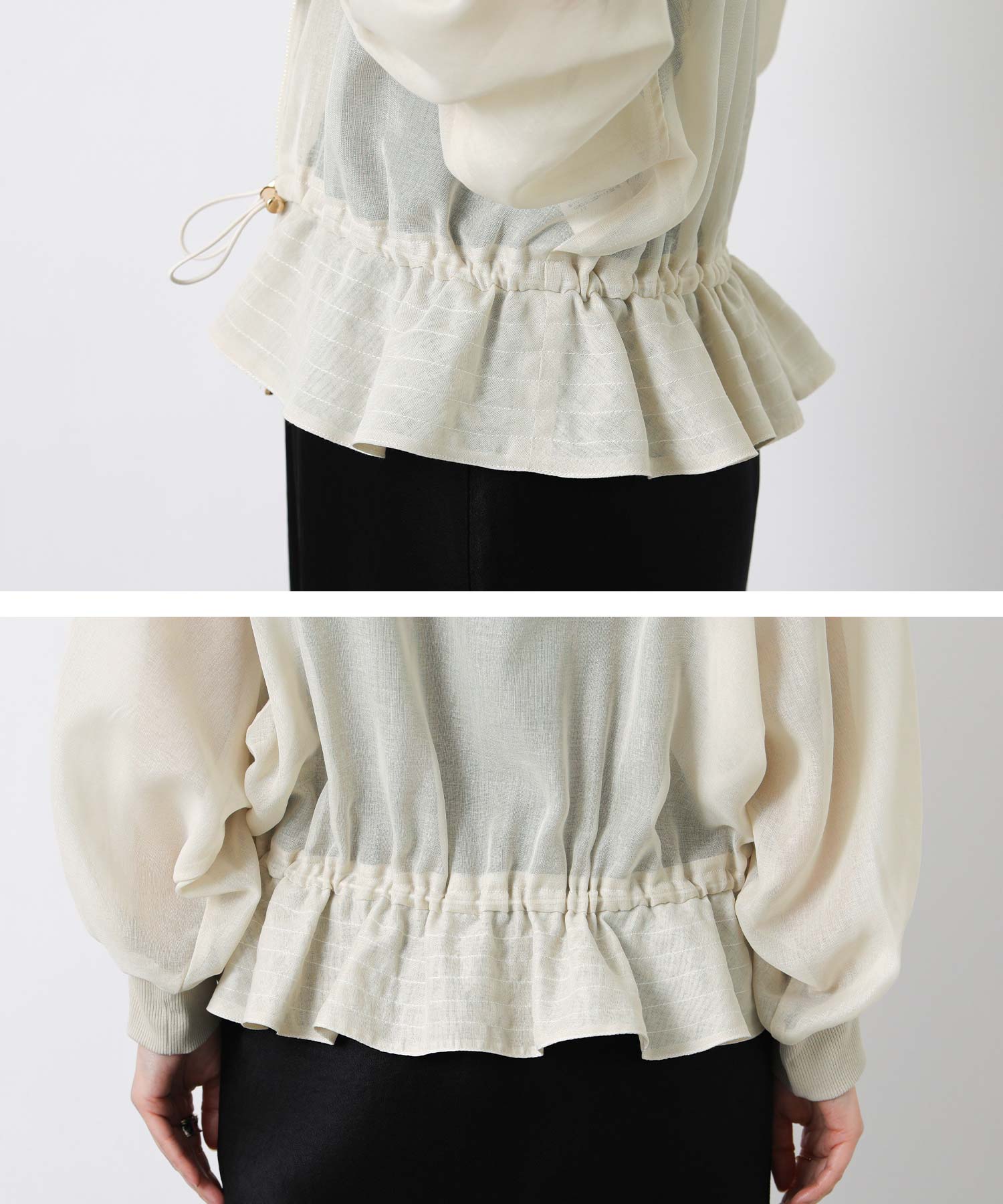 ベプラム切り替え部分にはドローコードが付いており、シルエットを調節できます。