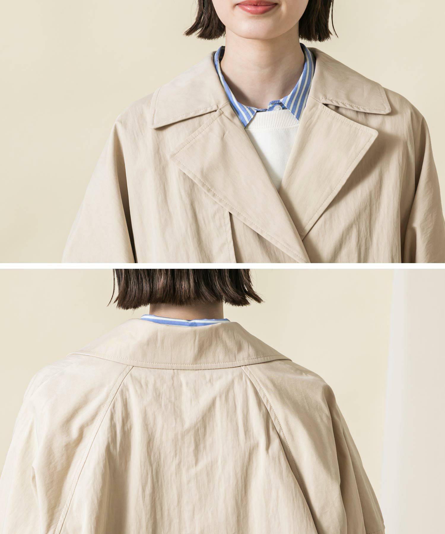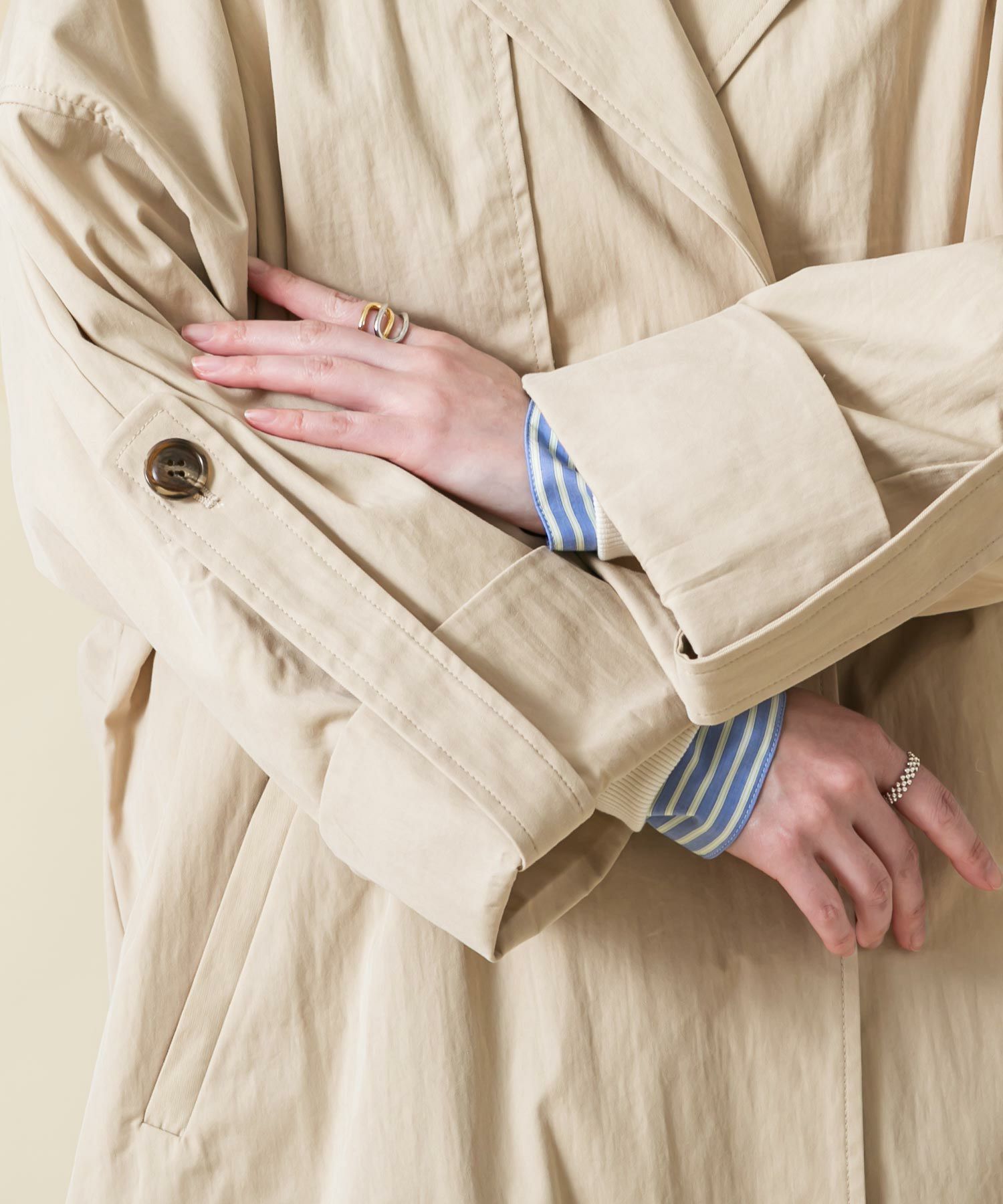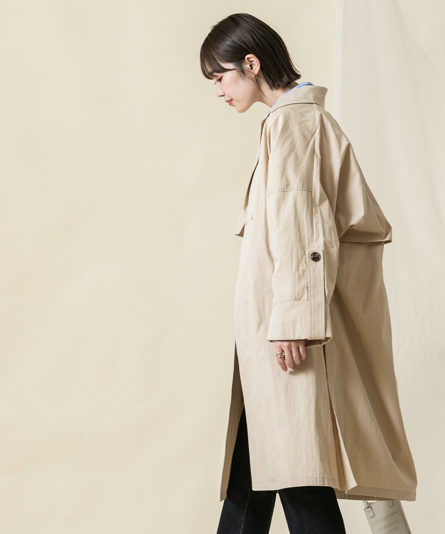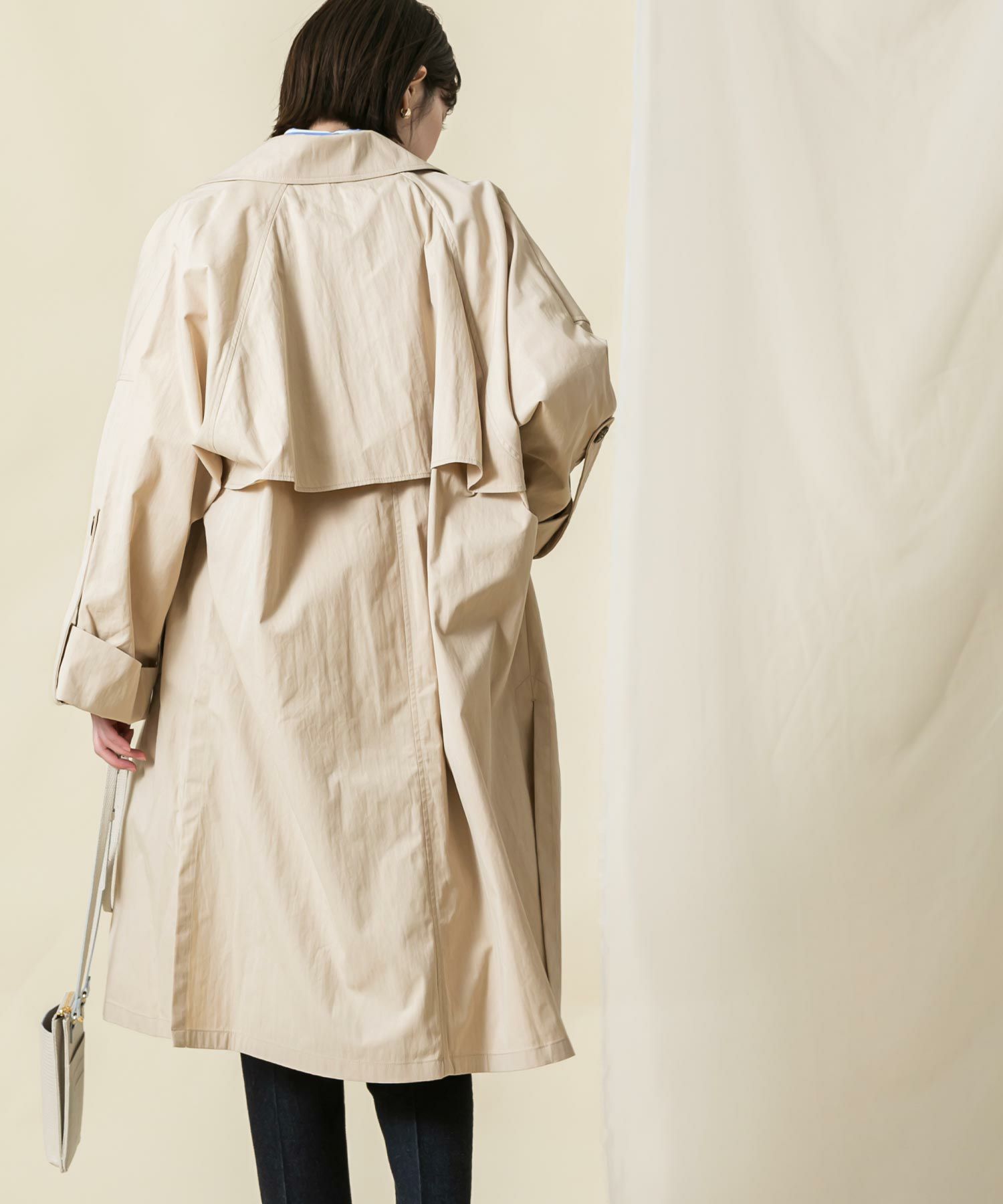 トレンド感のあるワイドなシルエットに、トレンチコートをベースとしてアレンジされたデザインになっています。サイドにはスリットが入っており、裾に動きがでるシルエットです。カジュアルになりすぎないように、ナイロンが入ったなめらかな風合いと、表面のシボがこなれ感のある生地を選んでいます。