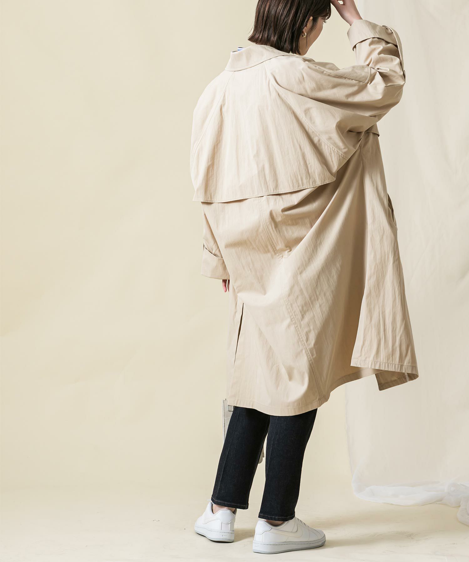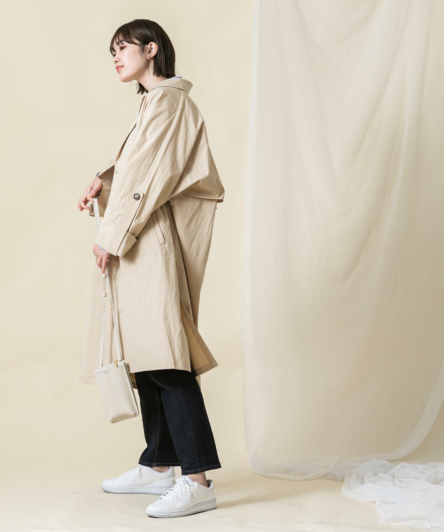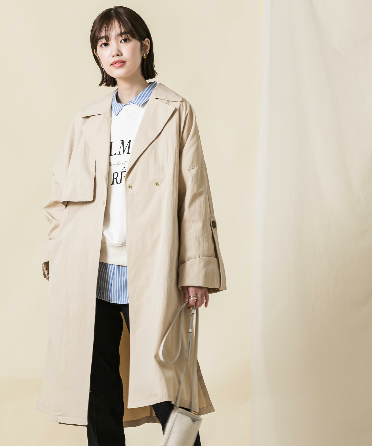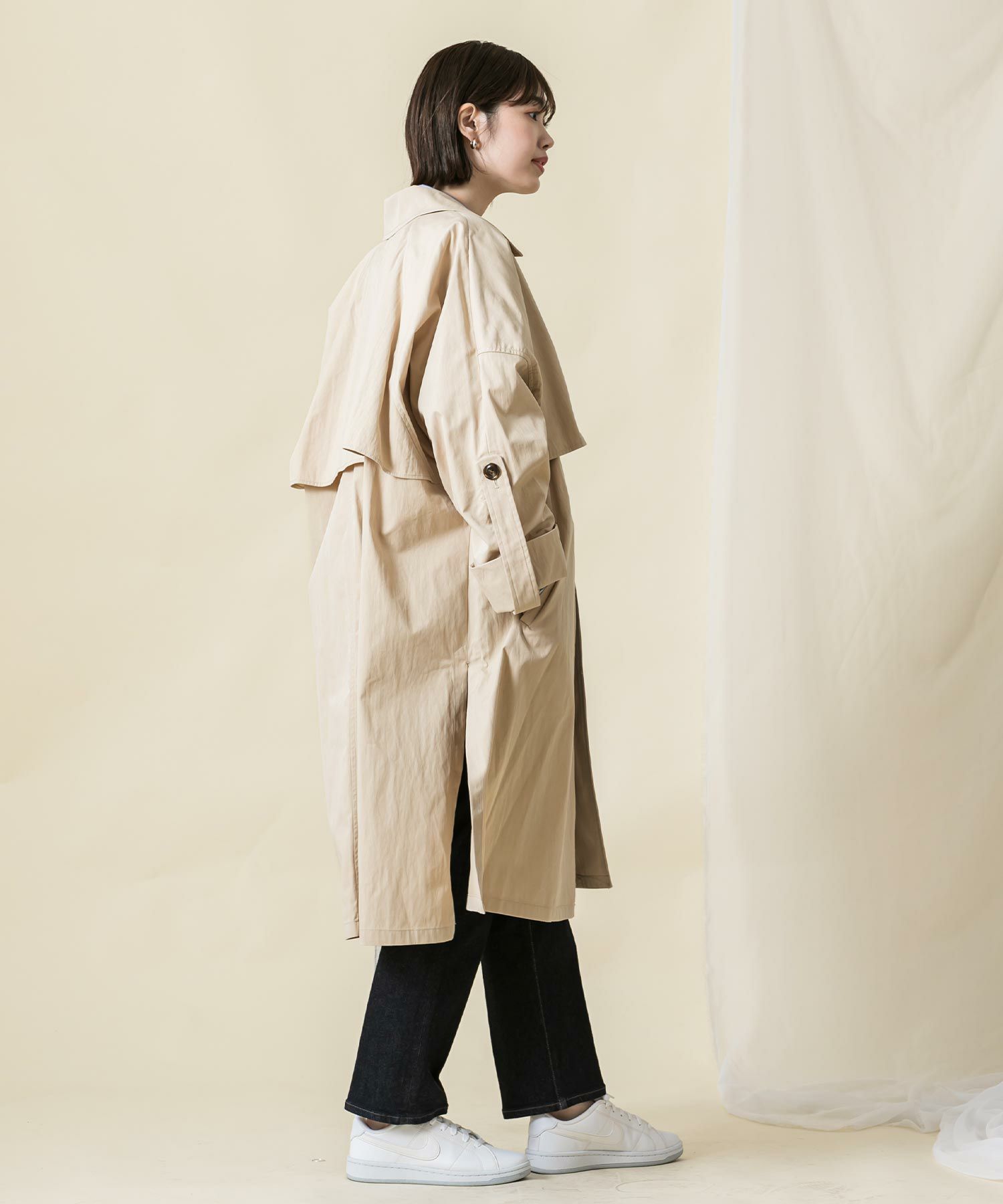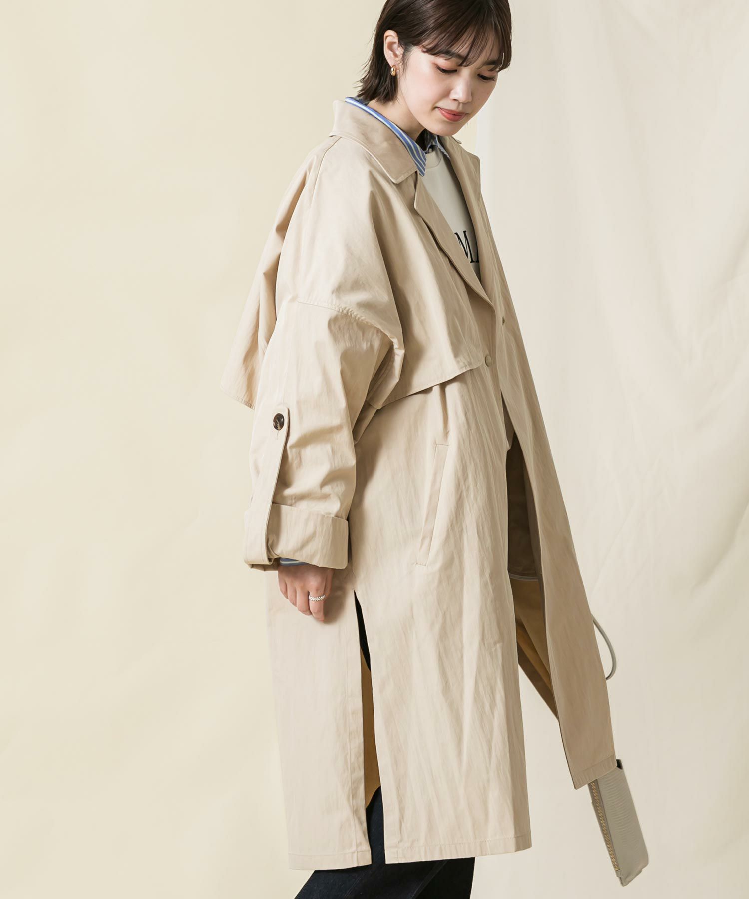 トレンド感のあるワイドなシルエットに、トレンチコートをベースとしてアレンジされたデザインになっています。サイドにはスリットが入っており、裾に動きがでるシルエットです。カジュアルになりすぎないように、ナイロンが入ったなめらかな風合いと、表面のシボがこなれ感のある生地を選んでいます。