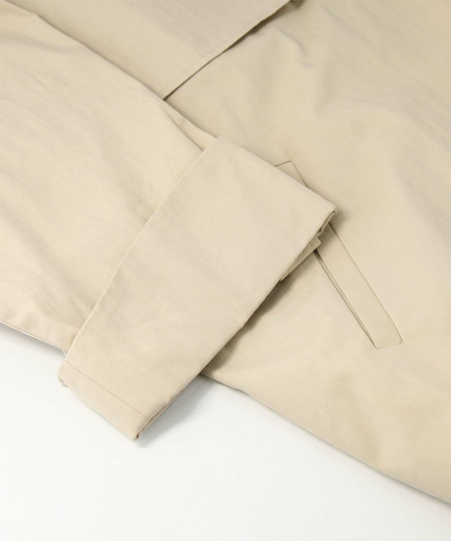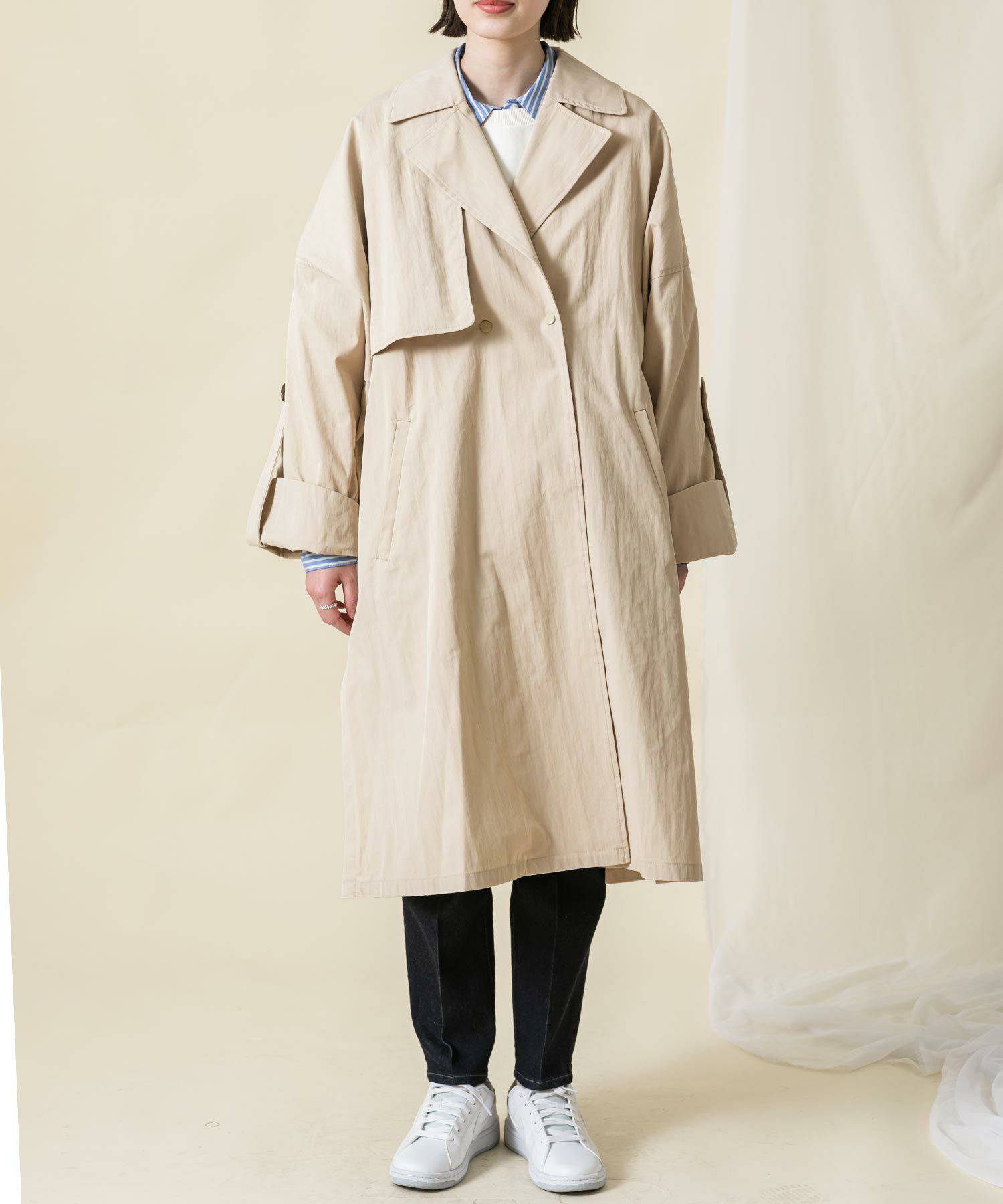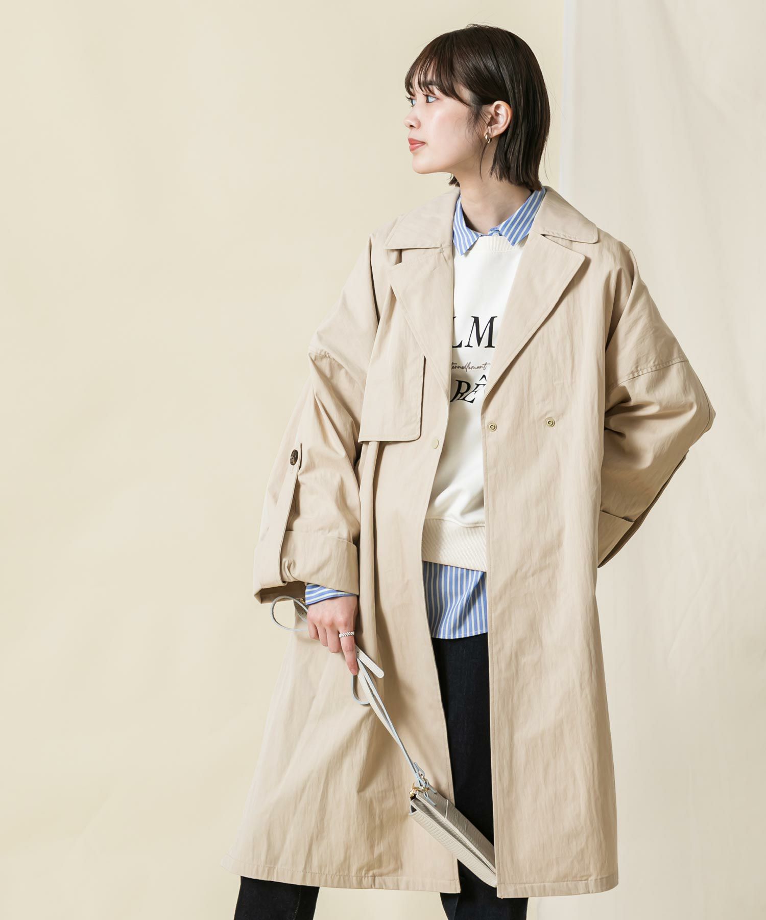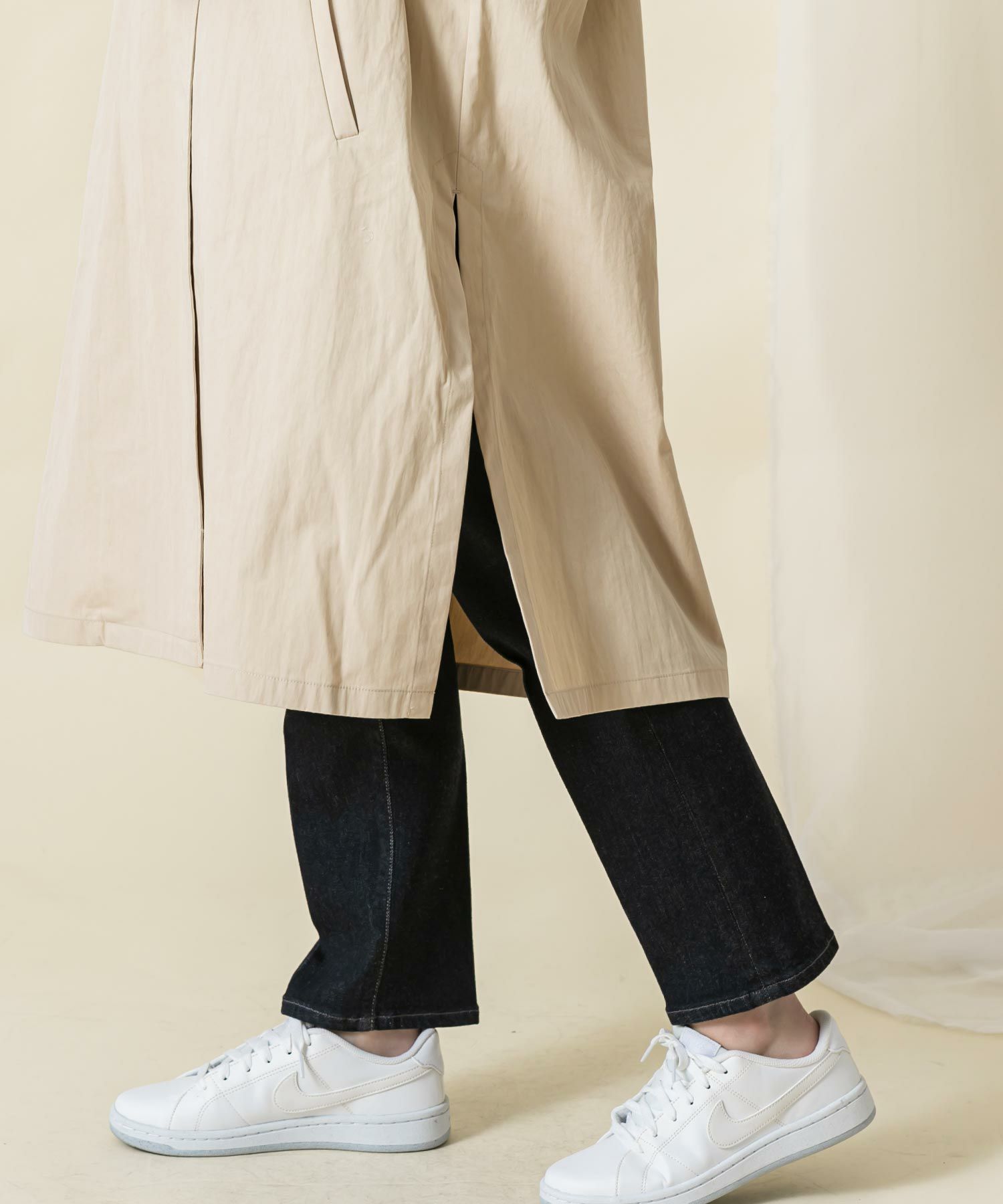 トレンド感のあるワイドなシルエットに、トレンチコートをベースとしてアレンジされたデザインになっています。サイドにはスリットが入っており、裾に動きがでるシルエットです。カジュアルになりすぎないように、ナイロンが入ったなめらかな風合いと、表面のシボがこなれ感のある生地を選んでいます。