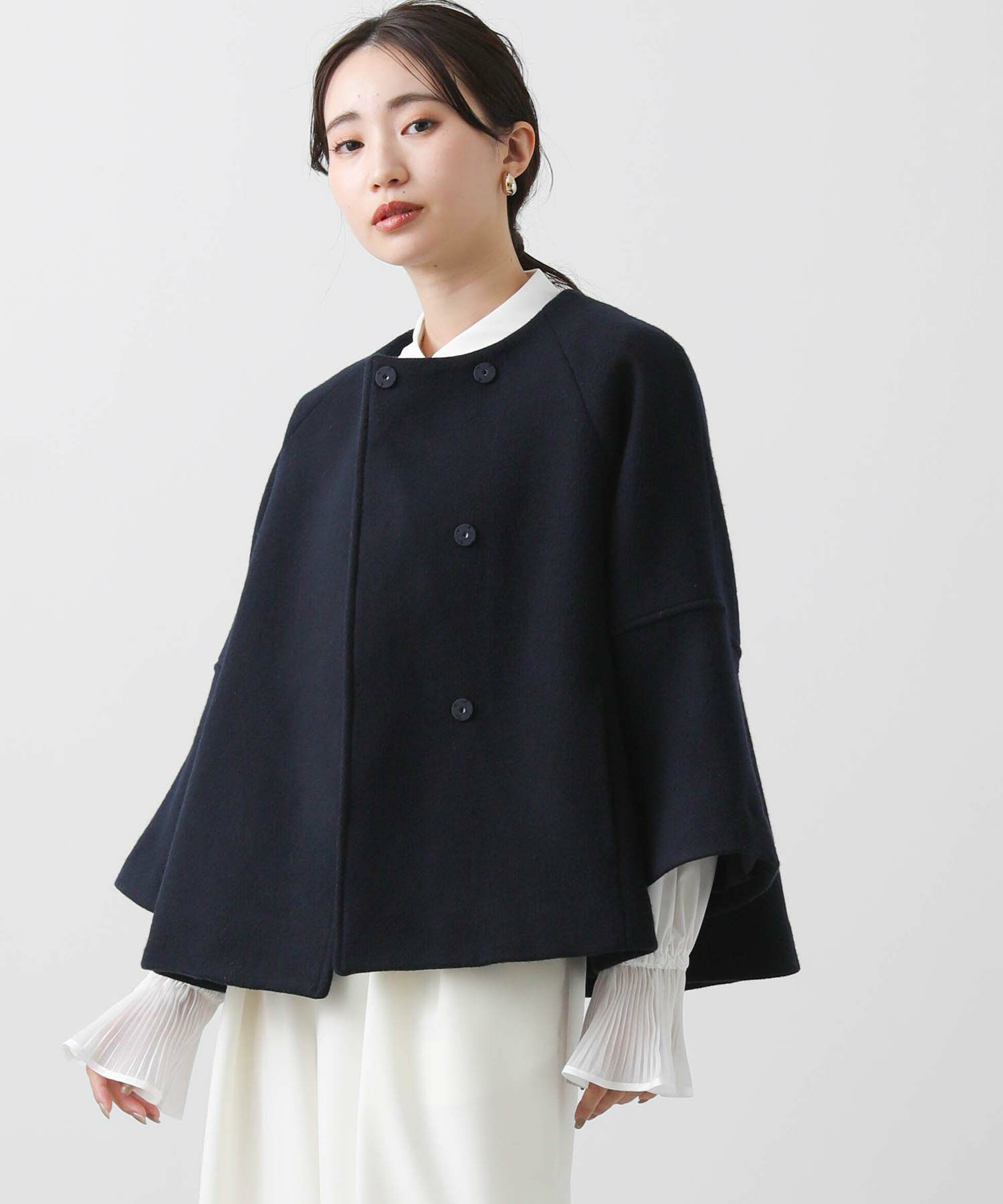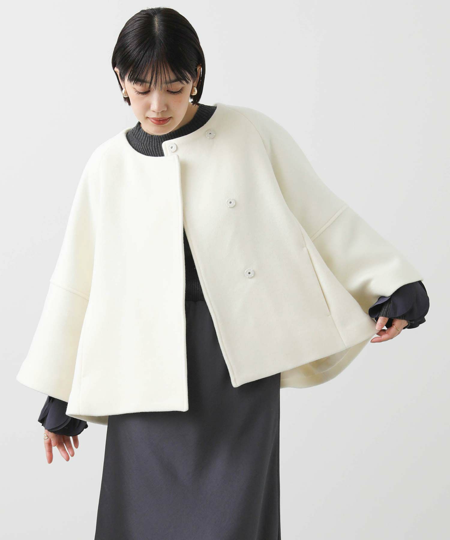 今季トレンドのケープ型デザインがかわいいコート。二十織のふっくらしたコート地で、軽くてあたたかい素材感が魅力です。