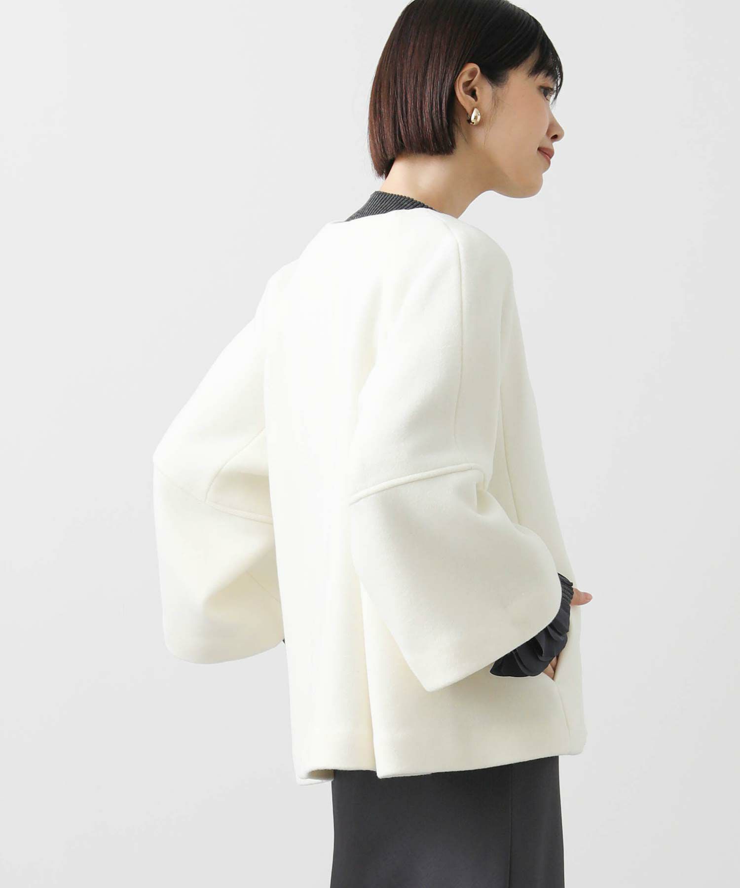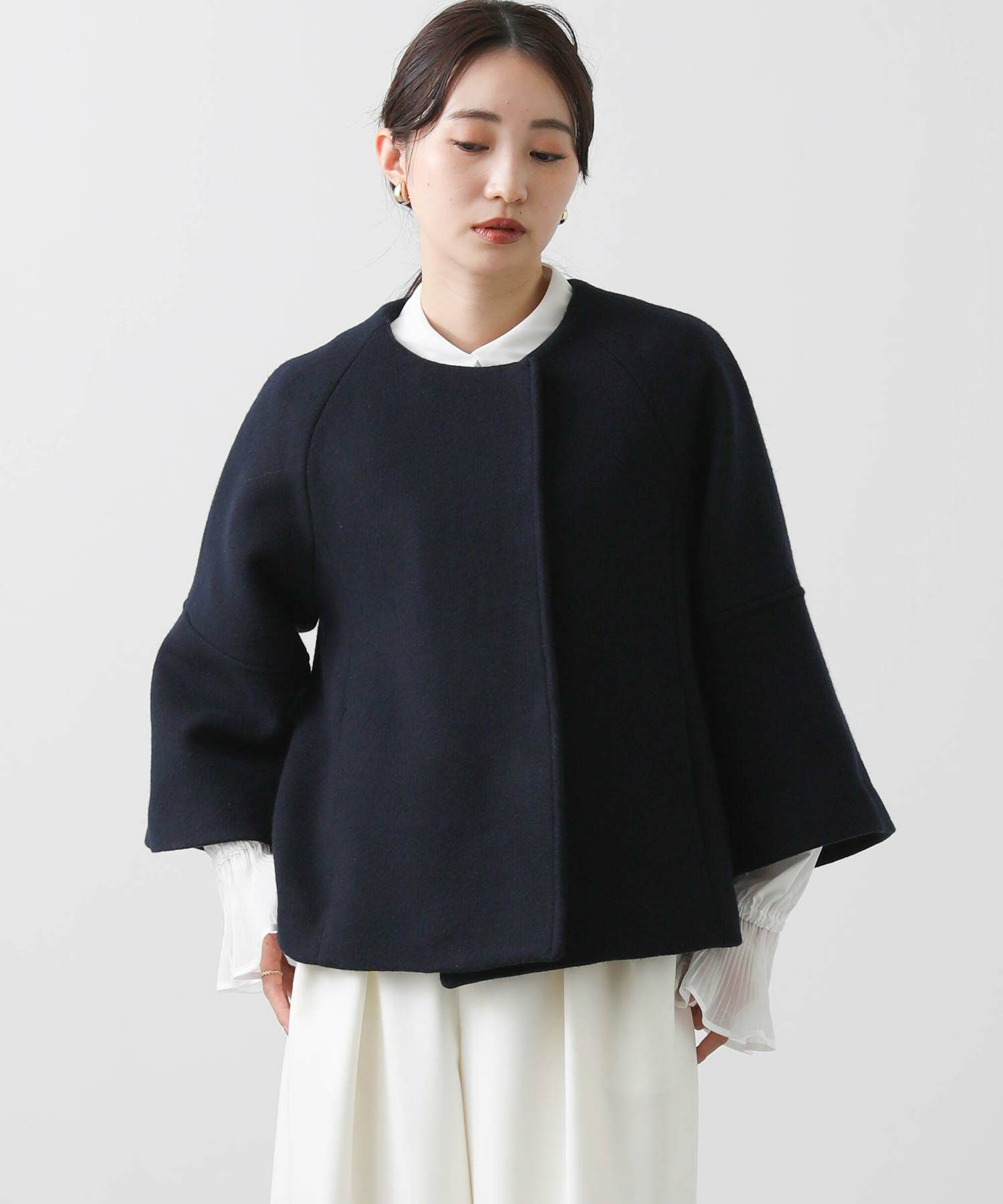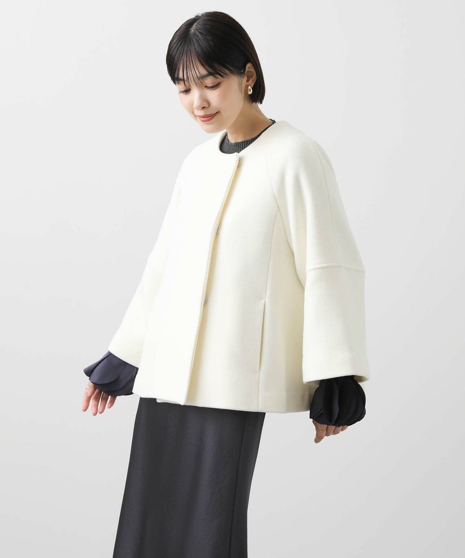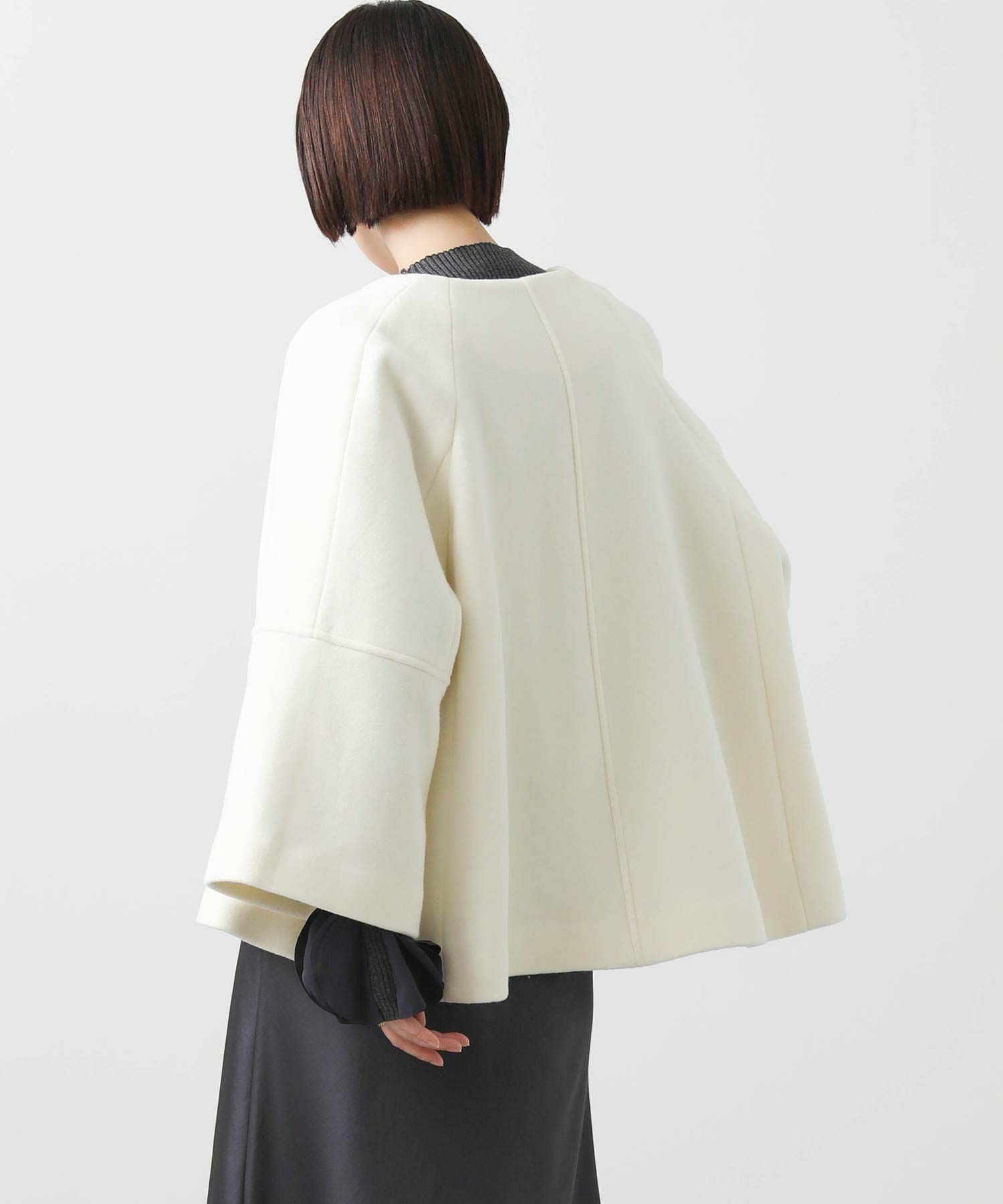 短めの着丈でどんなボトムともバランスが良いシルエットに仕上げました。上品な素材とトレンド感のあるAラインのシルエットが冬のスタイリングを彩ります。
