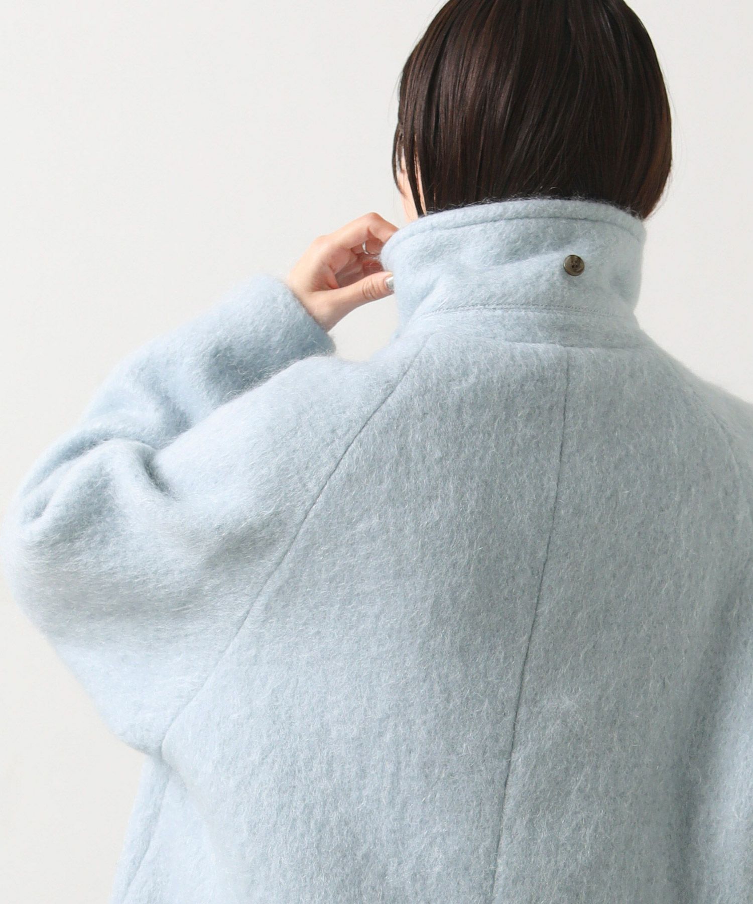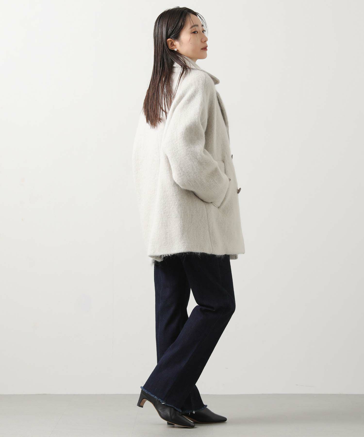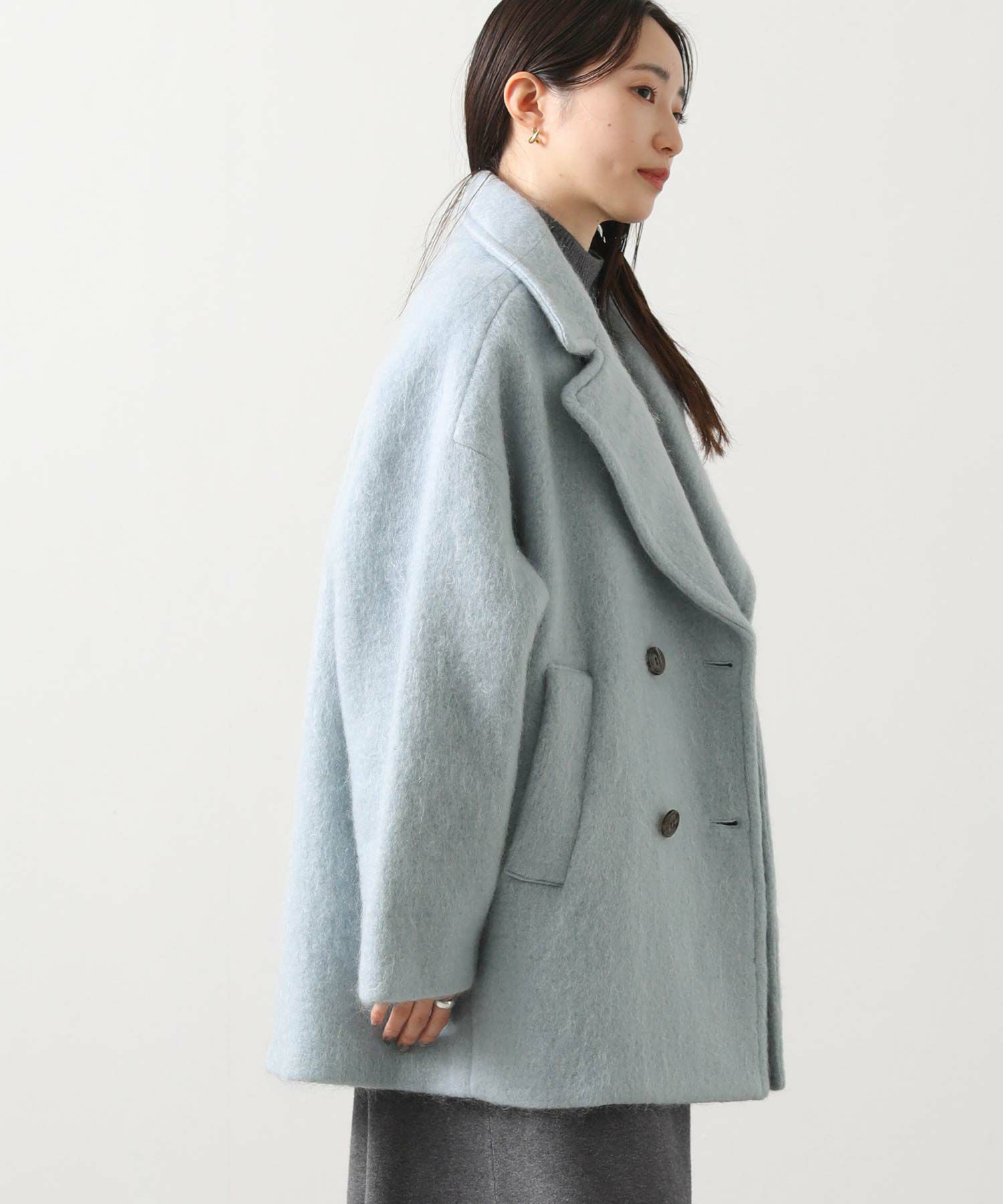 大きめの襟にミドル丈が絶妙なバランスのモヘヤシャギーPコート。