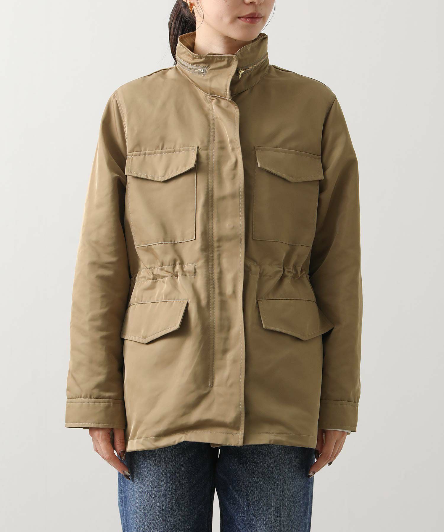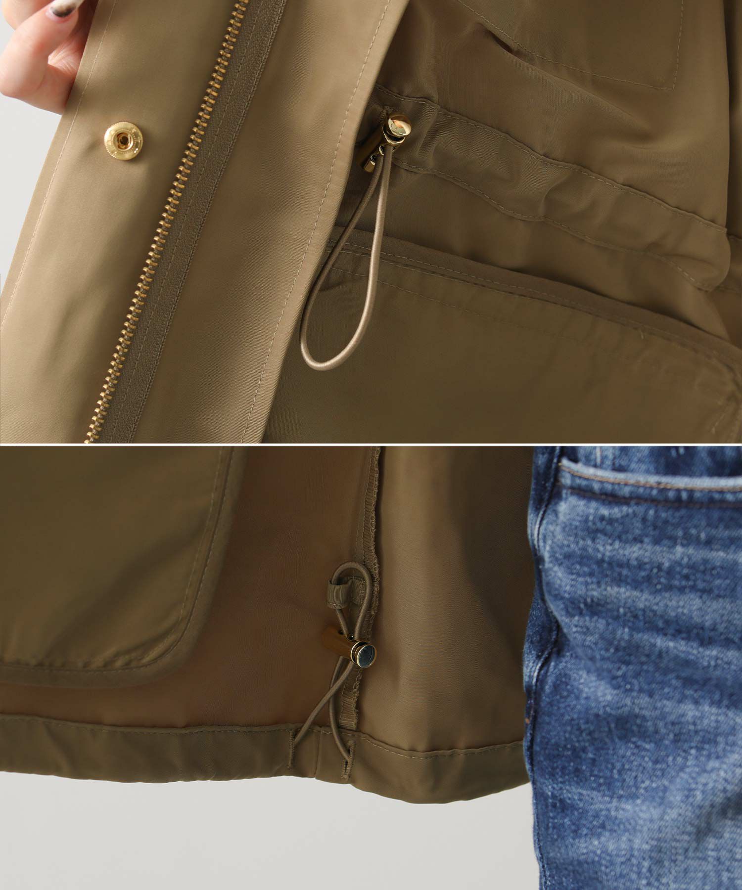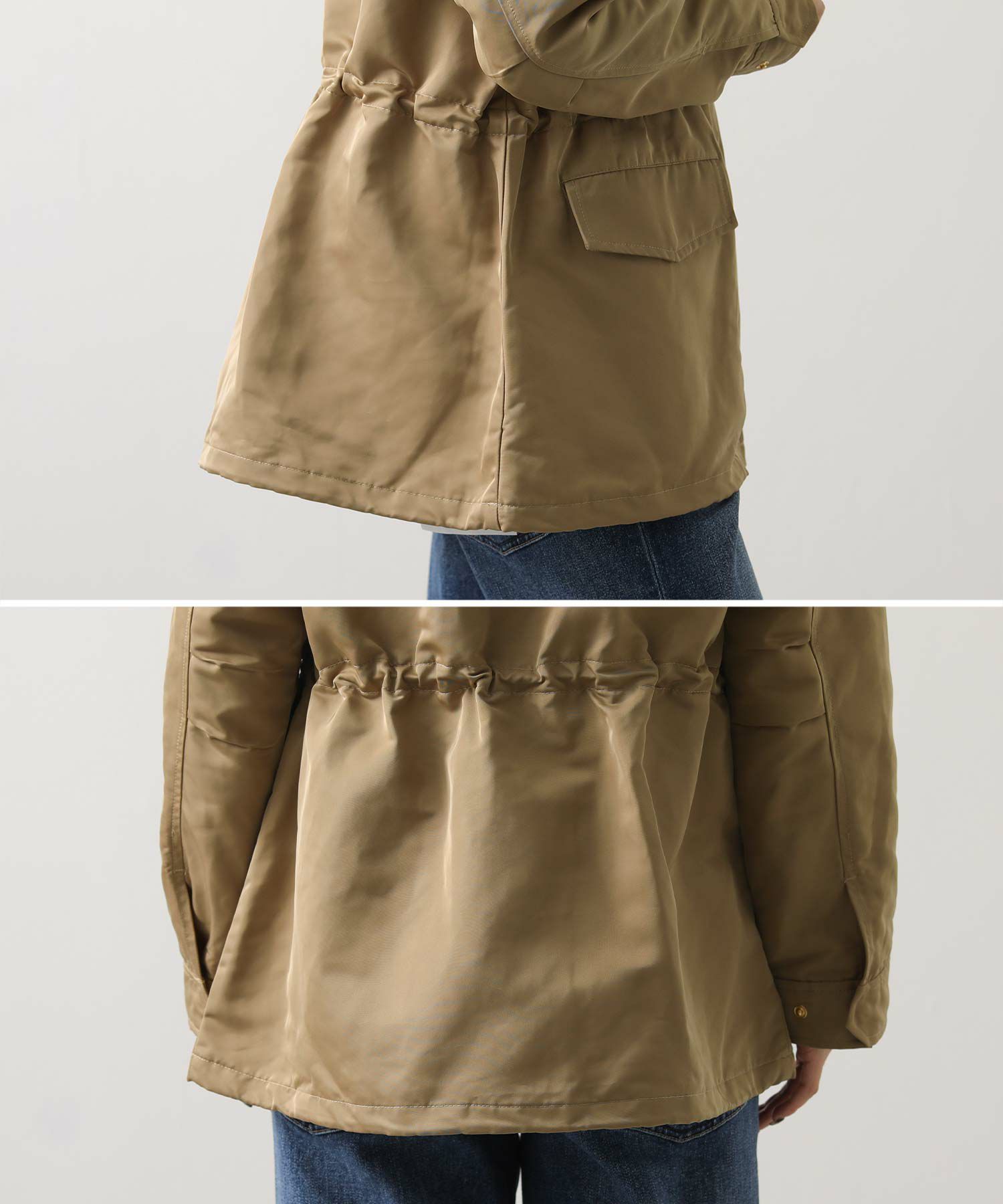 ウエストと裾はドロストで、気分やコーデに合わせてシルエットを変えられます。 フードは収納可能、しまってスタンドネックにすればスッキリとした印象に。