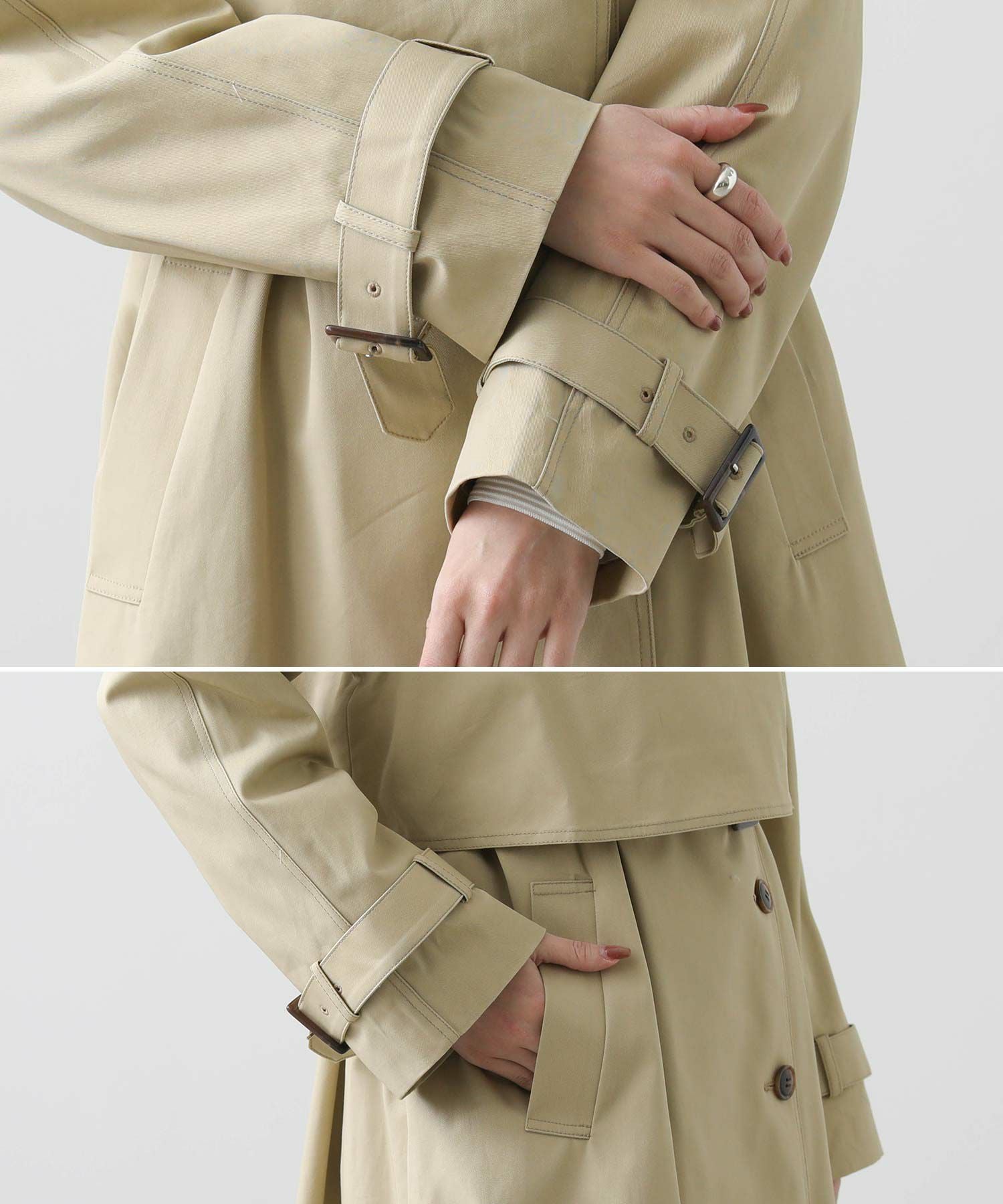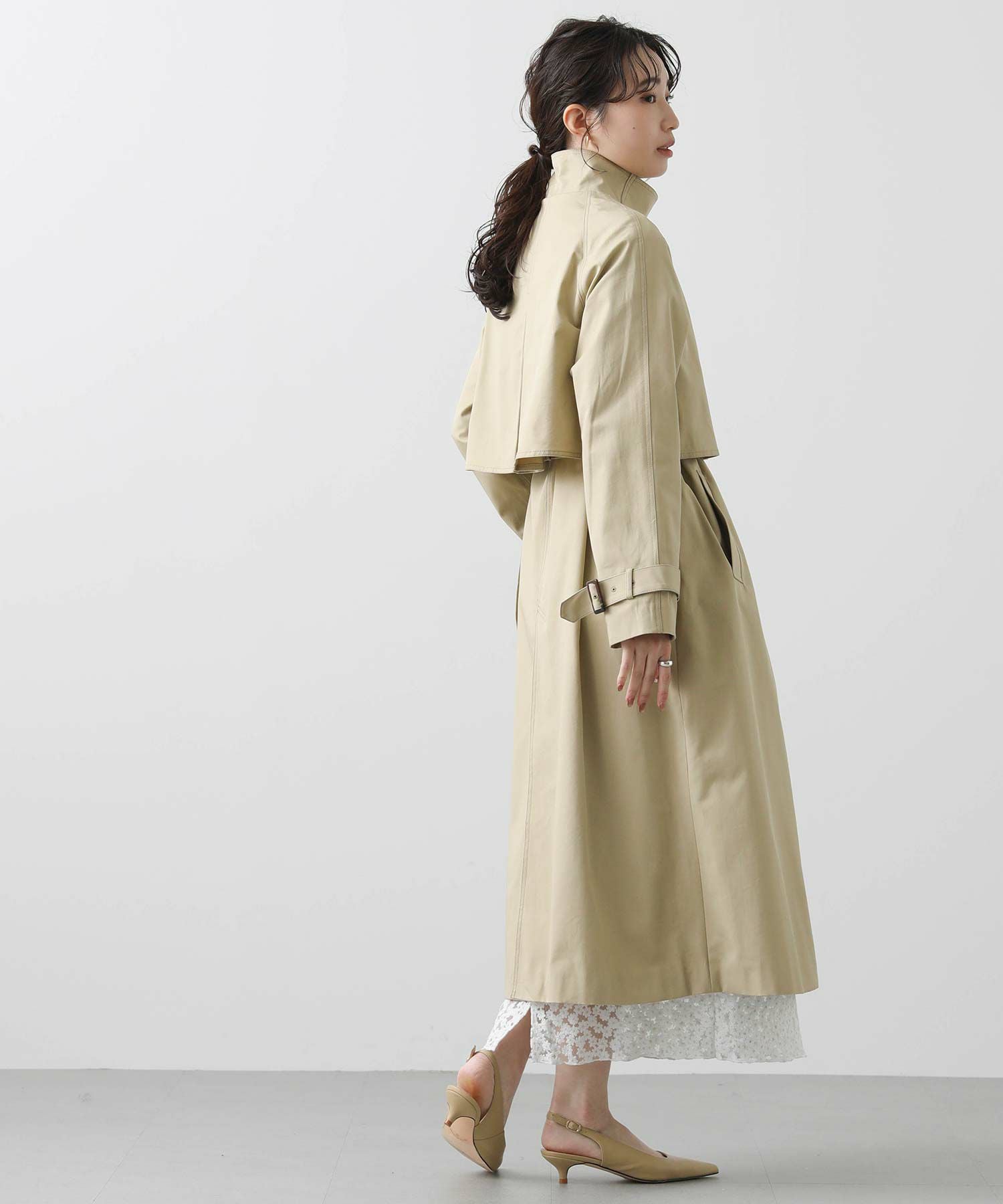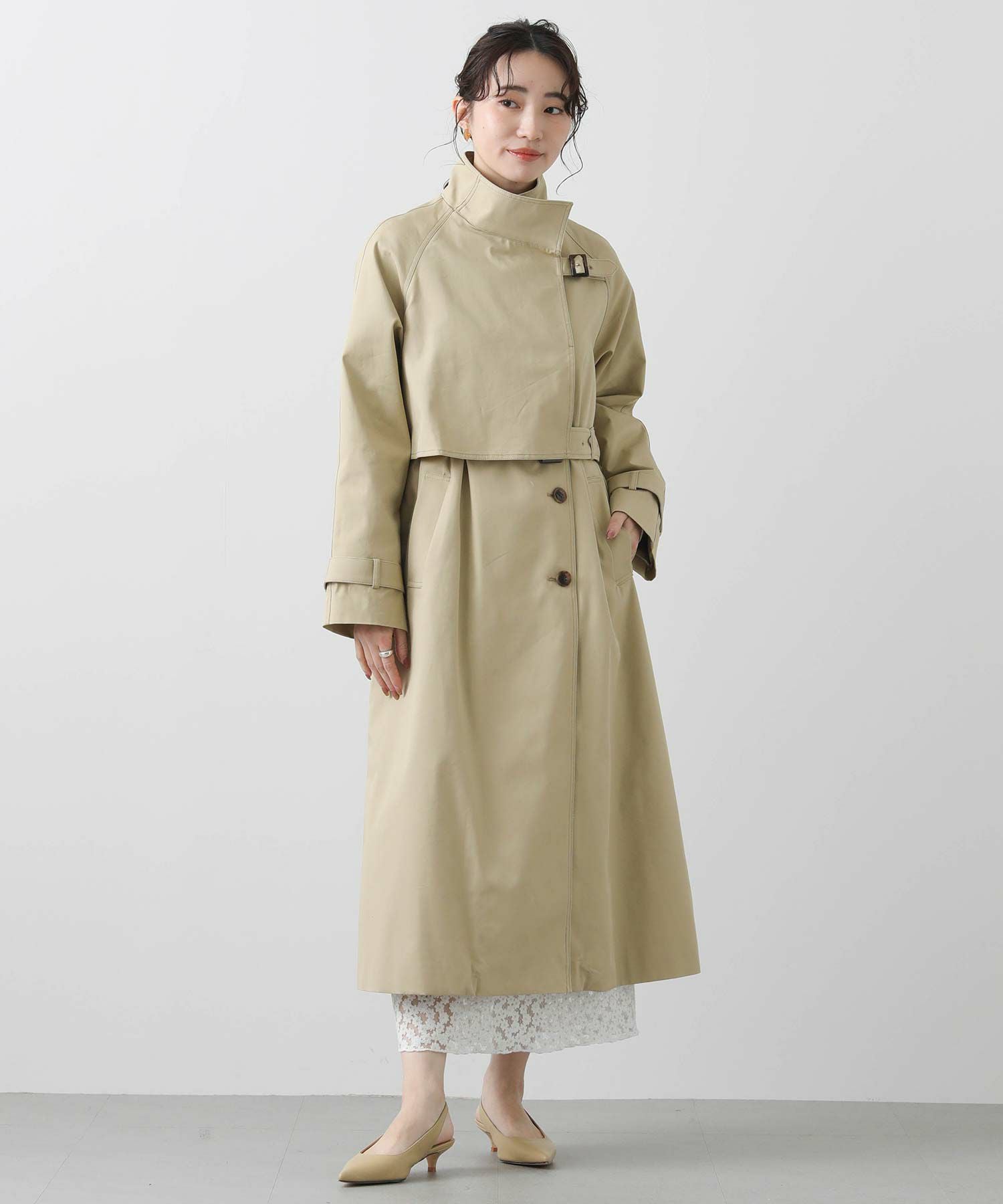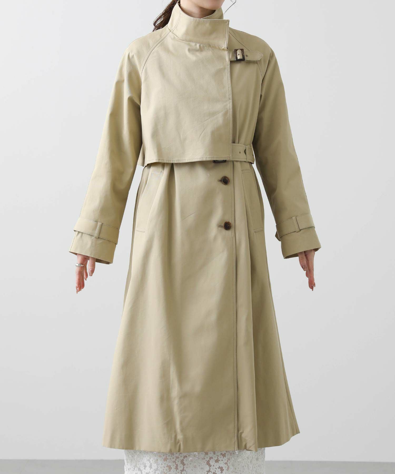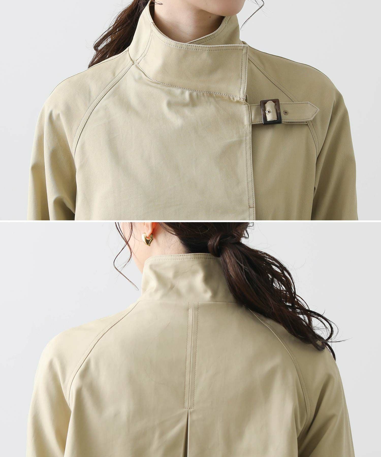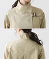 適度なハリがありながら、しなやかで柔らかい肌触りとナチュラルな光沢感がスタイリングを格上げしてくれます。そのままサラッと羽織っても襟元がきまるようにデザインされているので、ラフに羽織っても、美しいフォルム感が洗練された雰囲気を演出してくれます。襟のベルトを閉めてスタンドカラーにした、トレンド感のある着こなしもおすすめ。着こなしに合わせて首元のニュアンスチェンジが楽しめます。