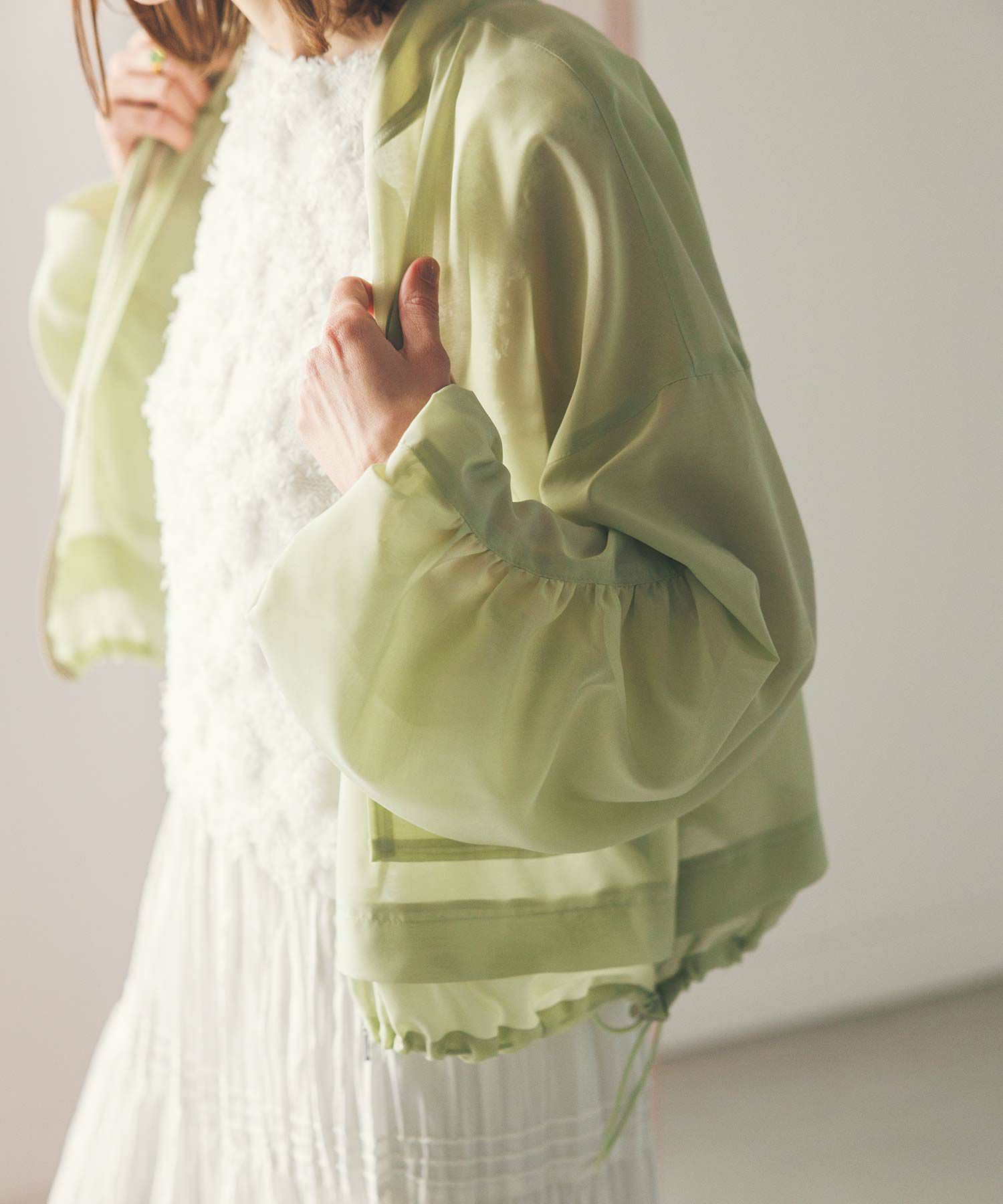 丸みのある立体的なパターンで、ふわっと羽織るだけでこなれ感の出るシルエットです。着回しやすい少し短めの着丈にボリュームのあるお袖が着こなしのポイントになってくれます。