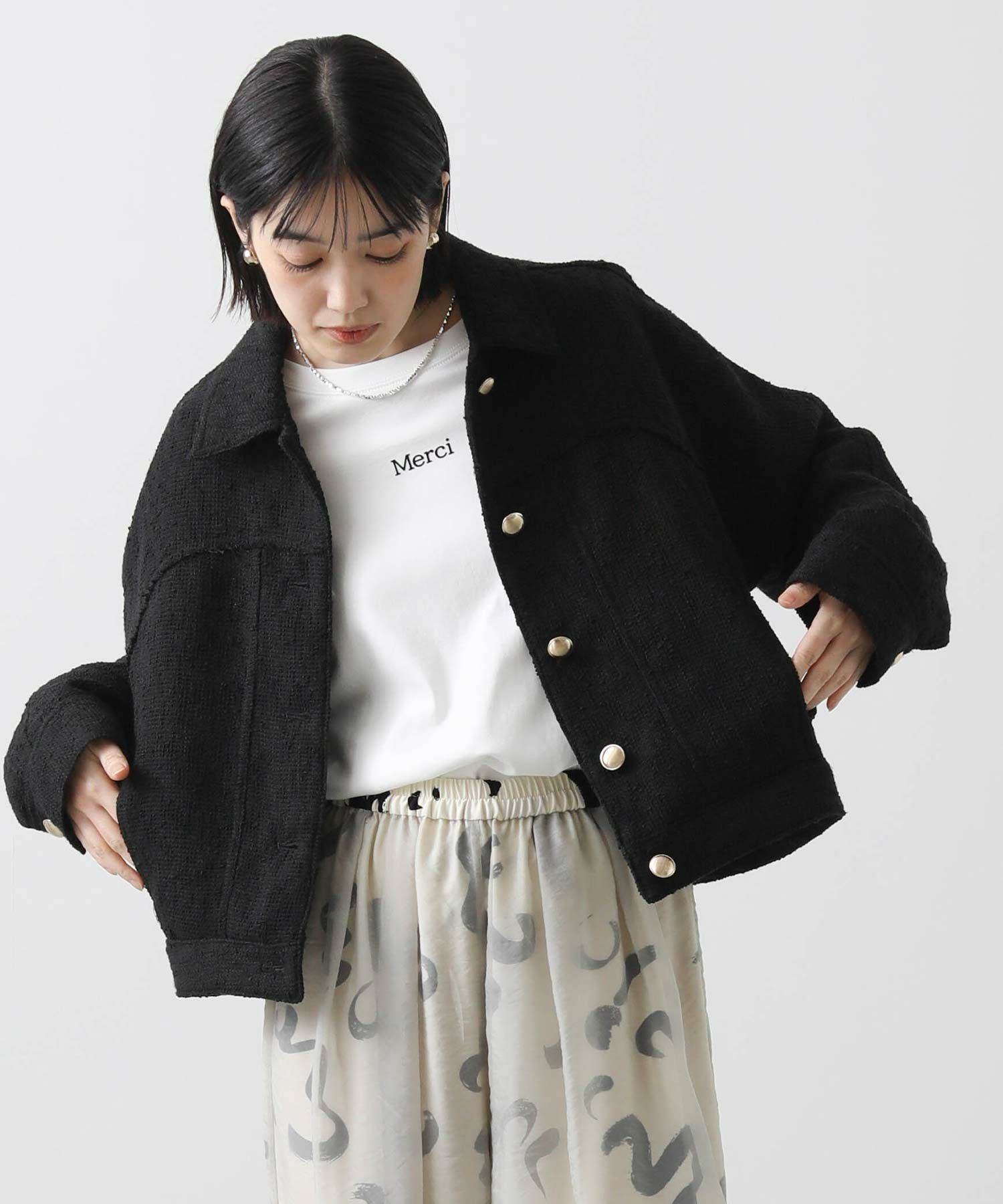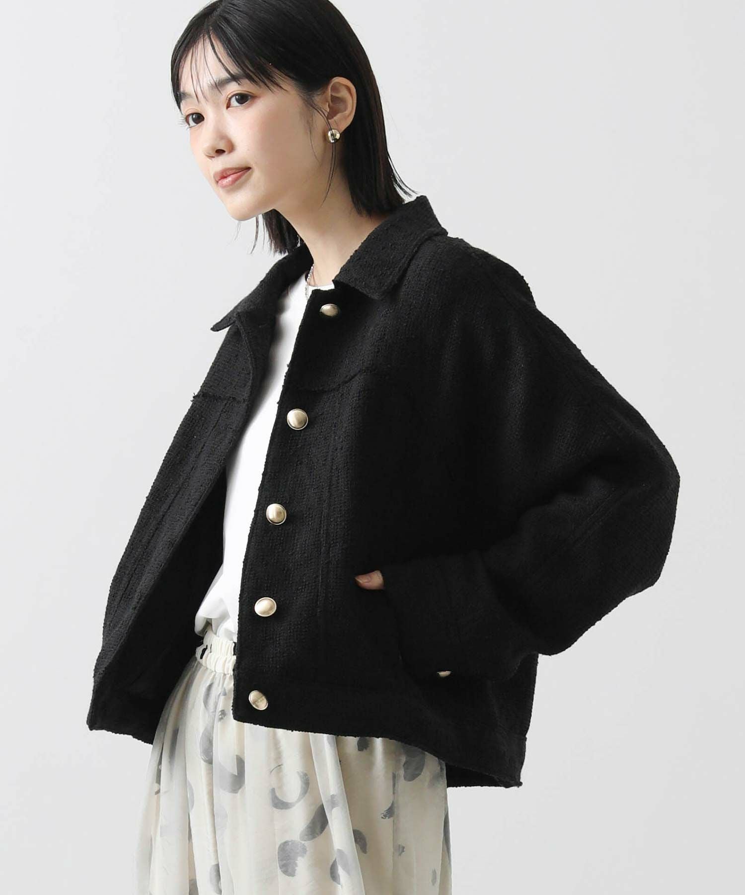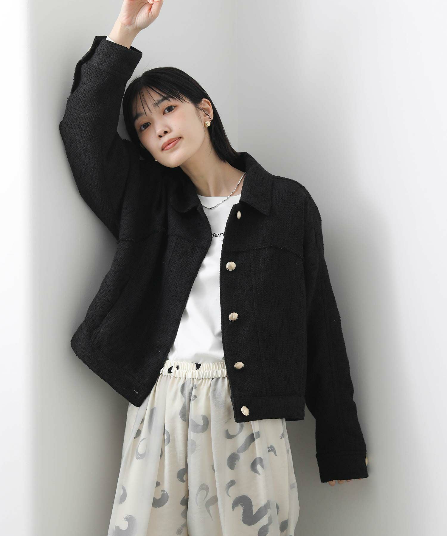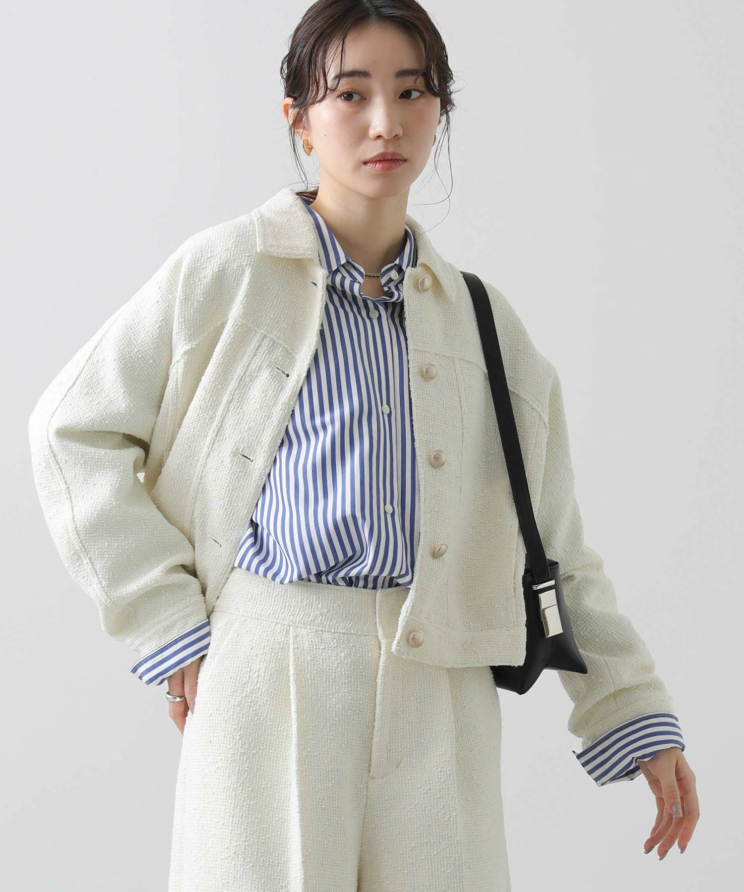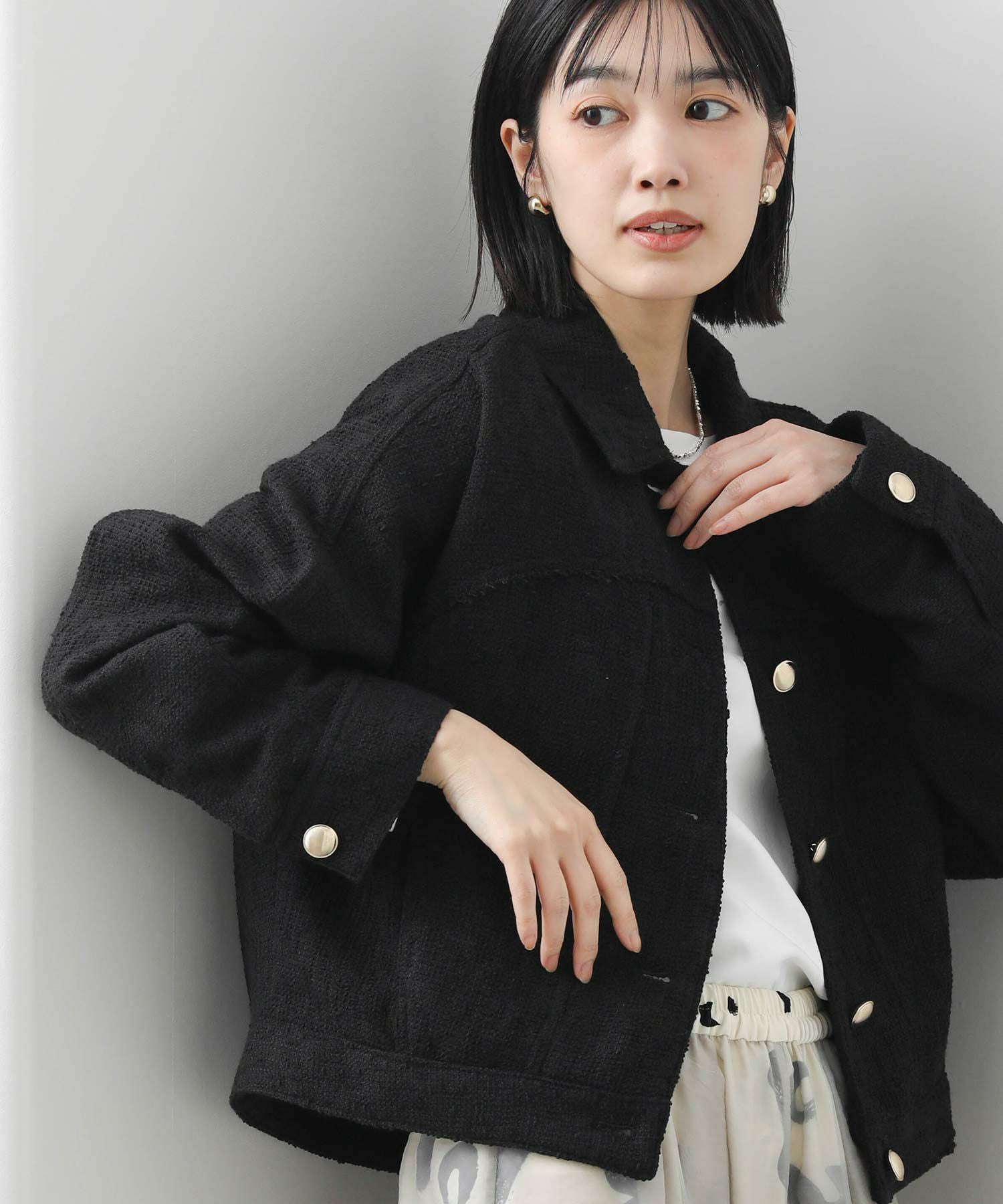 大きすぎないサイズ感が、ワイドボトムにも合わせやすく、カジュアルなコーデにさらっと羽織るとレディな着こなしに。