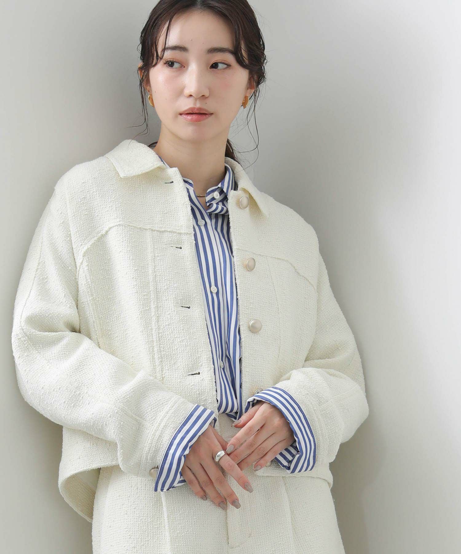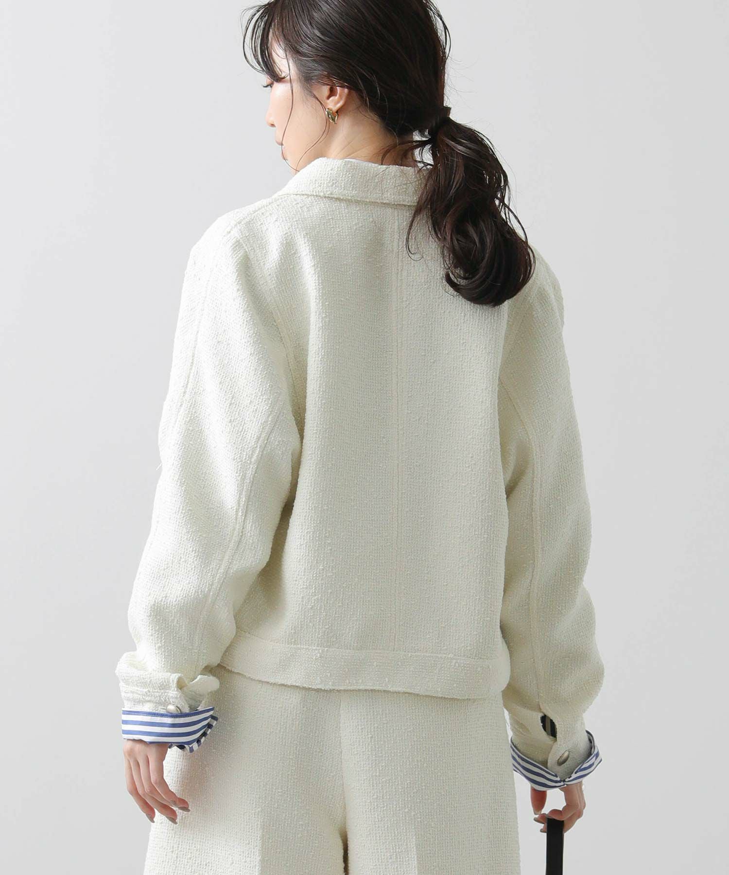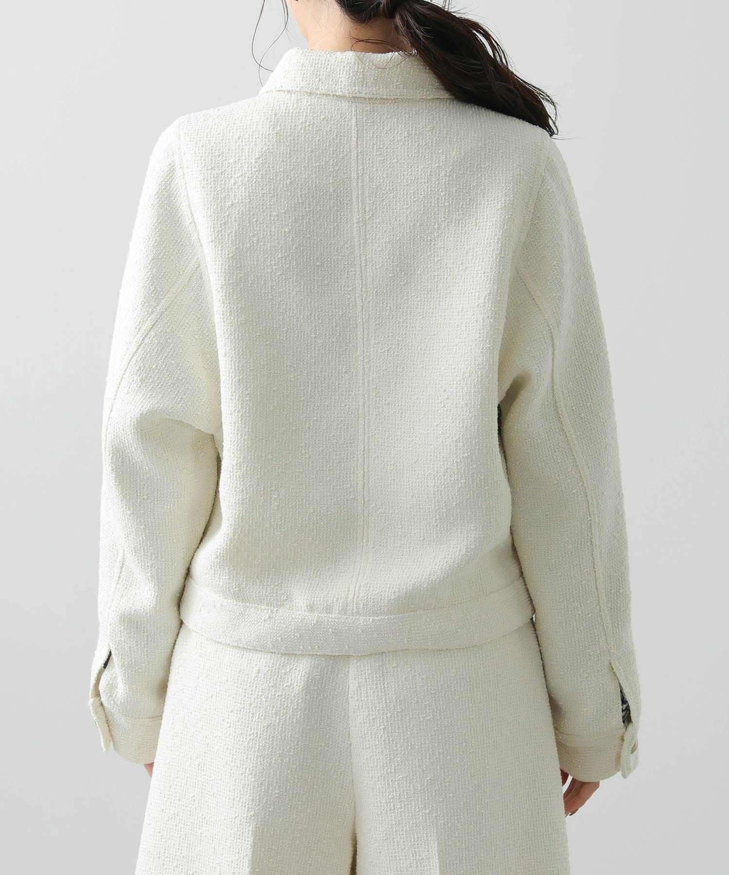 ツイード素材×カジュアルデザインのブルゾンで、クラシカルなユーティリティMIXなブルゾンに仕上げました。
