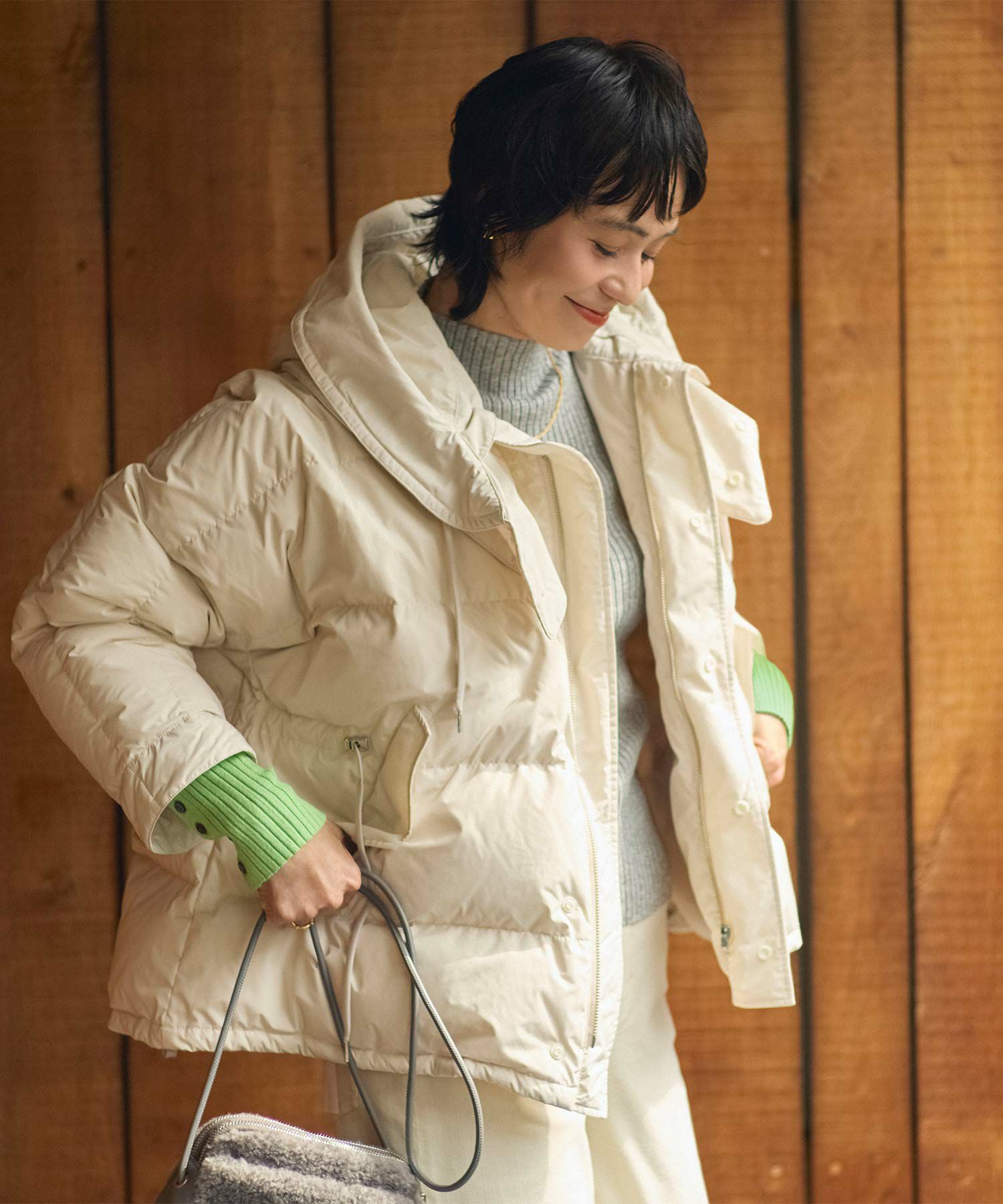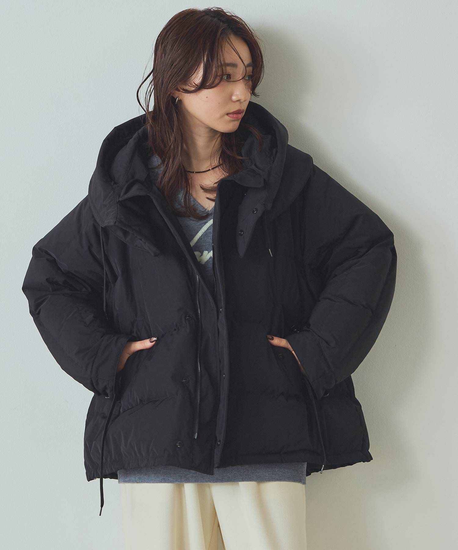 大人カジュアルを叶える、ドルマンシルエットのダウンジャケット。 ボリュームのある横型のシルエットが特徴です。顔周りにボリューム感の出るデザインがかわいいポイント。