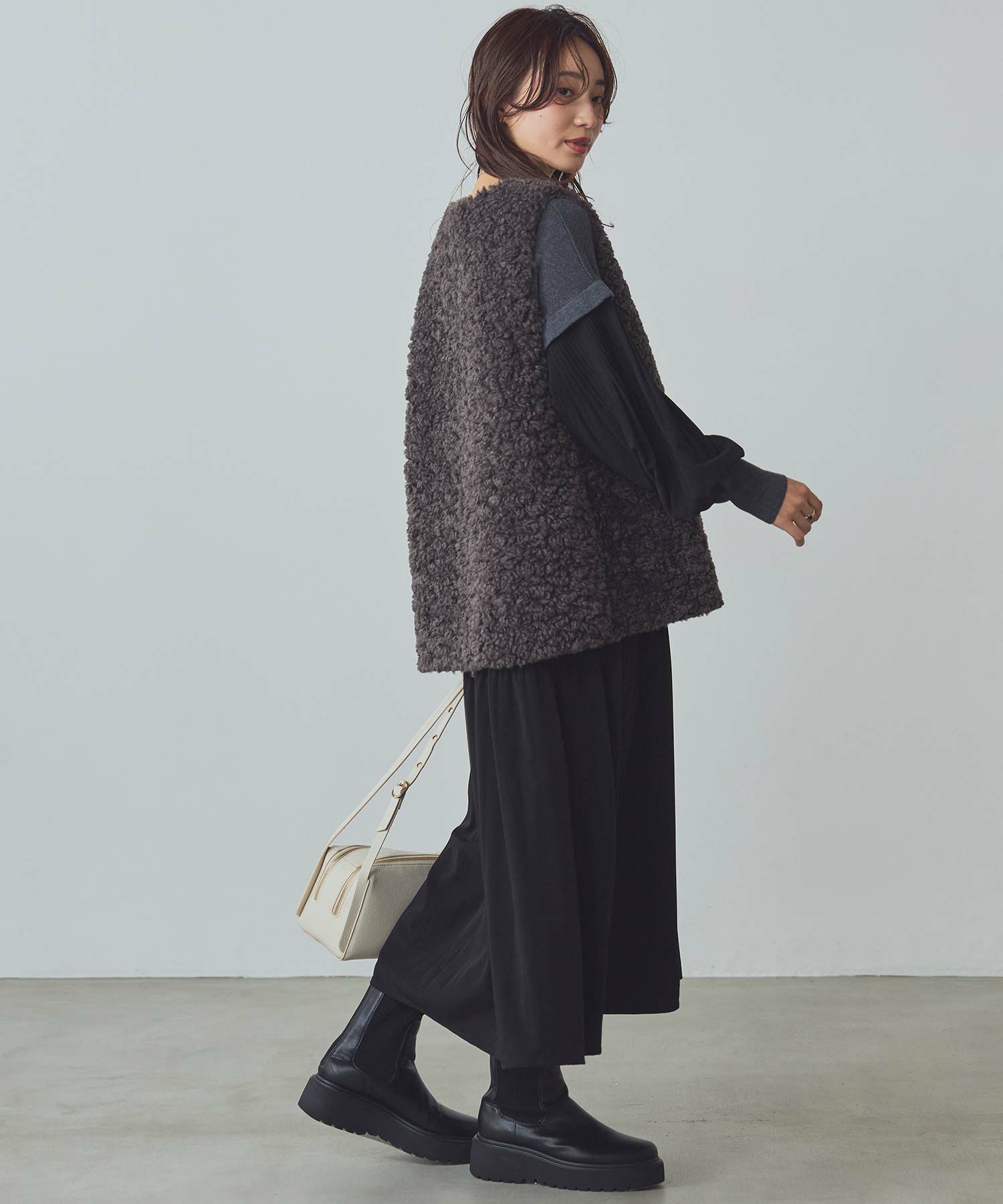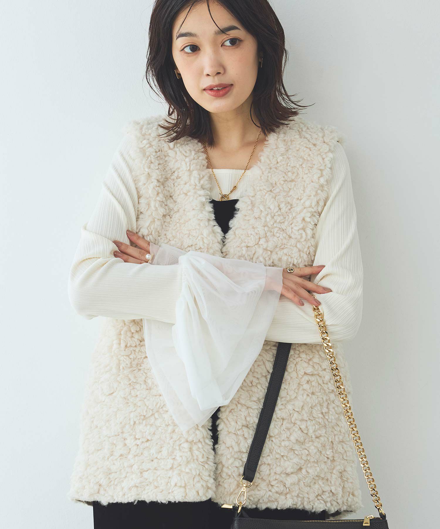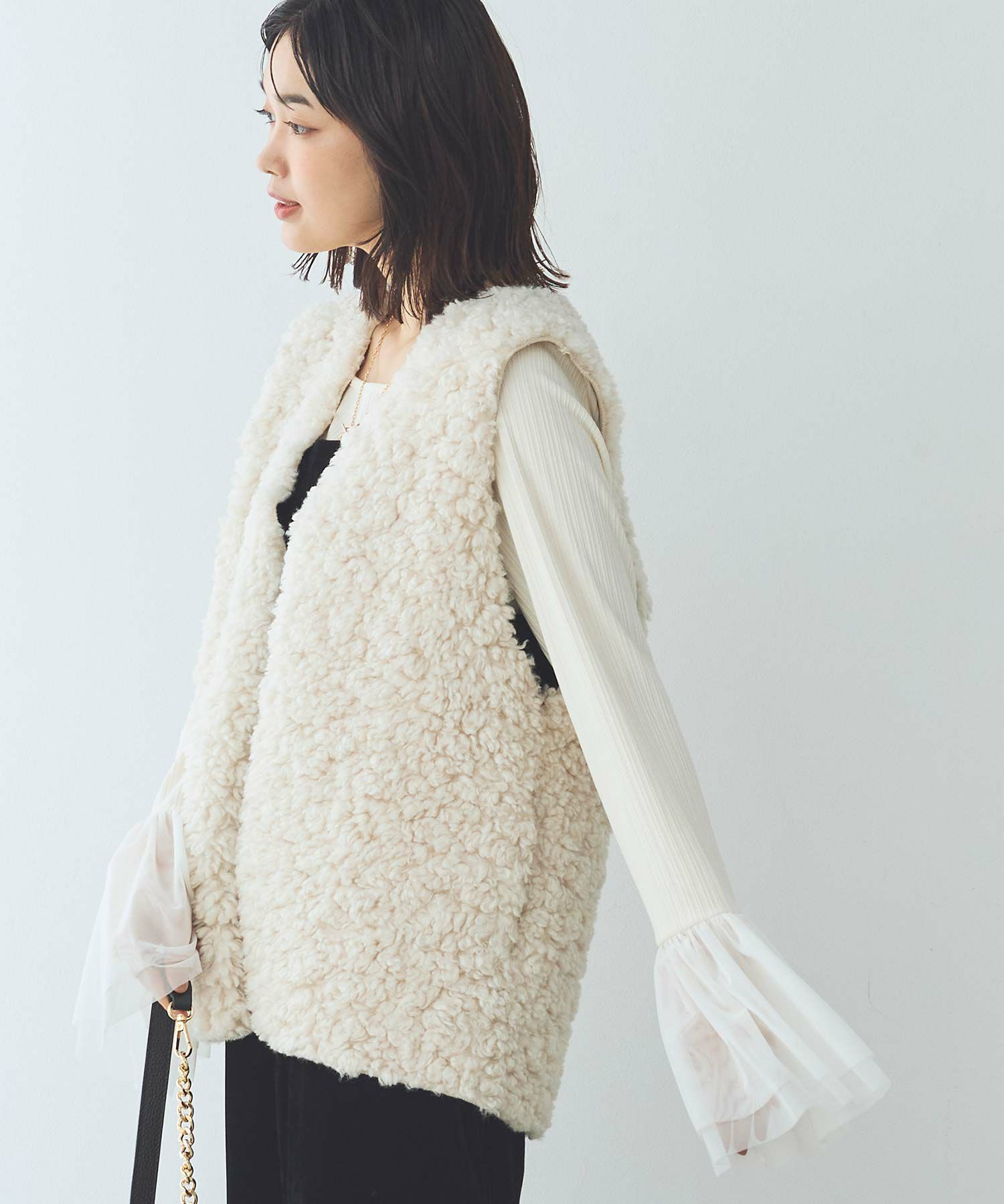 エコファーながらリアルで高級感ある素材感で、リアルなカーリーファーが洗礼された大人女子の雰囲気にマッチ。