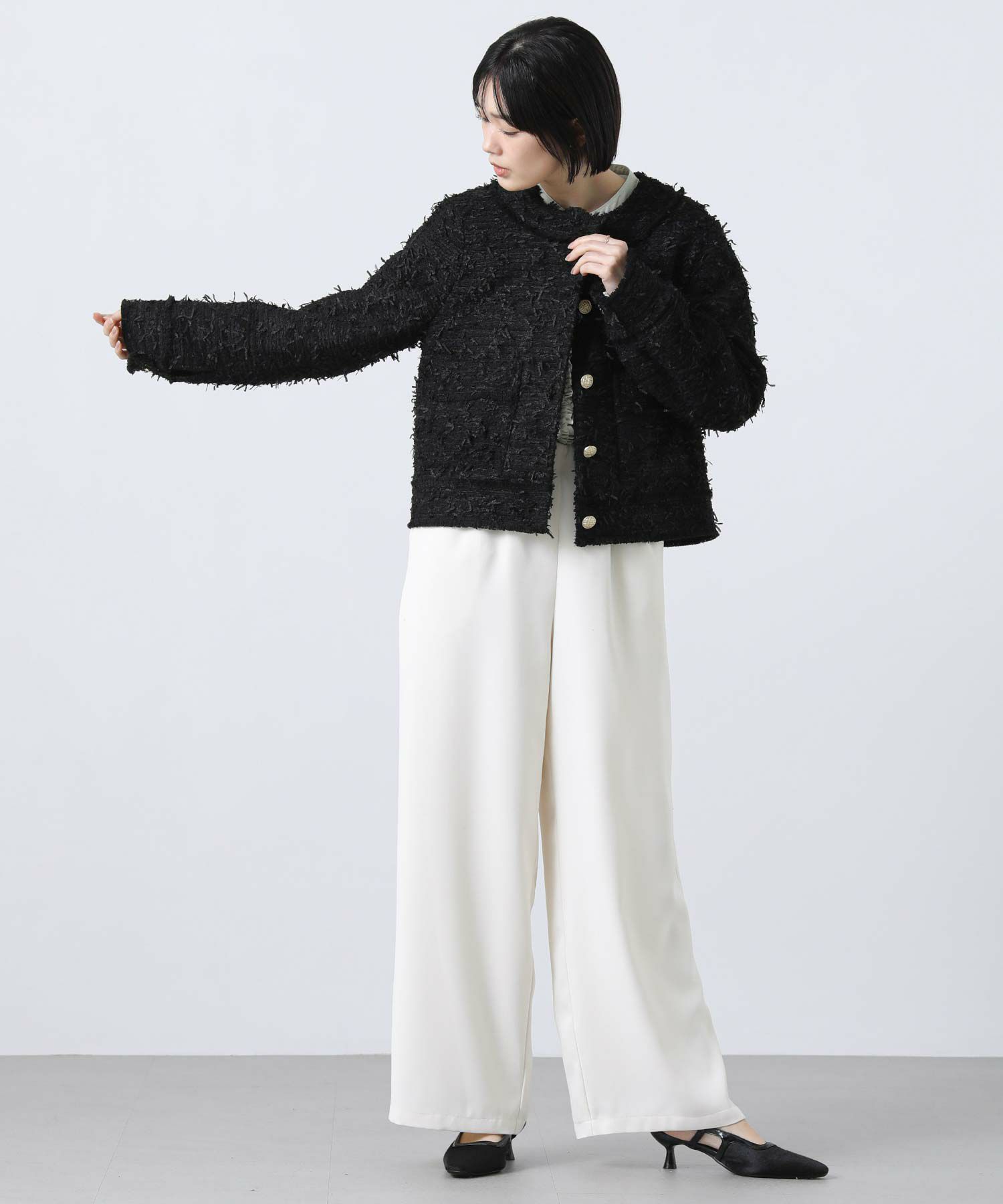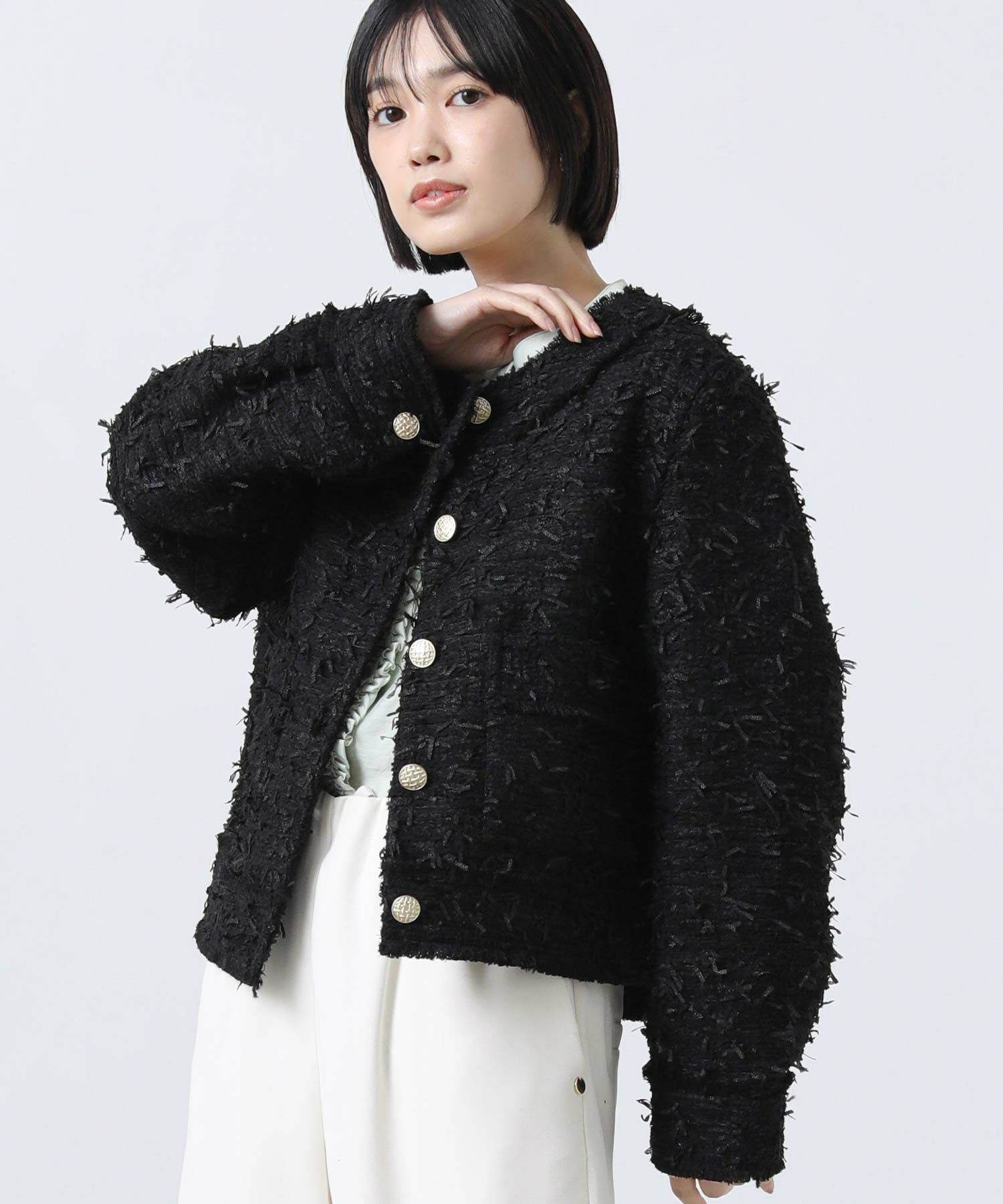 ノーカラーデザインが首元をすっきりとみせ、襟元や袖口のフリンジが華やかさを演出してくれます。