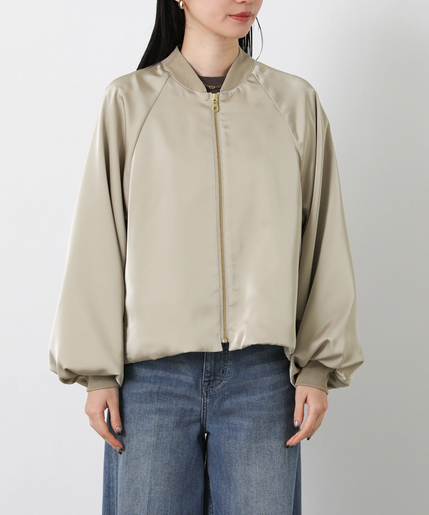 なめらかな微光沢感が美しいサテン素材を使用したブルゾン。