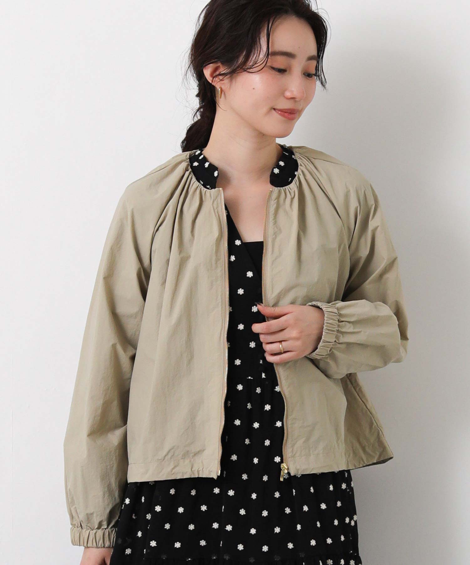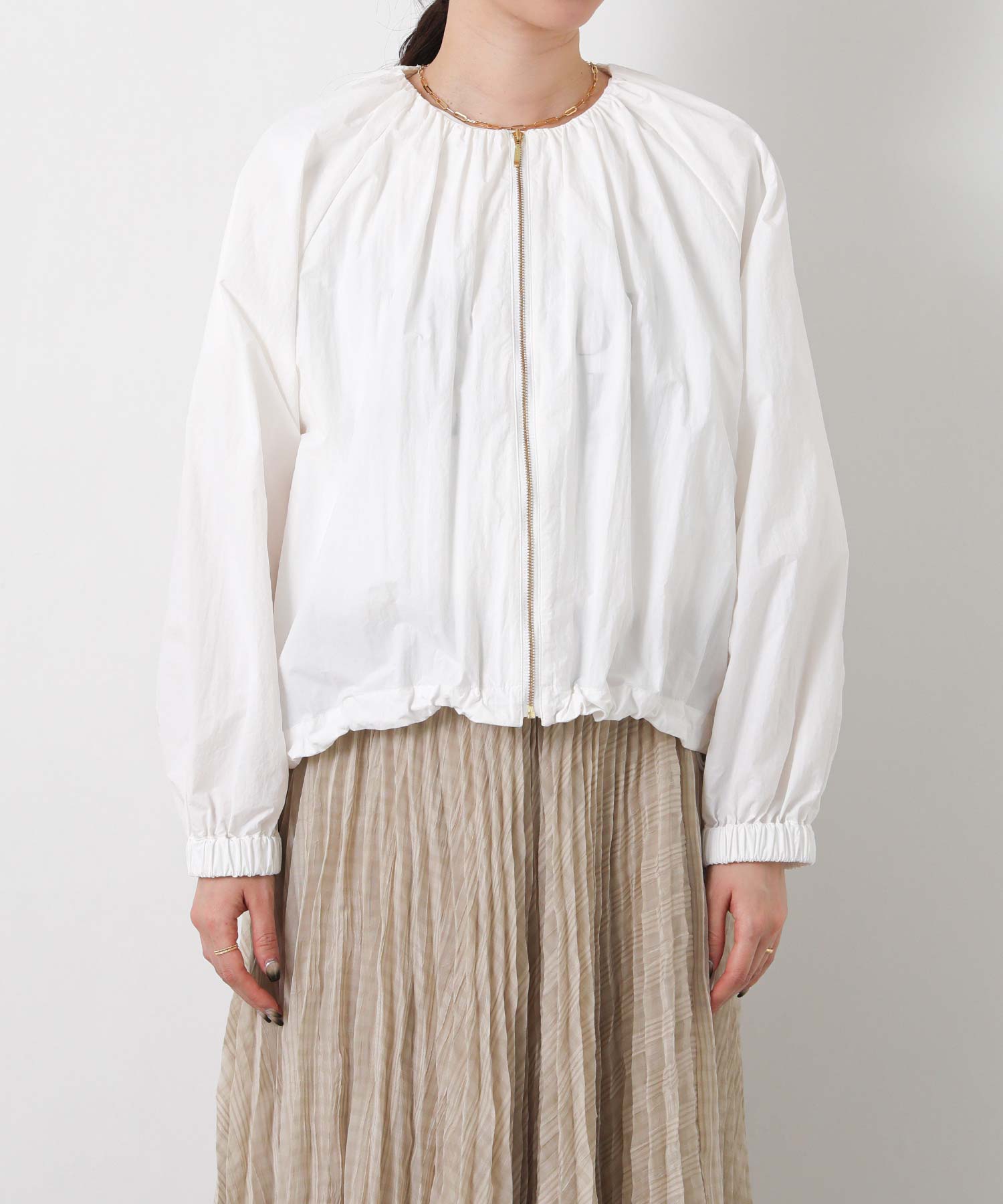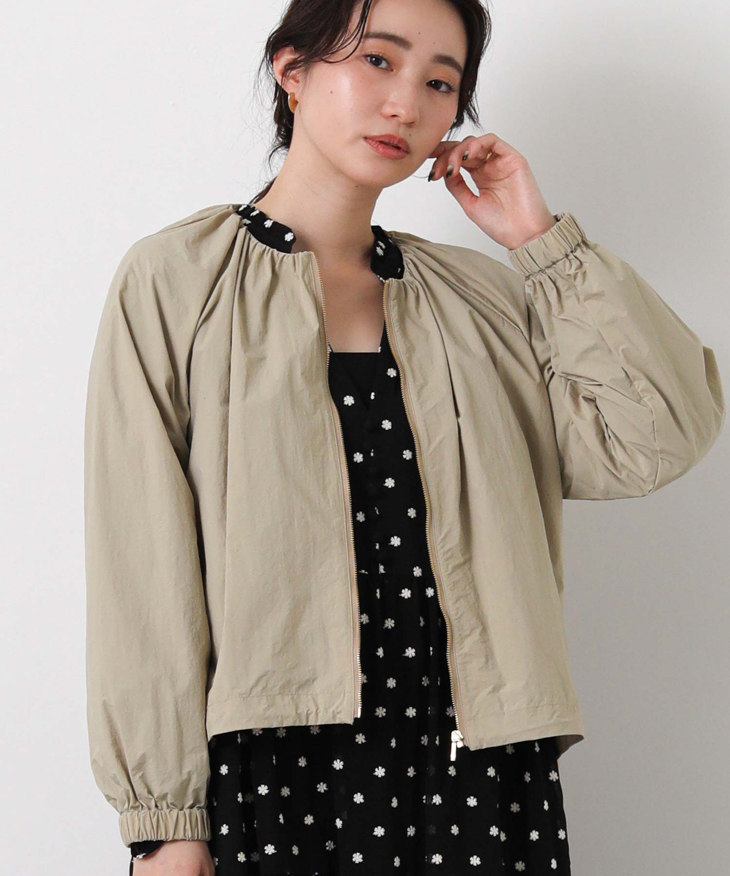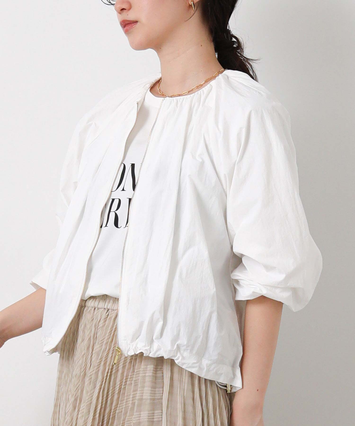 ギャザーをたっぷりと入れた丸みのあるシルエットと、コンパクトな丈感がバランスのとりやすいライトアウター。