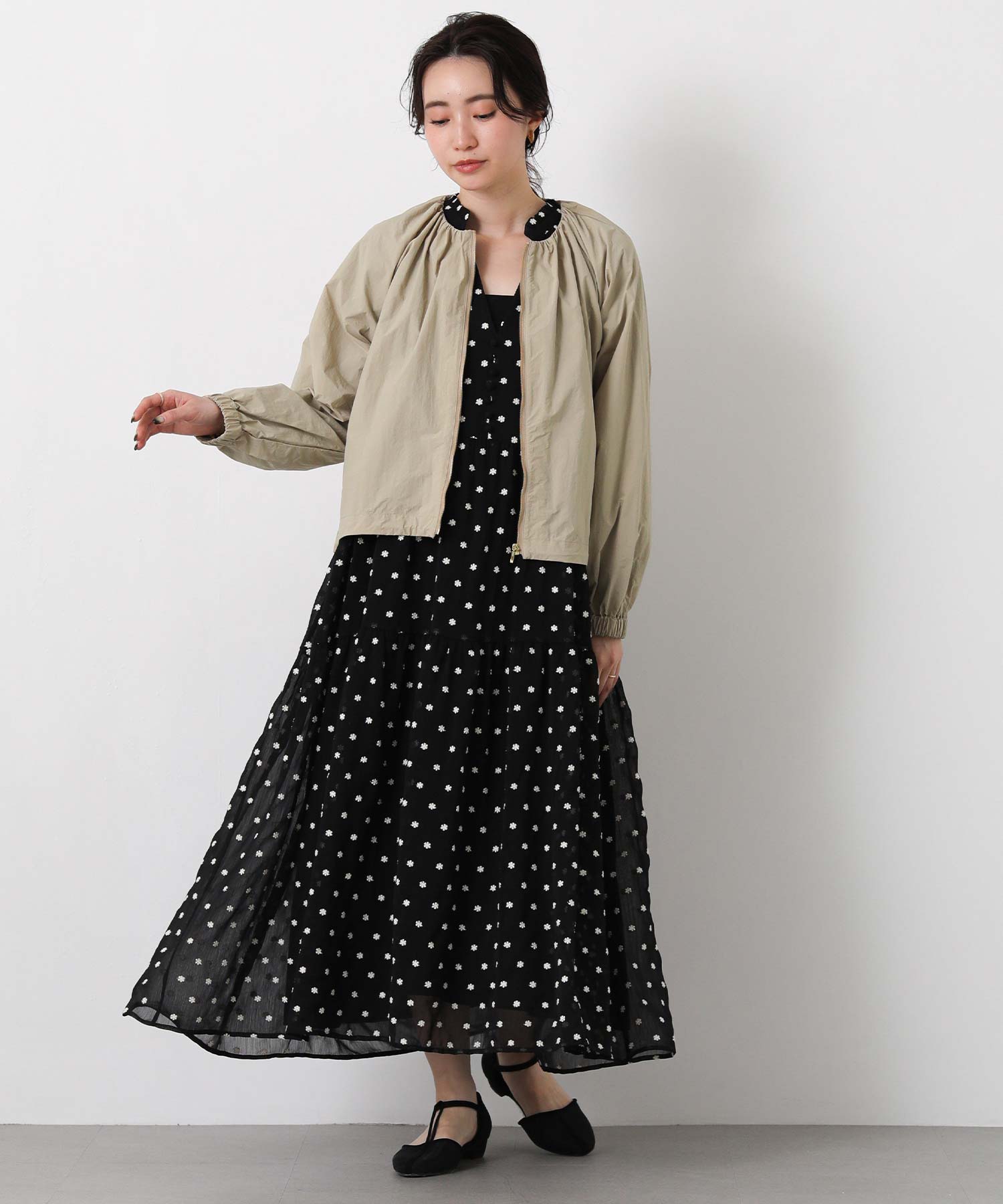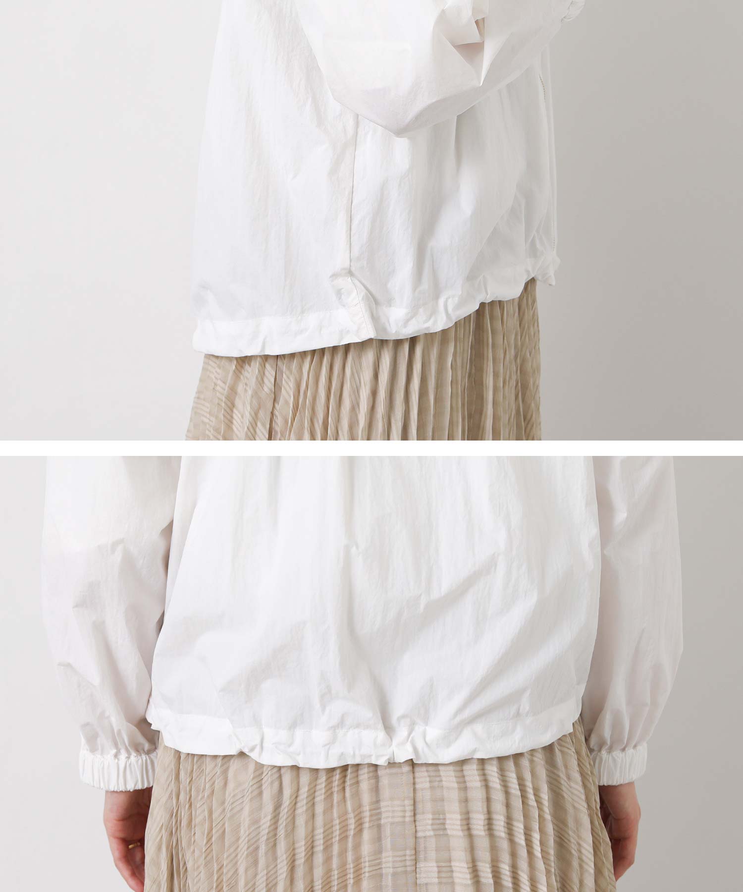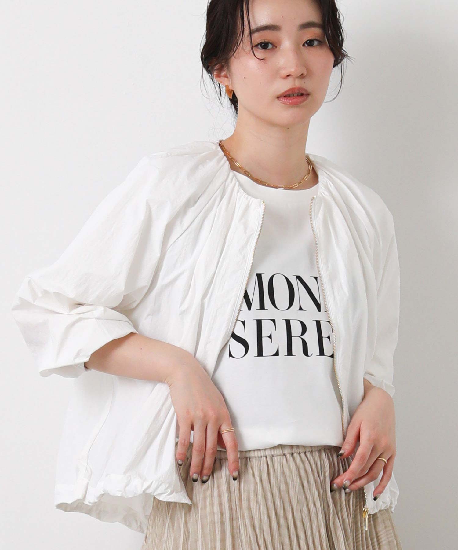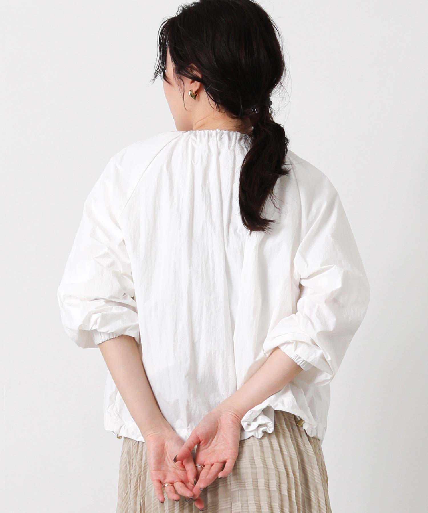 ギャザーをたっぷりと入れた丸みのあるシルエットと、コンパクトな丈感がバランスのとりやすいライトアウター。