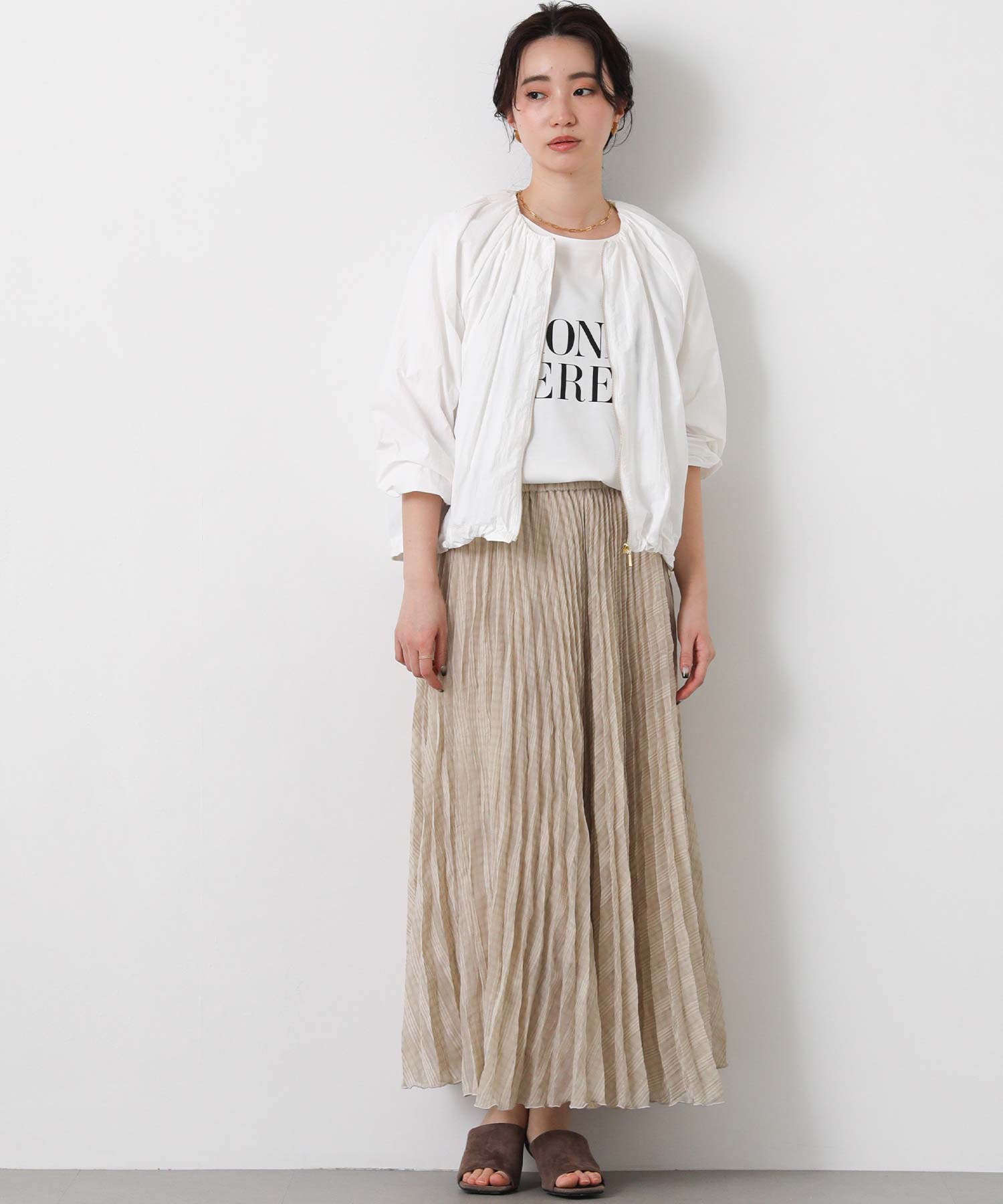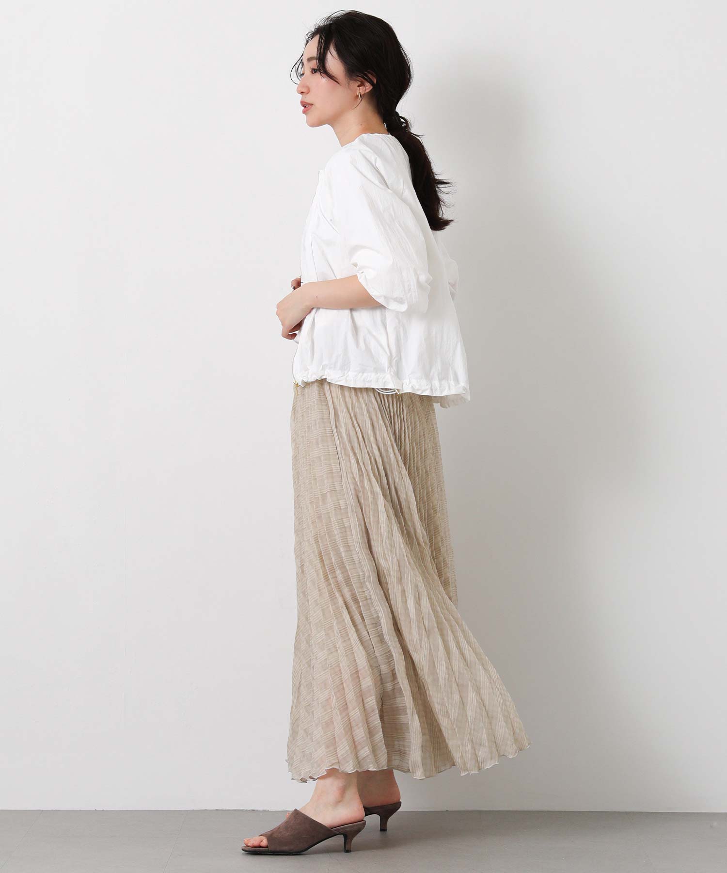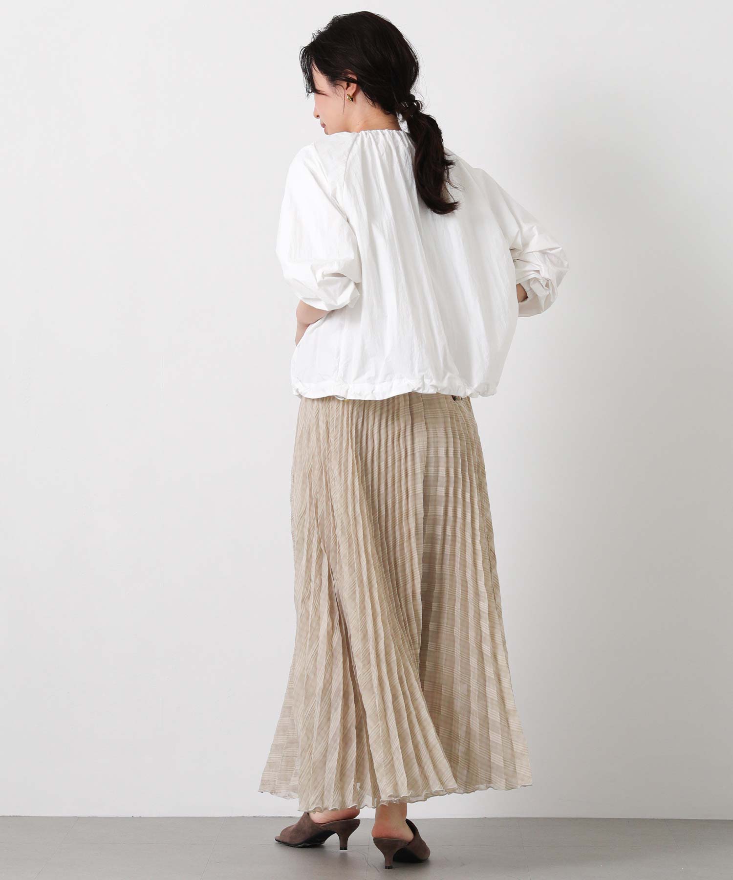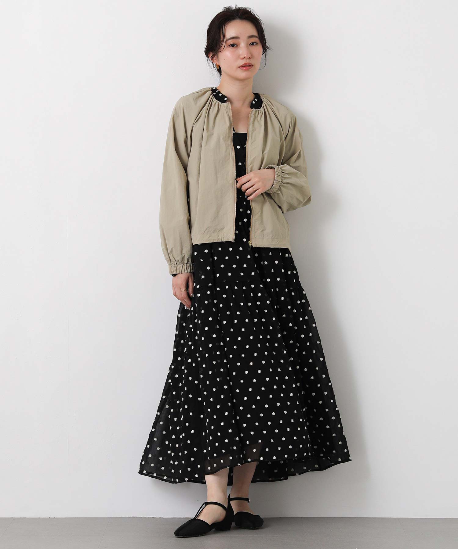 ギャザーをたっぷりと入れた丸みのあるシルエットと、コンパクトな丈感がバランスのとりやすいライトアウター。