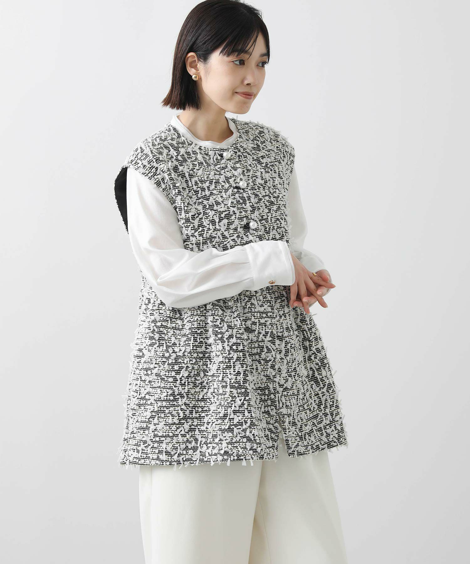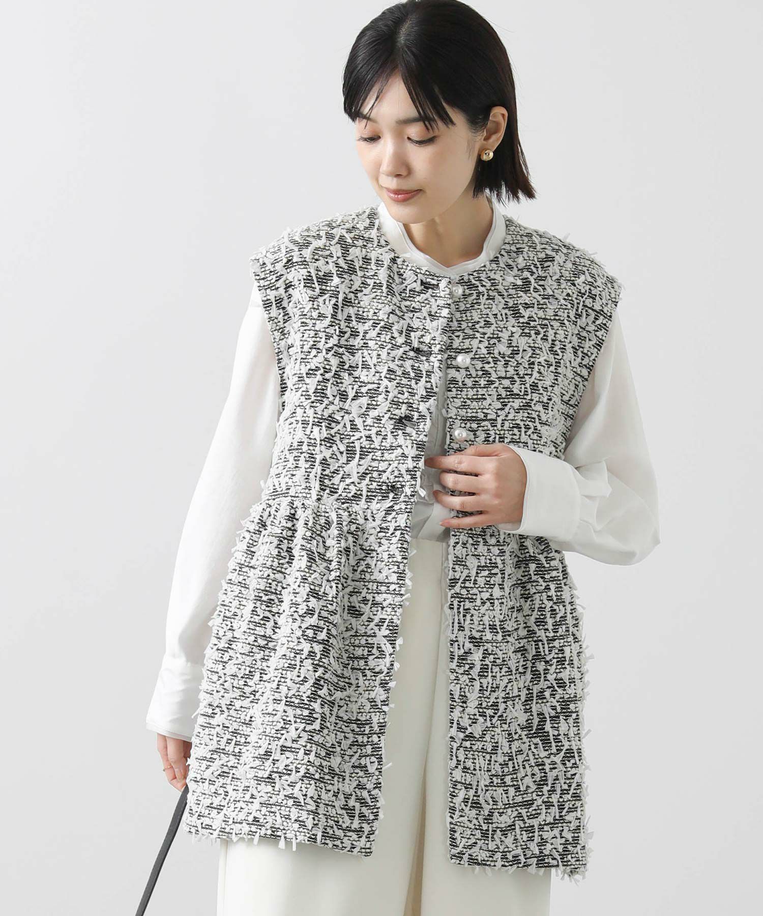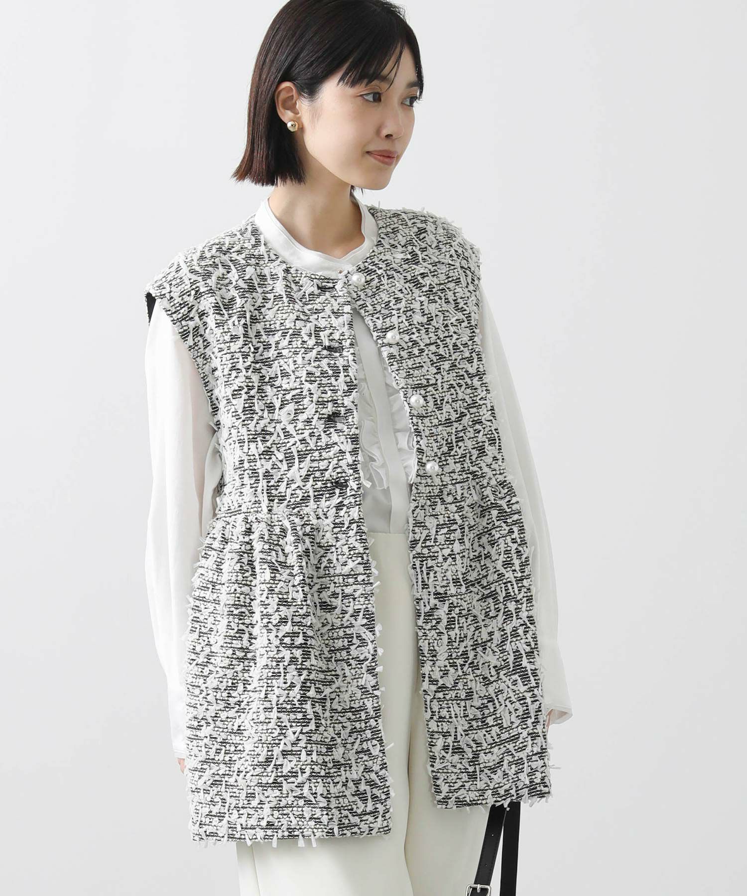 今季のLUSTEEK一押し!トレンドのリボンテープ使いがかわいいツイードベスト。オケージョンからカジュアルまで様々なシーンで着まわせて、1枚羽織るだけでパッと華やかな印象に仕上がります。