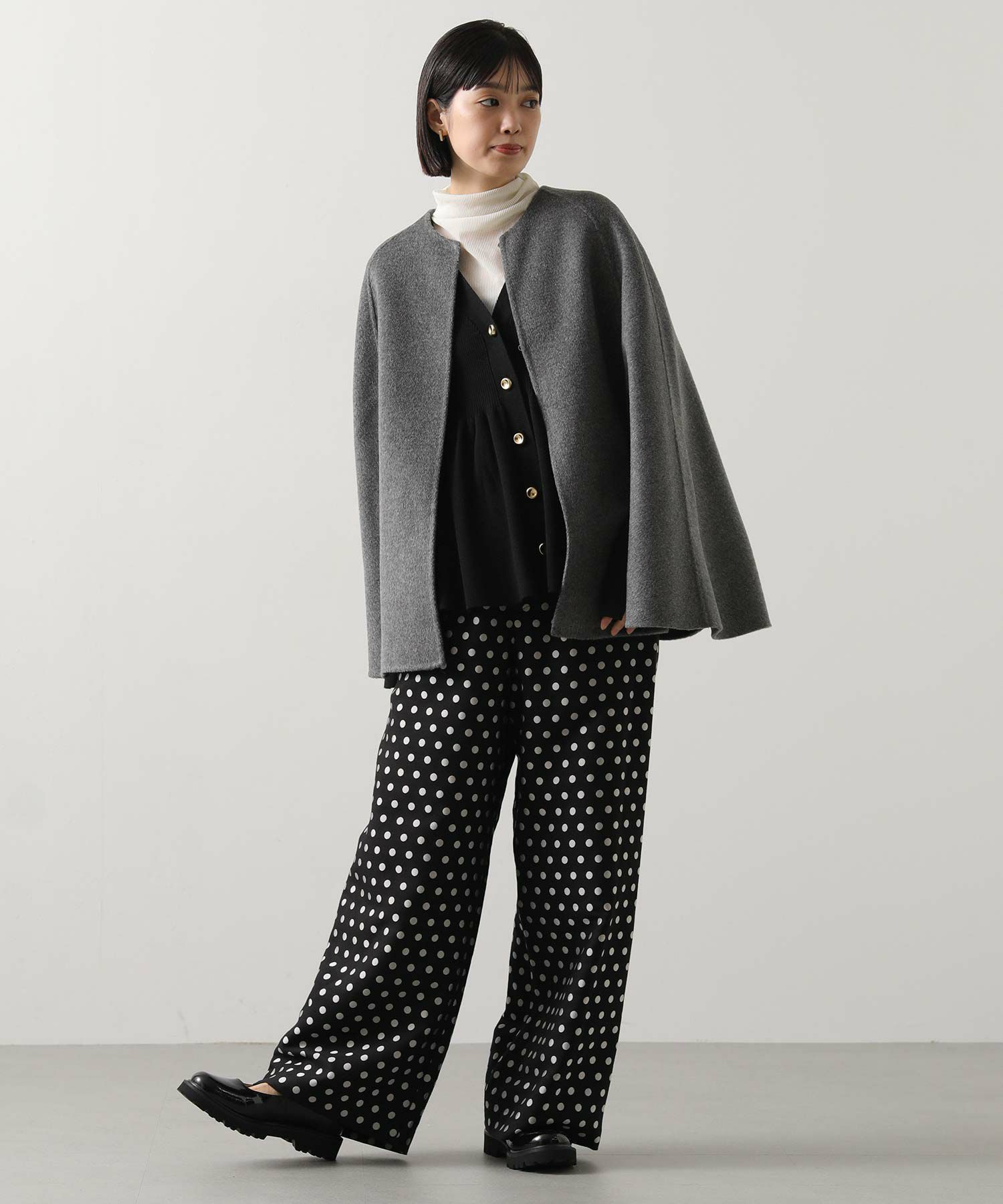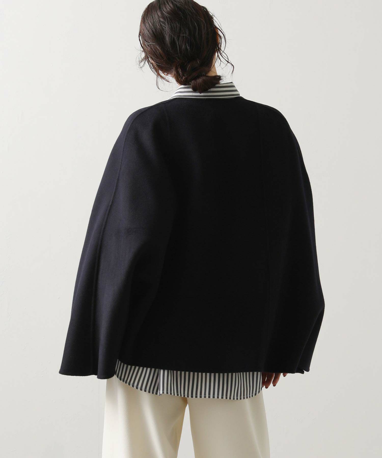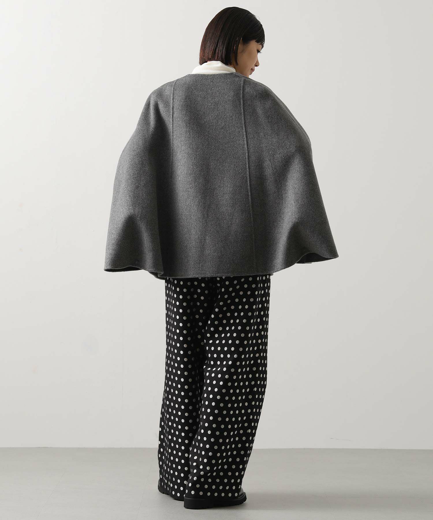 リバー仕立ての軽くて滑らかなタッチのウール素材を使用したケープ型コート。