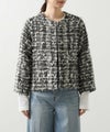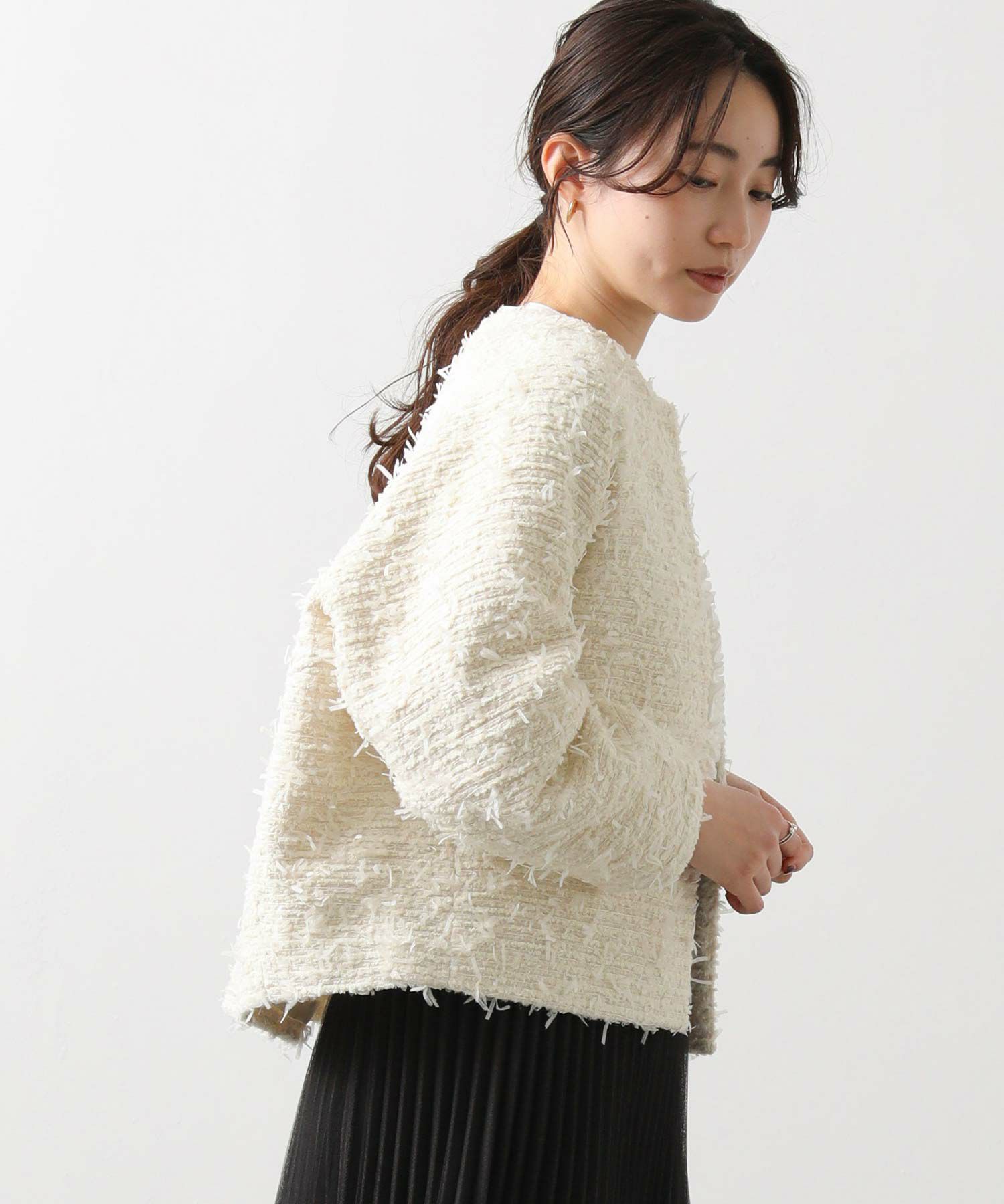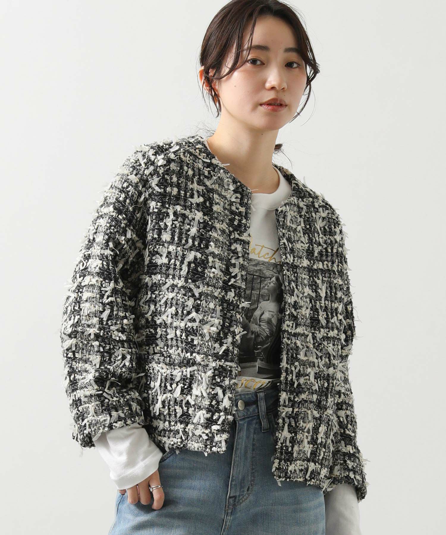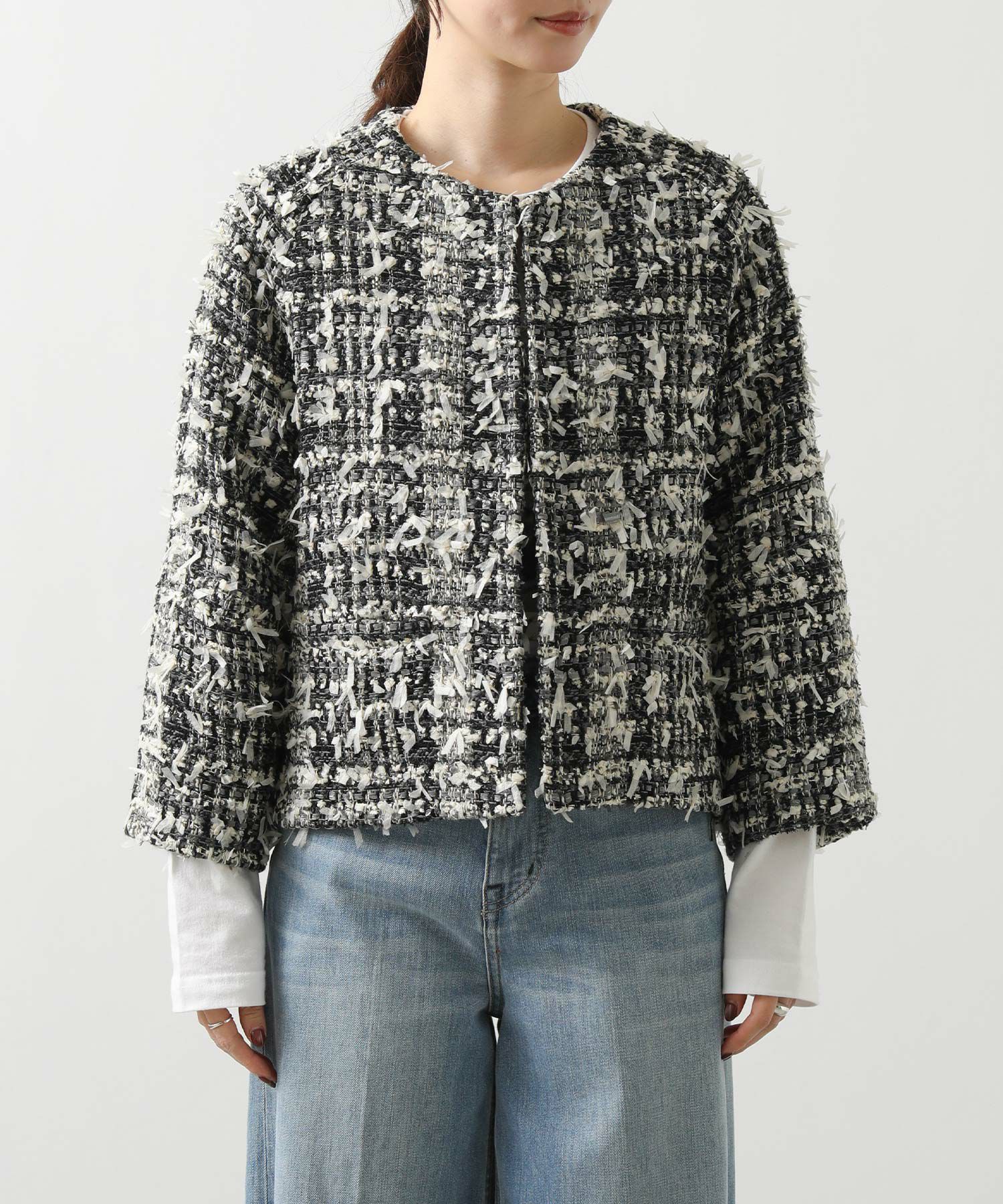 ツイードジャケット特有のカチッとした着難さをなくした、ラグランスリーブと丸みのあるシルエット、身幅もゆったりしているので窮屈感なく柔らかい印象で着用できます。