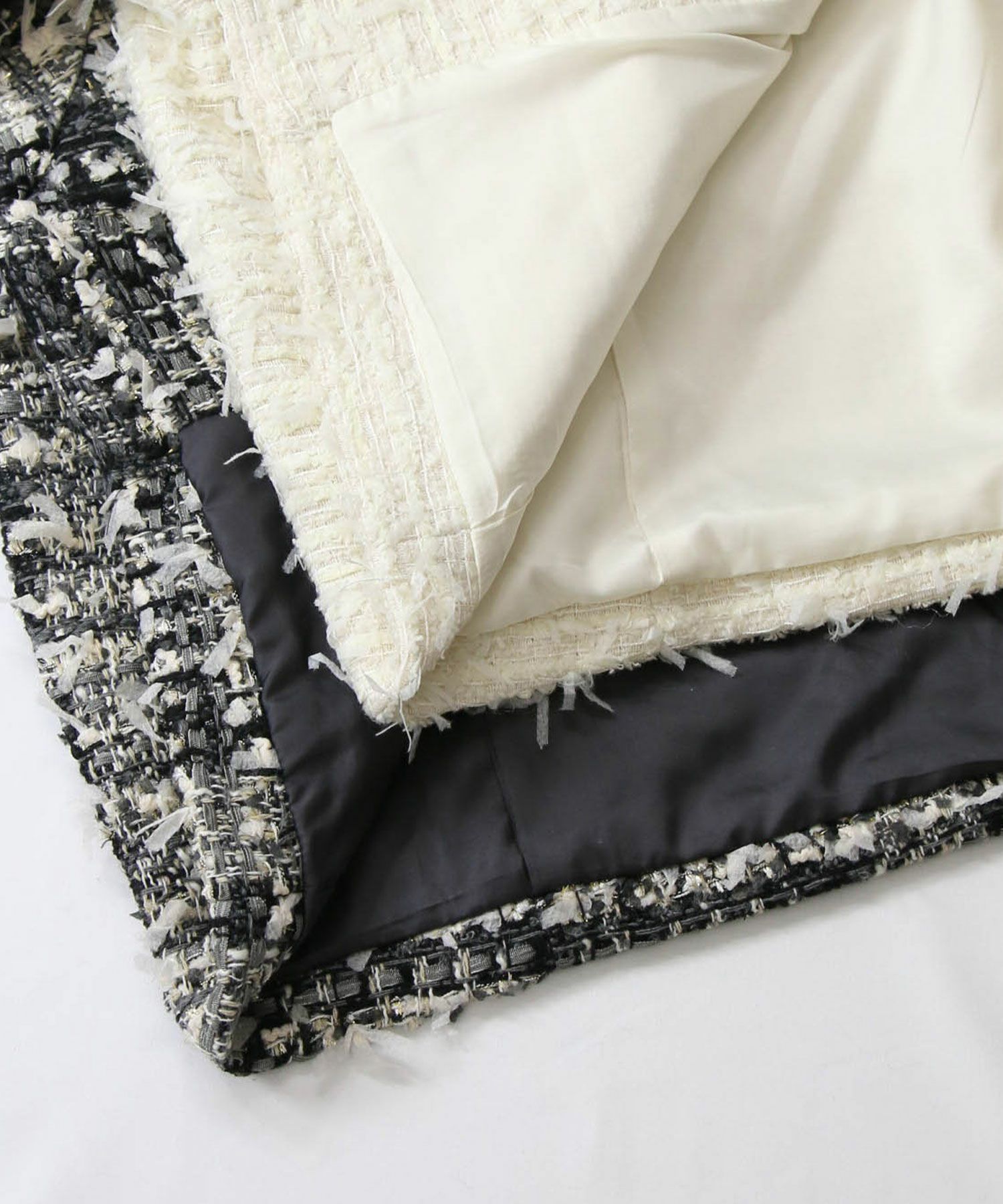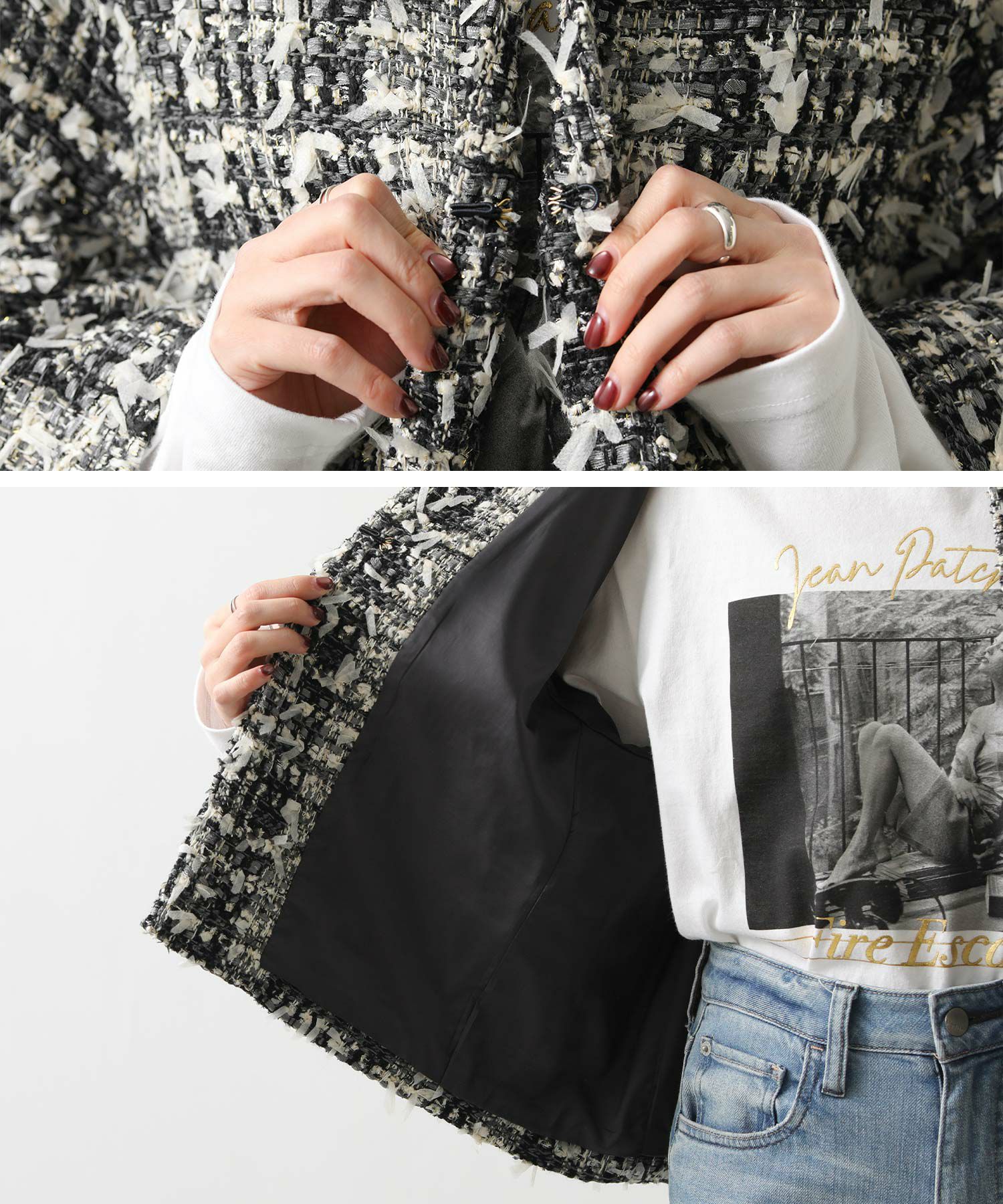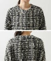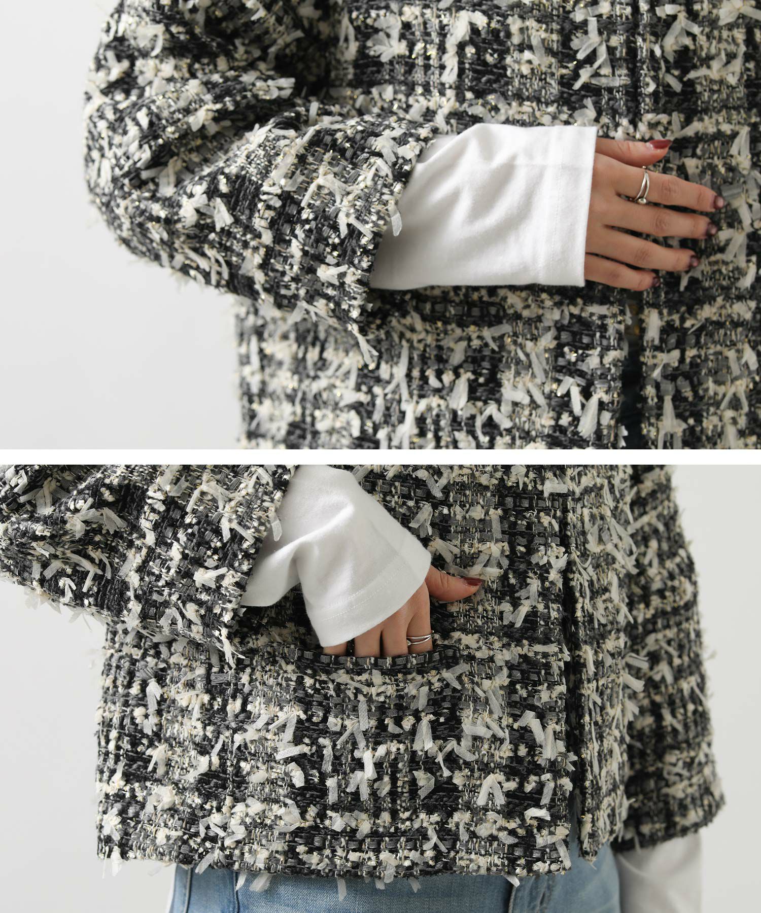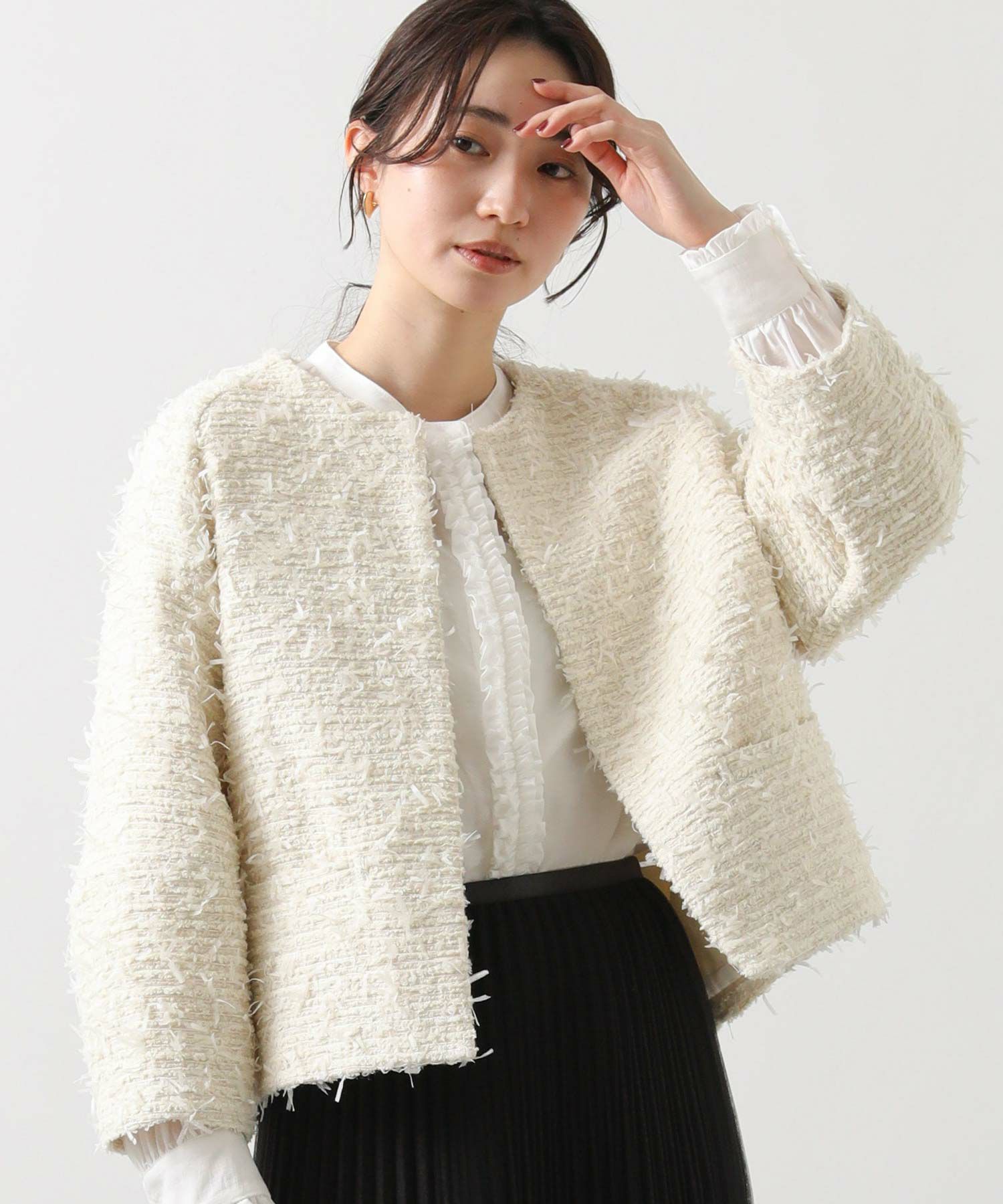 ツイードジャケット特有のカチッとした着難さをなくした、ラグランスリーブと丸みのあるシルエット、身幅もゆったりしているので窮屈感なく柔らかい印象で着用できます。